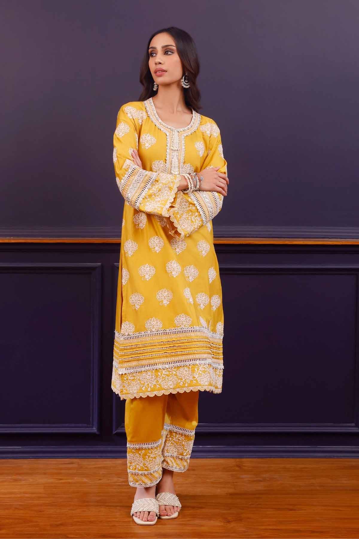 A sunshine favourite — the reha kurta set in mustard is crafted in luxurious pima satin for a smooth, airy feel. The straight silhouette features floral motifs and tonal embroidery, balanced by tailored pants.