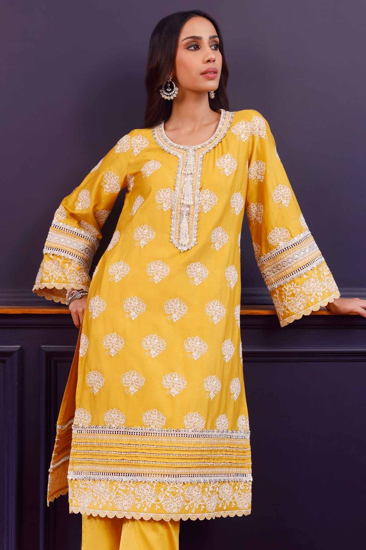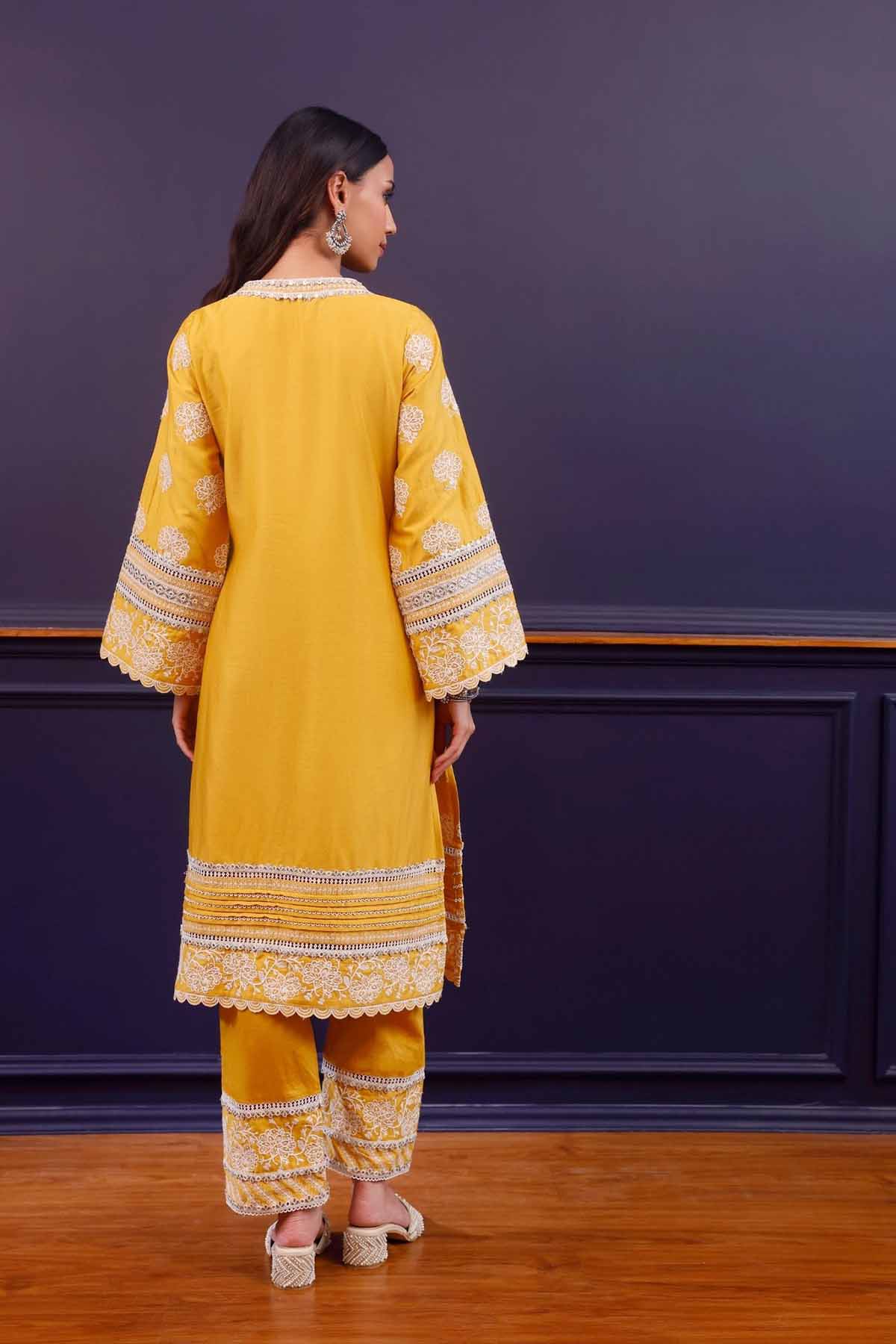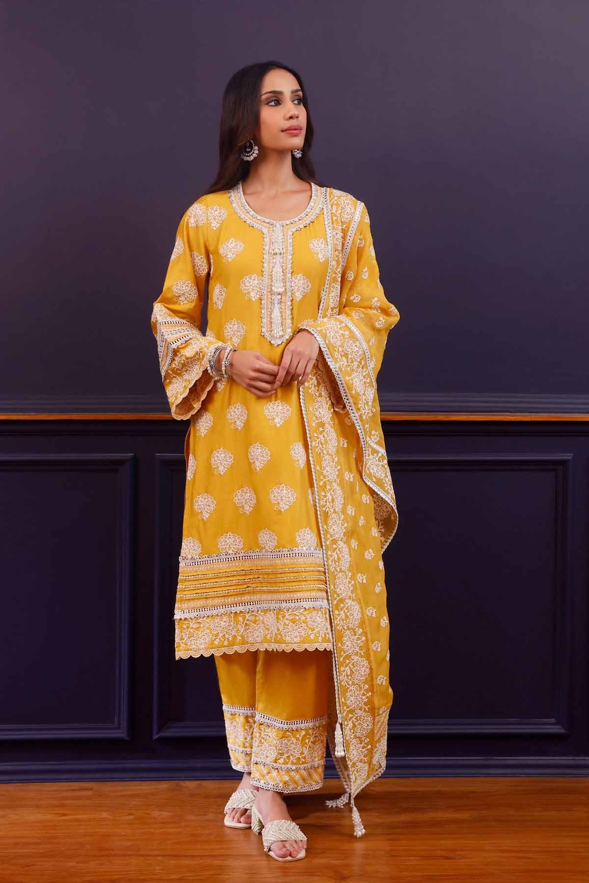 A sunshine favourite — the reha kurta set in mustard is crafted in luxurious pima satin for a smooth, airy feel. The straight silhouette features floral motifs and tonal embroidery, balanced by tailored pants. A sheer organza dupatta with intricate lace edges completes the ensemble, perfect for daytime festivities and casual elegance.