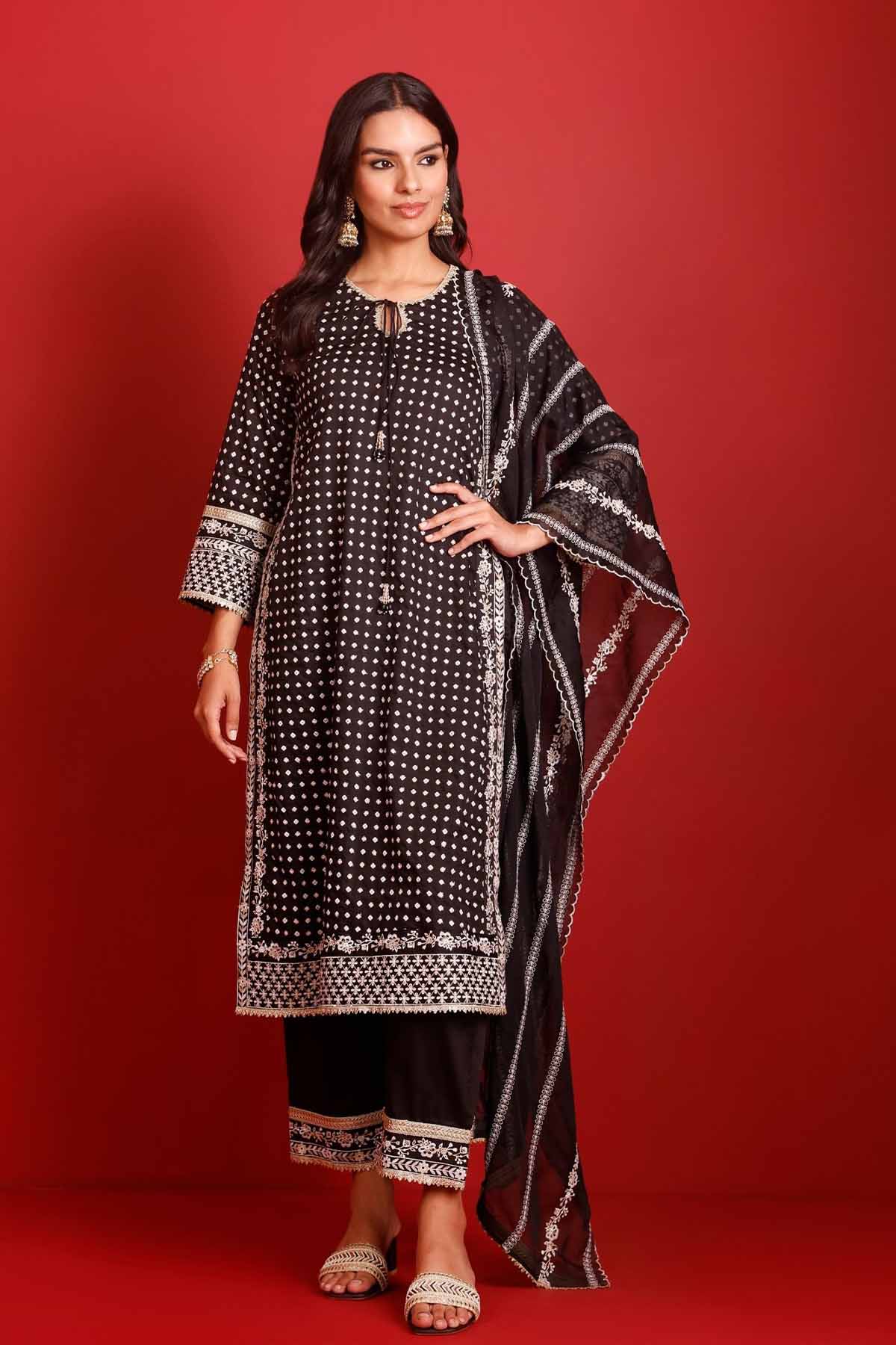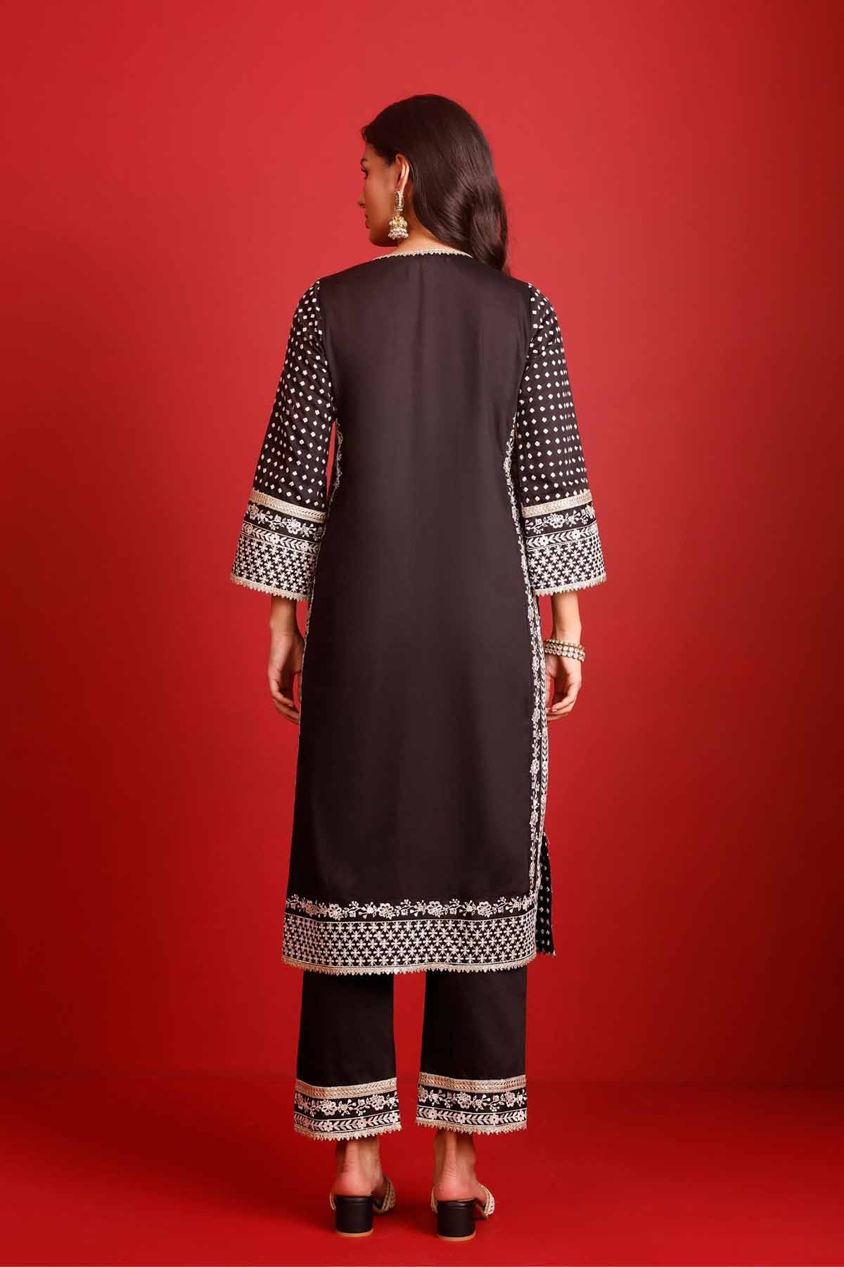 Chic and timeless, the reya kurta set in black is crafted from soft pima satin that lends an elegant fall. The kurta features intricate embroidery with tonal highlights, paired with matching pants and a coordinated organza dupatta edged in lace. Sophisticated yet effortless, it’s a festive classic made for evenings that demand quiet glamour.