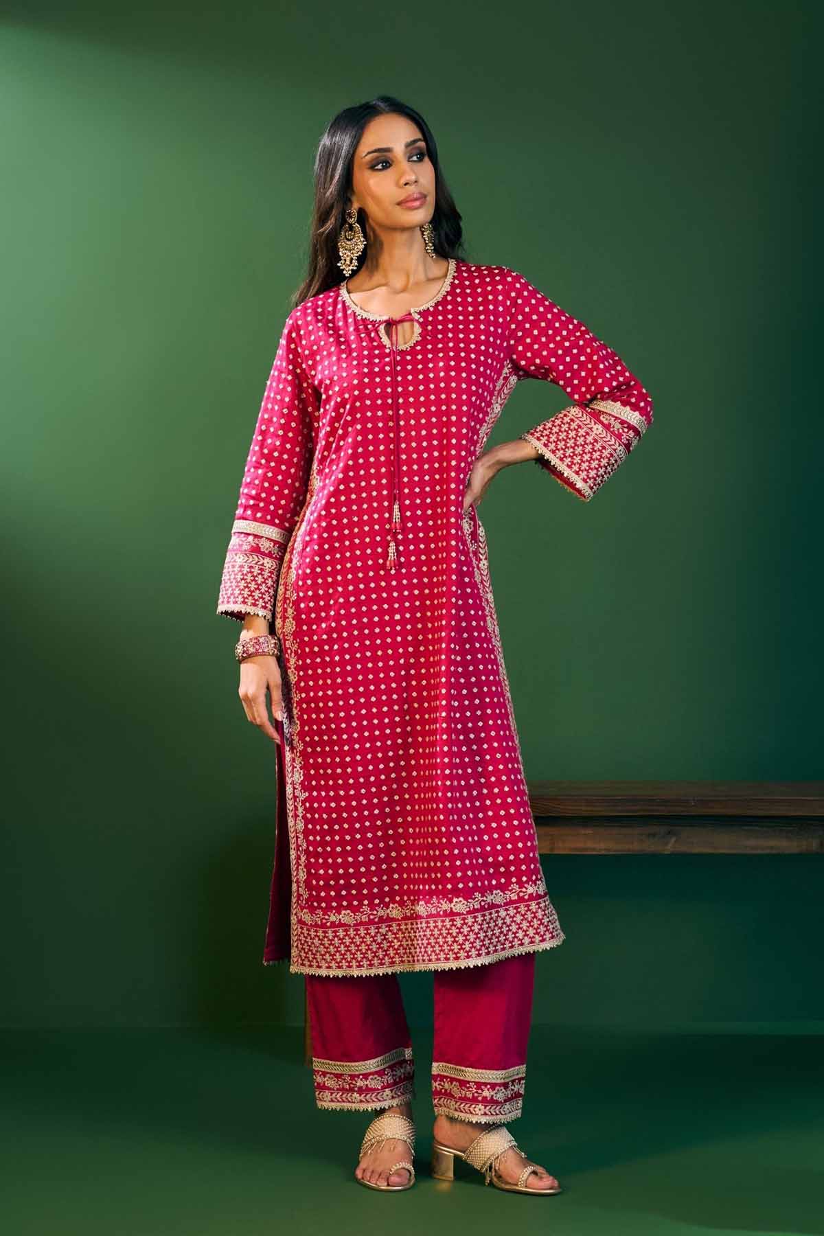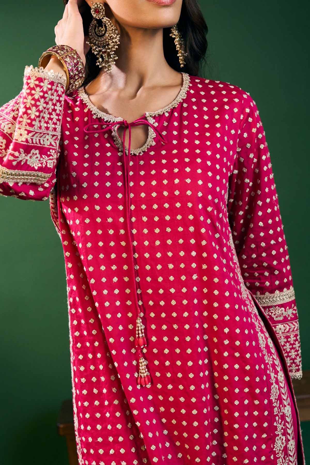 Vibrant yet graceful, the reya kurta set in fuschia is designed to stand out. The rich pima satin fabric drapes beautifully, while the detailed embroidery and lacework add a festive touch.