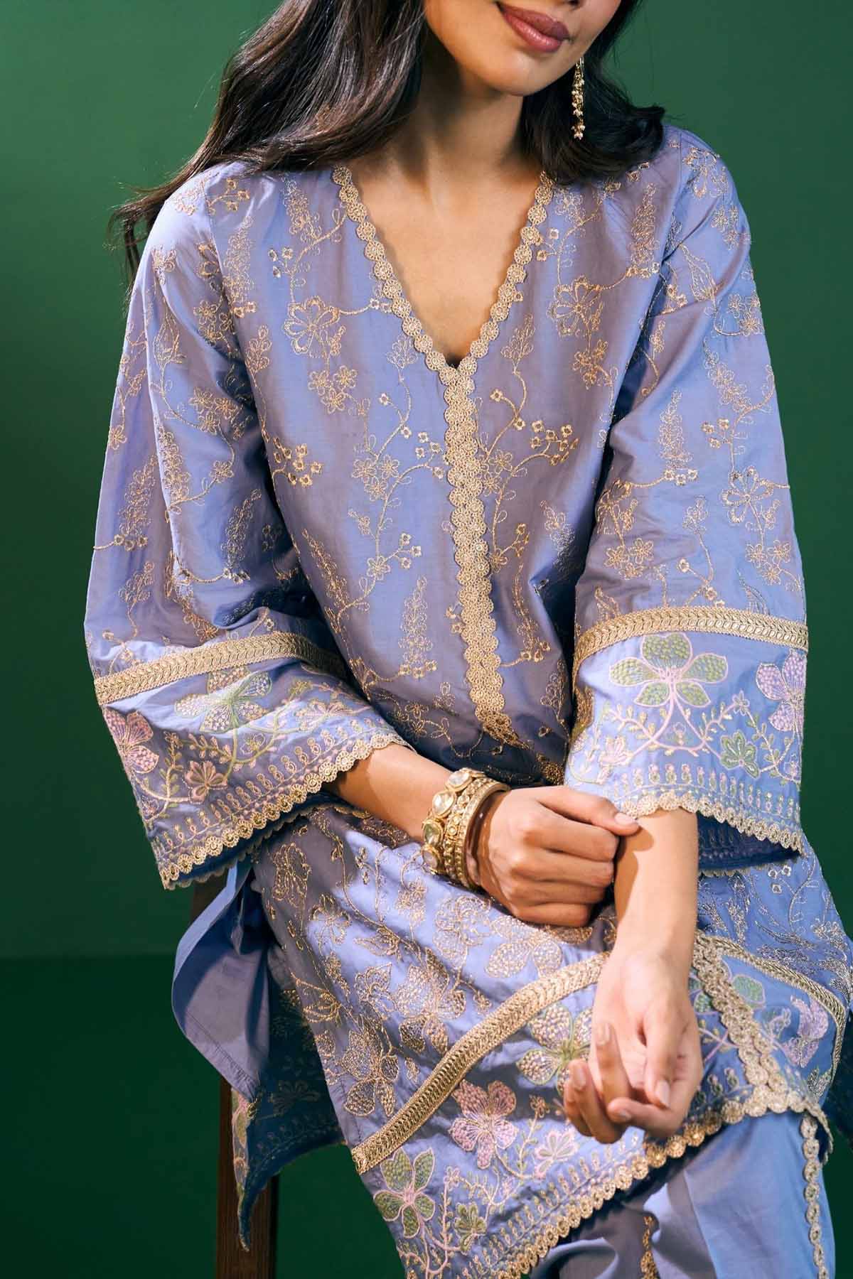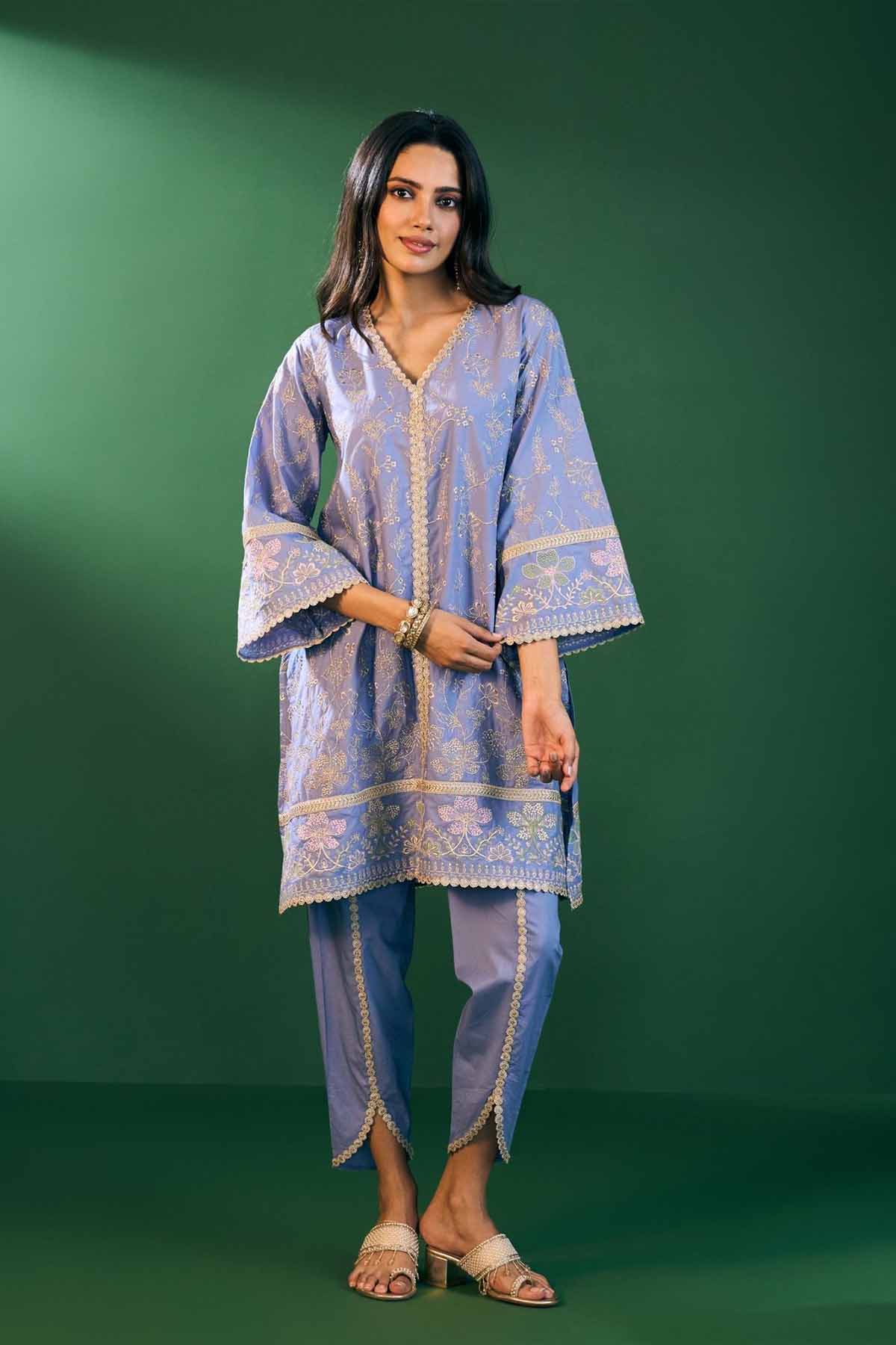 The rina kurta set in steel blue is a refreshing addition to your festive wardrobe. Made from soft cotton, it features delicate embroidery along the neckline and hem, lending a subtle charm to the straight silhouette. Coordinated cotton pants.