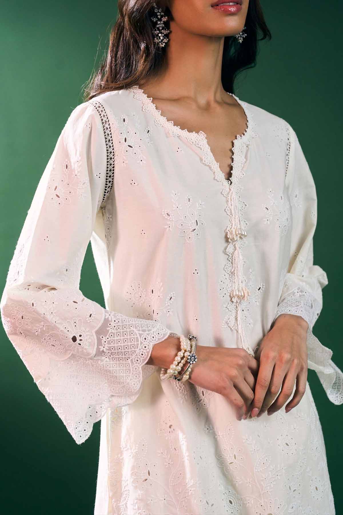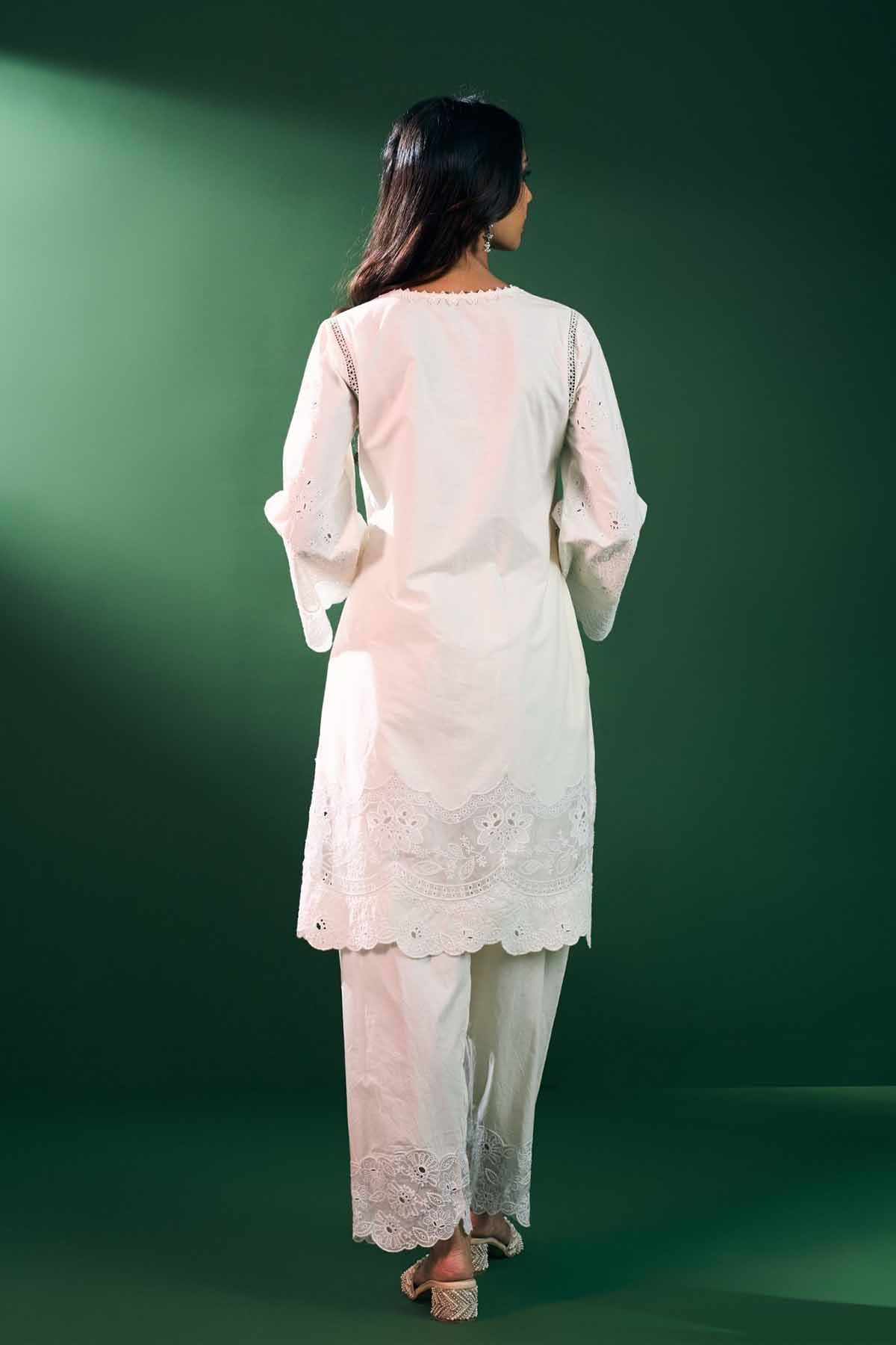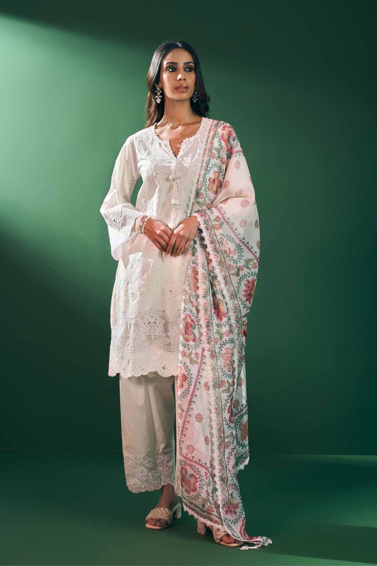 Classic and serene, the riva kurta set in off white is a study in understated charm. Made from breathable cotton, the kurta is accentuated with tonal embroidery and fine lace trims. The coordinated pants and organza printed dupatta add a light, graceful finish — perfect for intimate festivities and day functions..