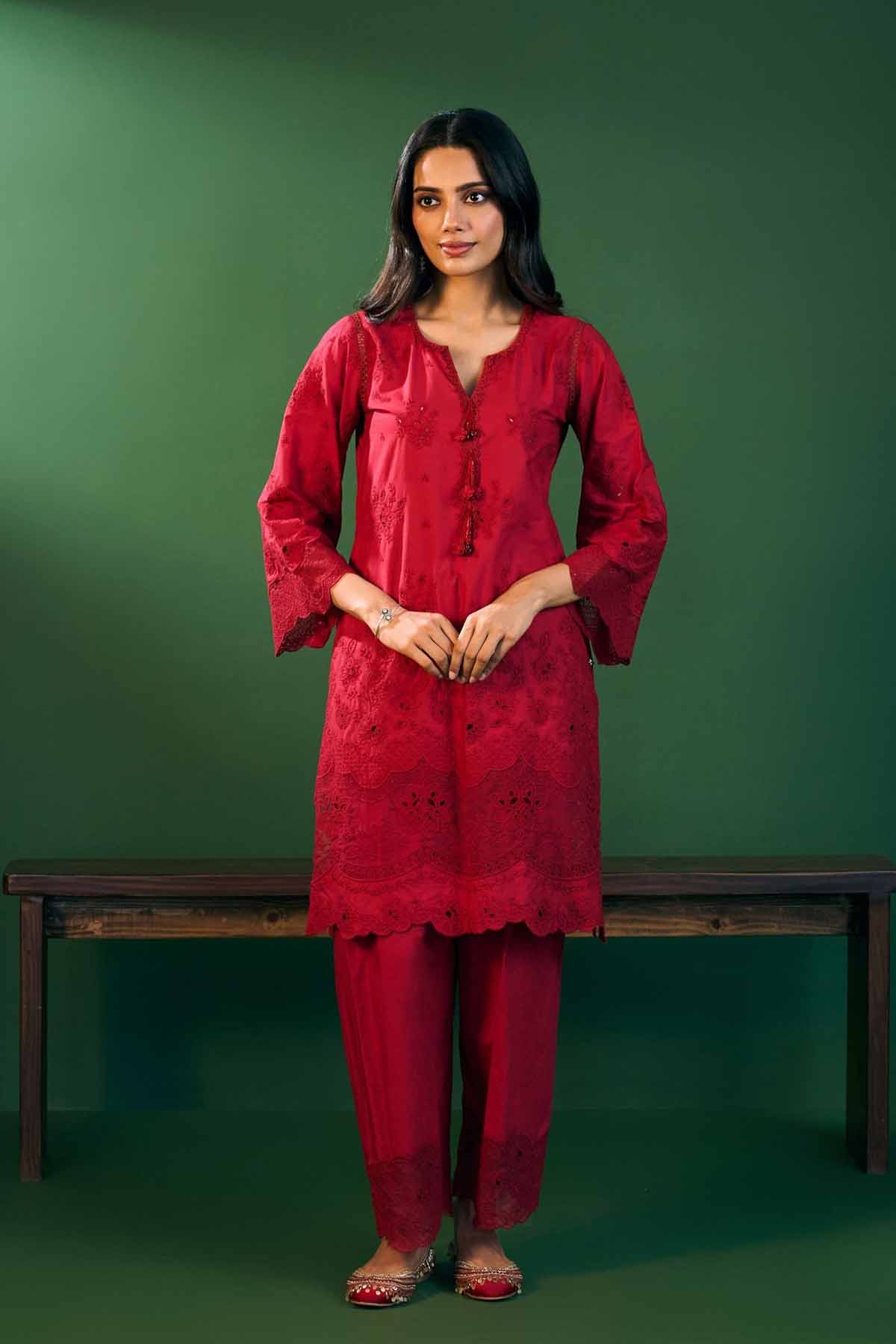 Mulmul Riva Cotton Red Kurta Set indian designer wear online shopping melange singapore