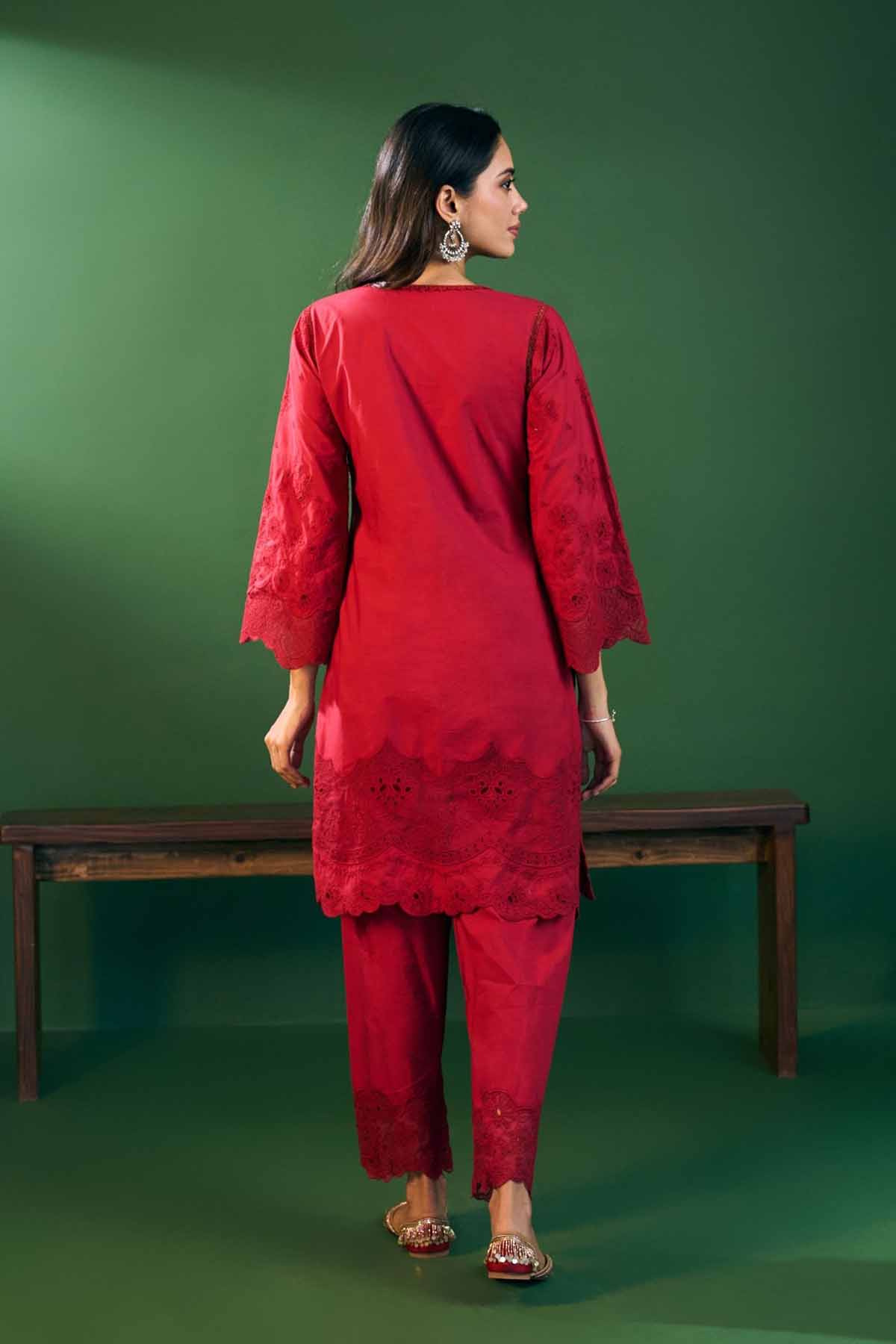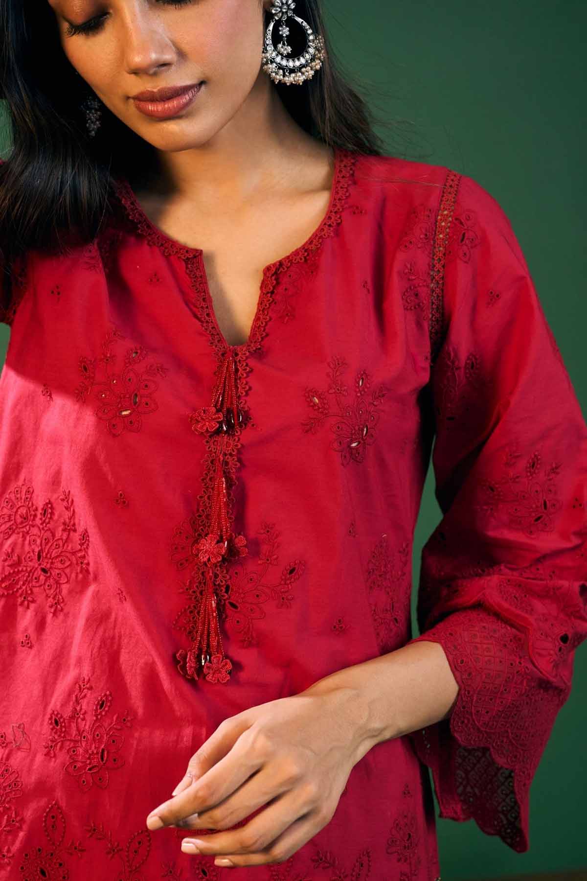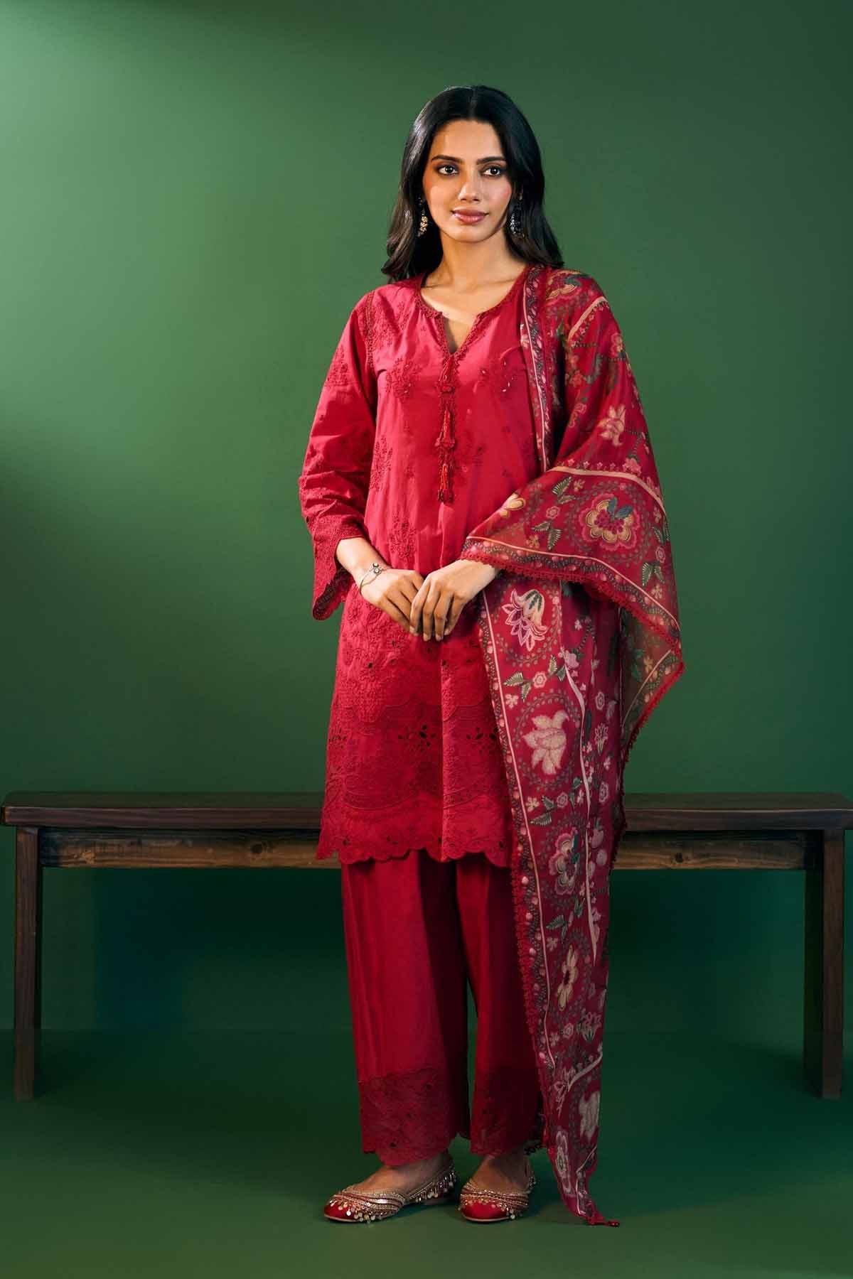 Vibrant and captivating, the riva kurta set in red is a celebration of festive elegance. Crafted from luxurious supima cotton, the kurta showcases intricate tonal embroidery and delicate lace accents that add depth and dimension. Paired with coordinated pants for a polished silhouette, the set is completed with an organza printed dupatta featuring refined detailing — perfect for making a statement at celebrations and special gatherings.