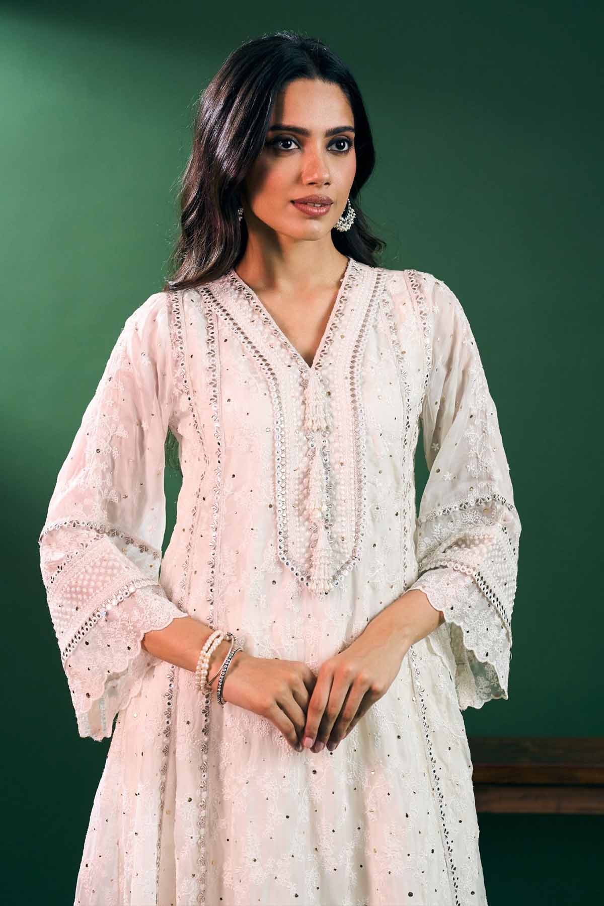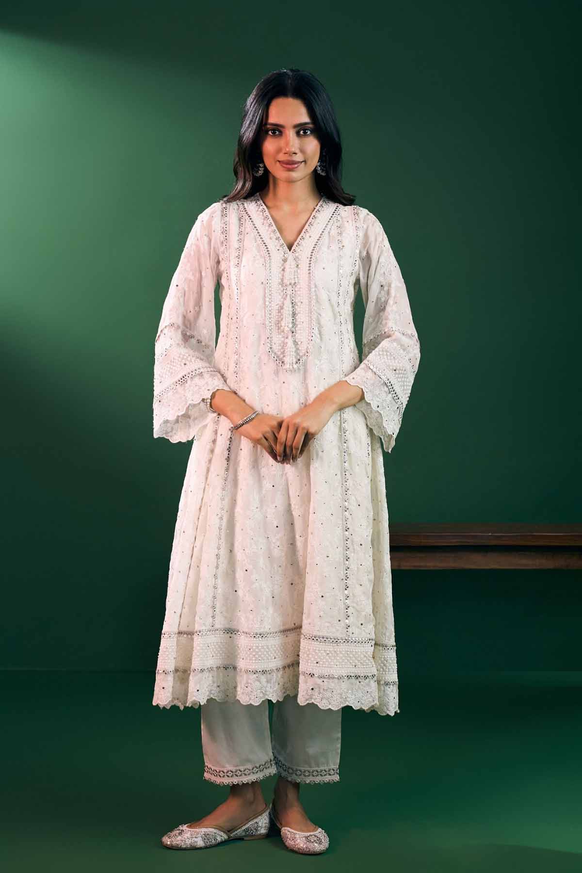 The rupa anarkali set in off white radiates timeless grace. The organza kurta features fine embroidery and lace detailing that highlight its flared silhouette. Worn with pima satin pants, it's the perfect pick for serene festivities and elegant day celebrations.
