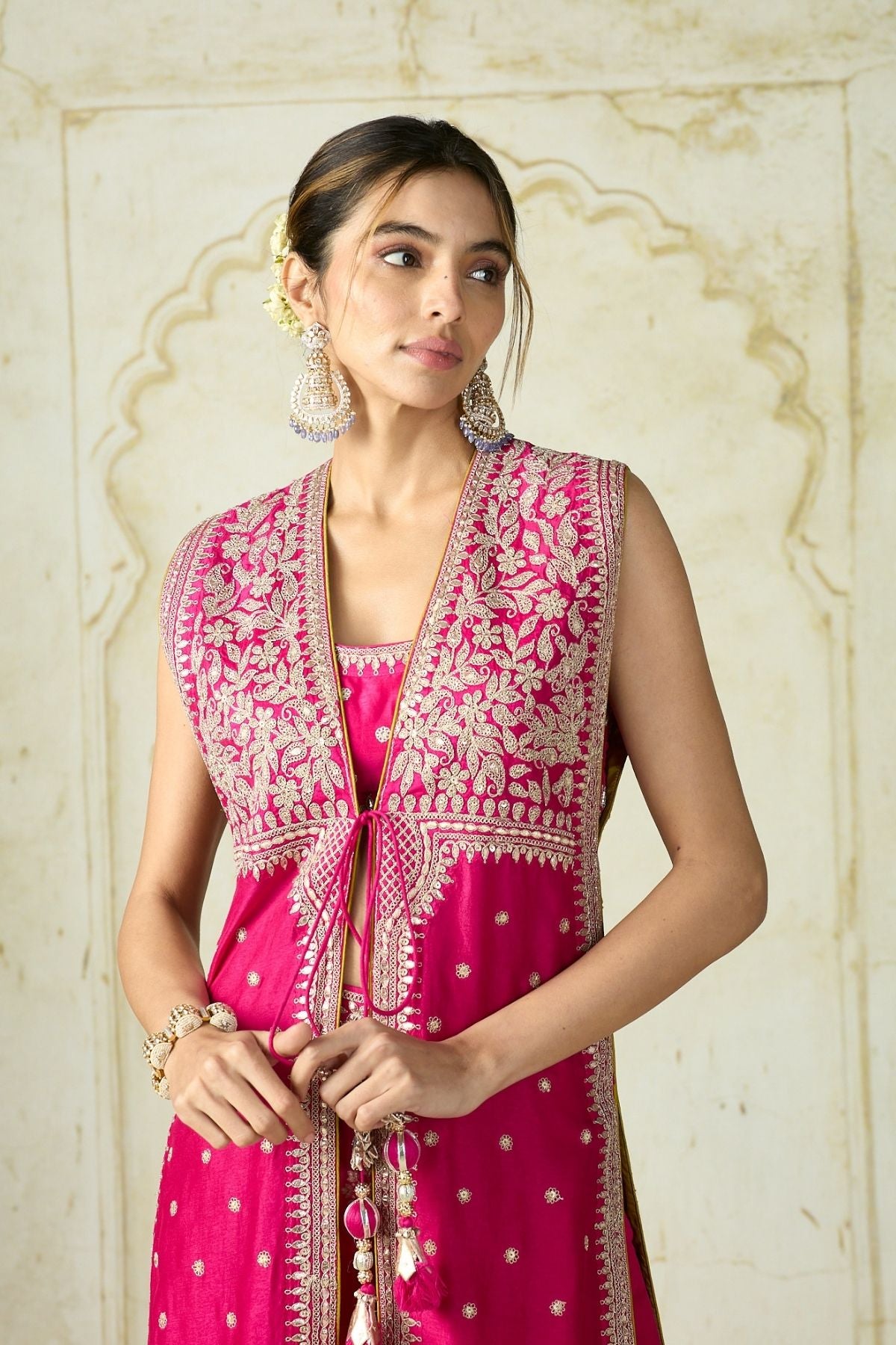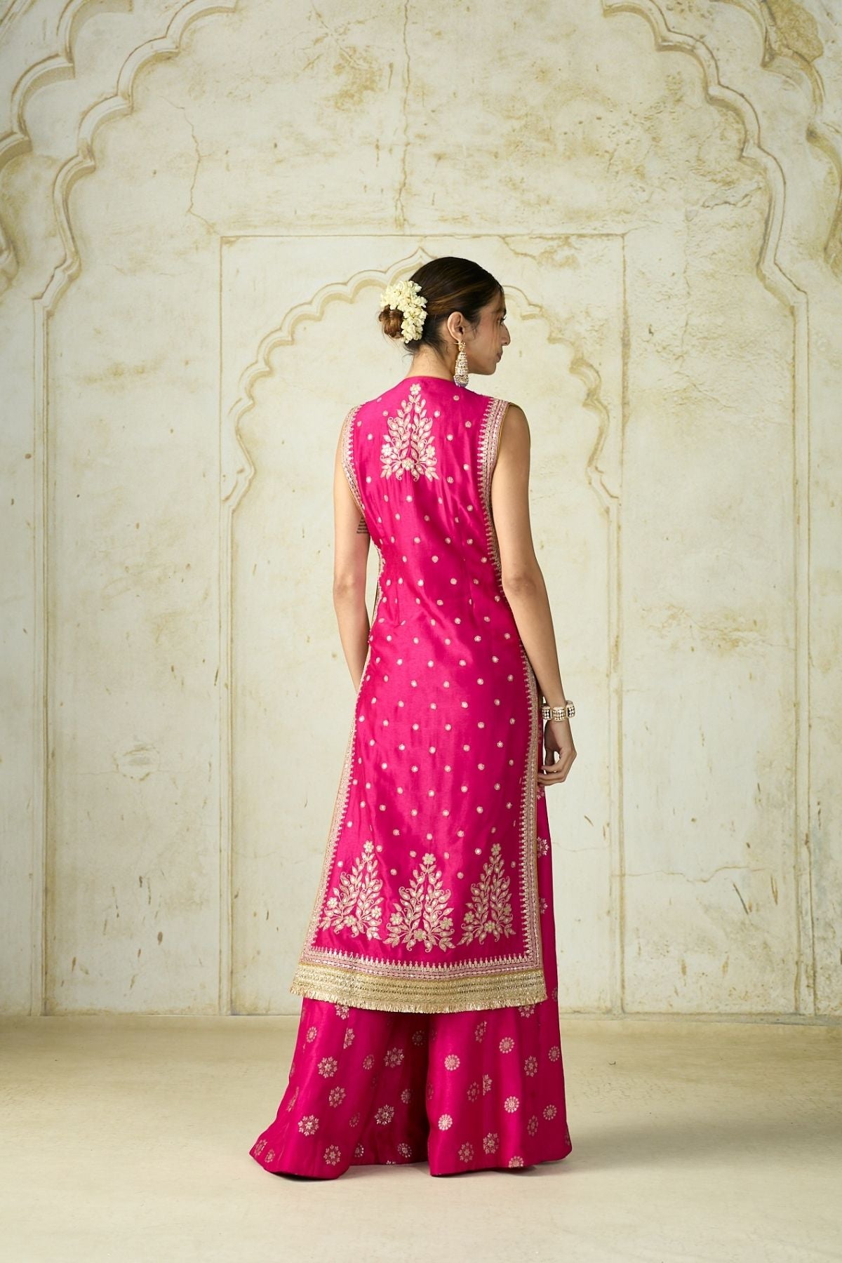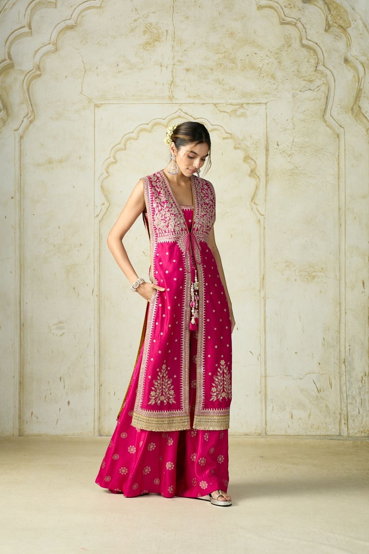 Featuring a sleeveless long jacket-style kurta richly adorned with intricate embroidery, delicate motifs, and a tasseled tie-up at the front. The kurta is paired with matching wide-legged pants, decorated with scattered designs that add a graceful flow to the outfit.