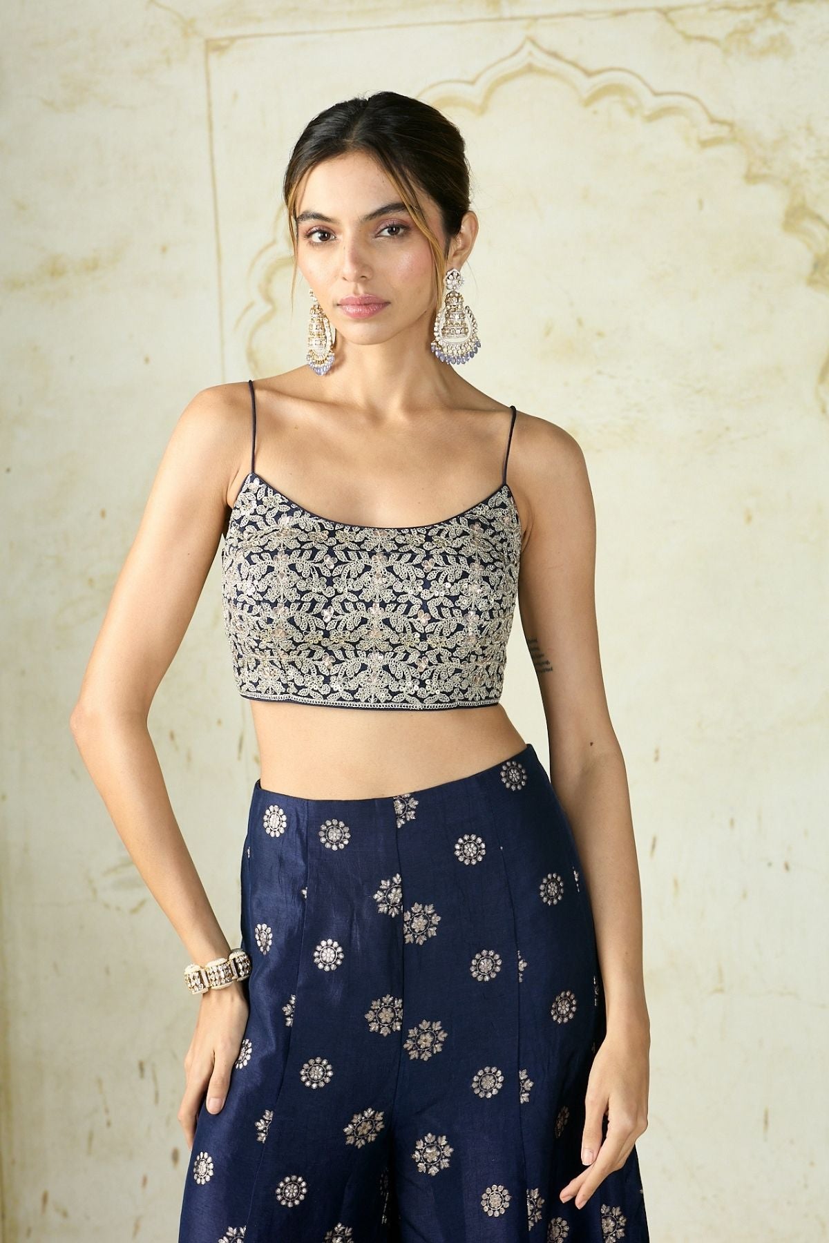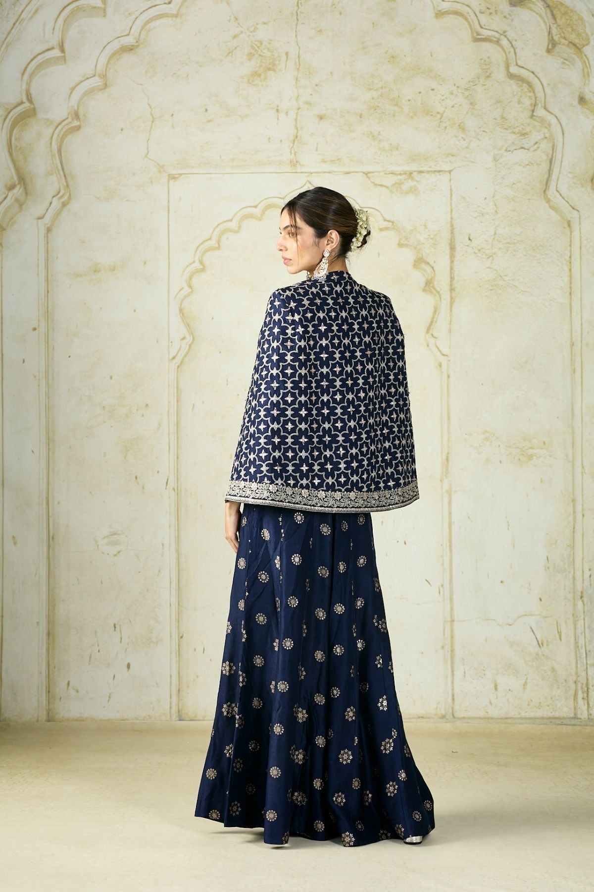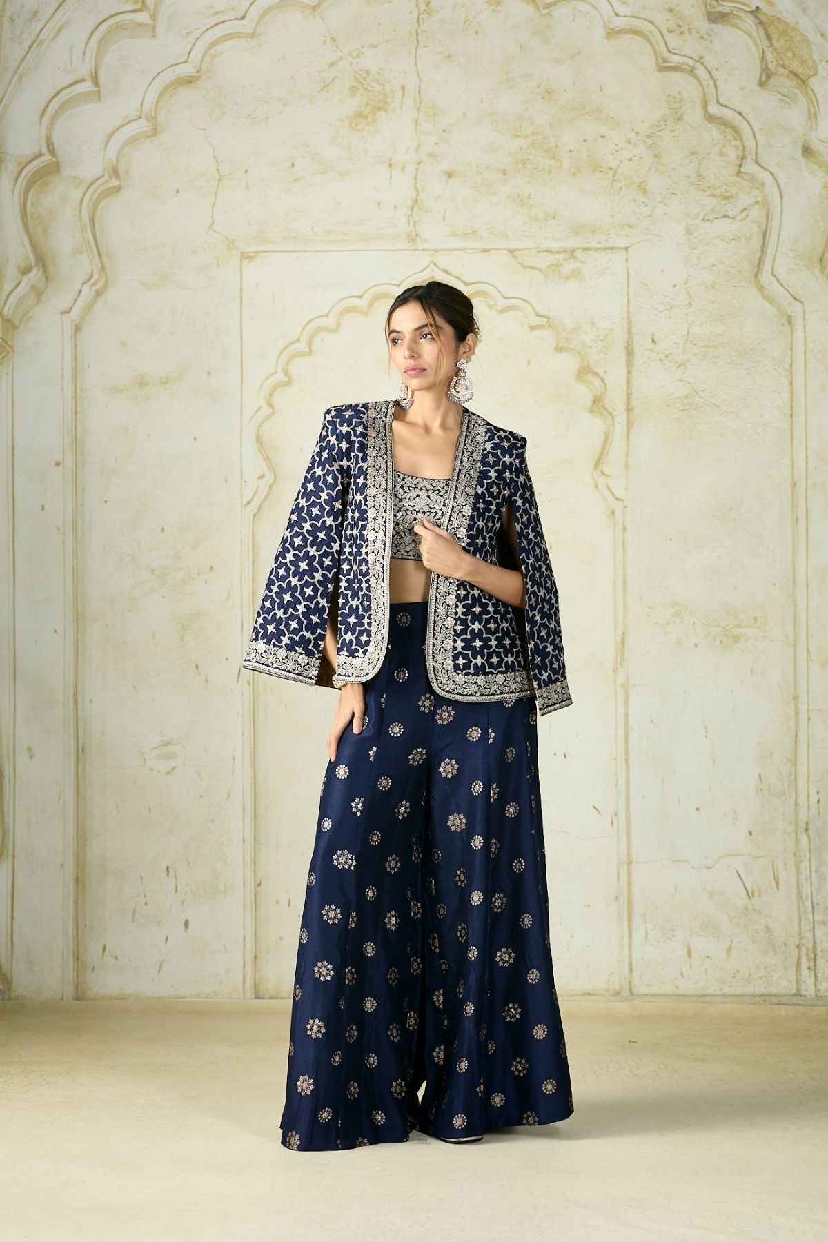 The ensemble features a heavily embellished crop blouse paired with wide-legged palazzo pants, adorned with delicate motifs for a sophisticated look. A statement embroidered cape jacket, adds a contemporary edge while maintaining regal charm.