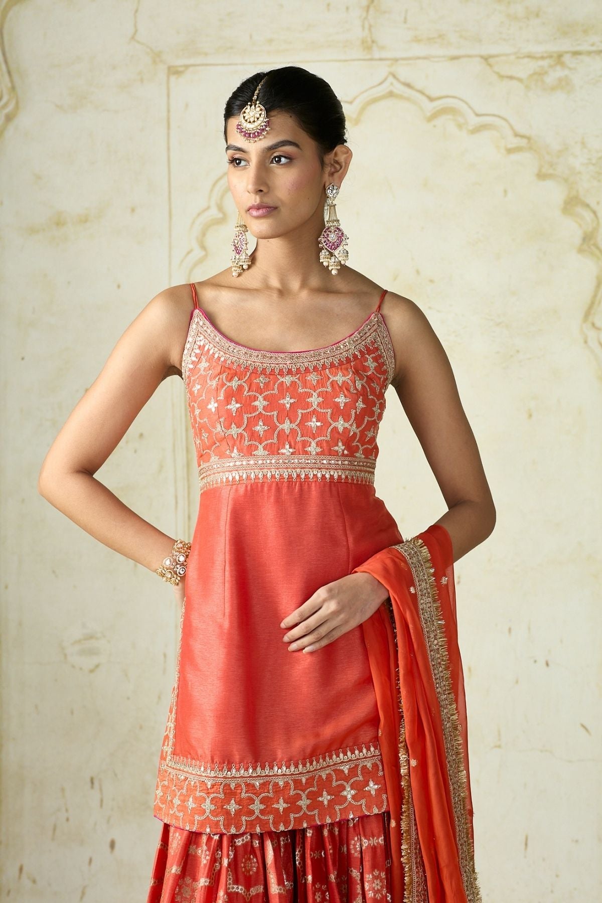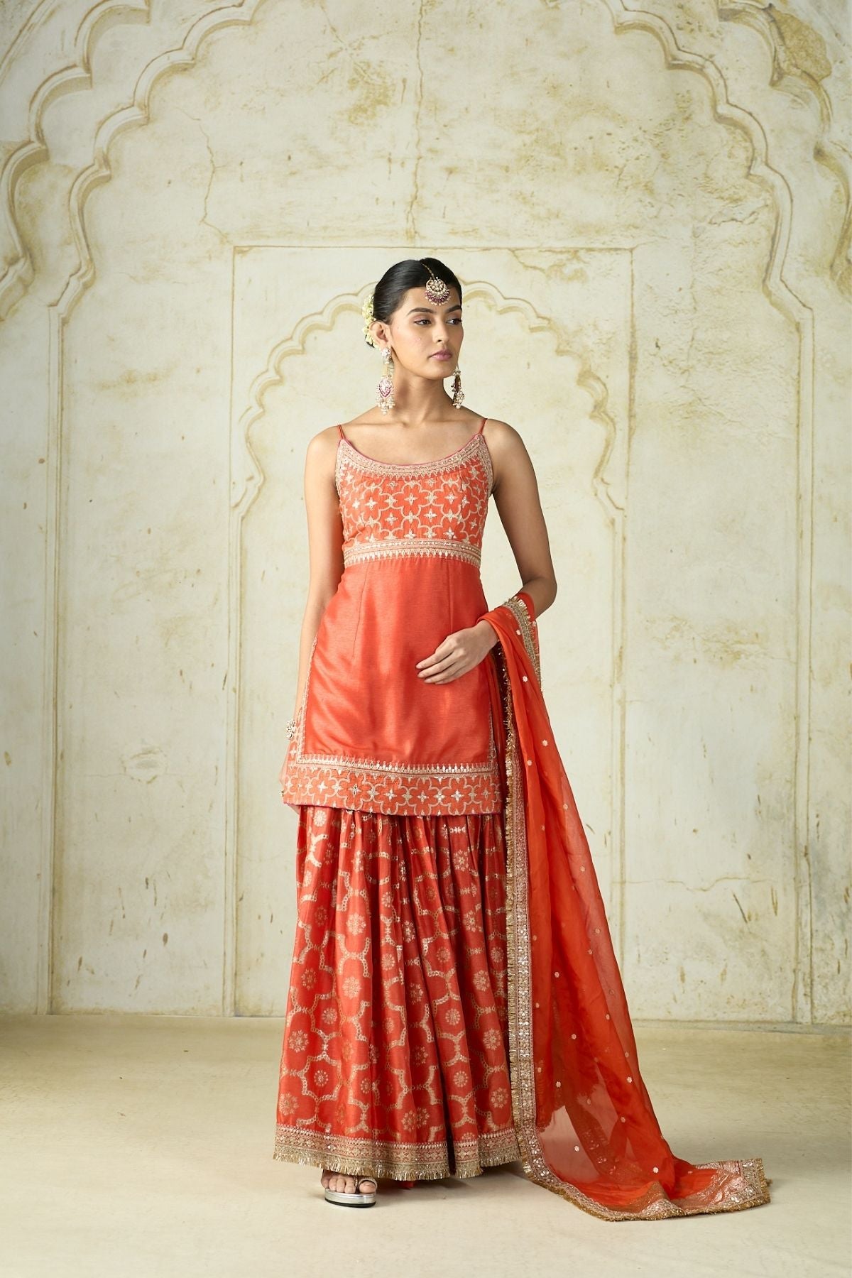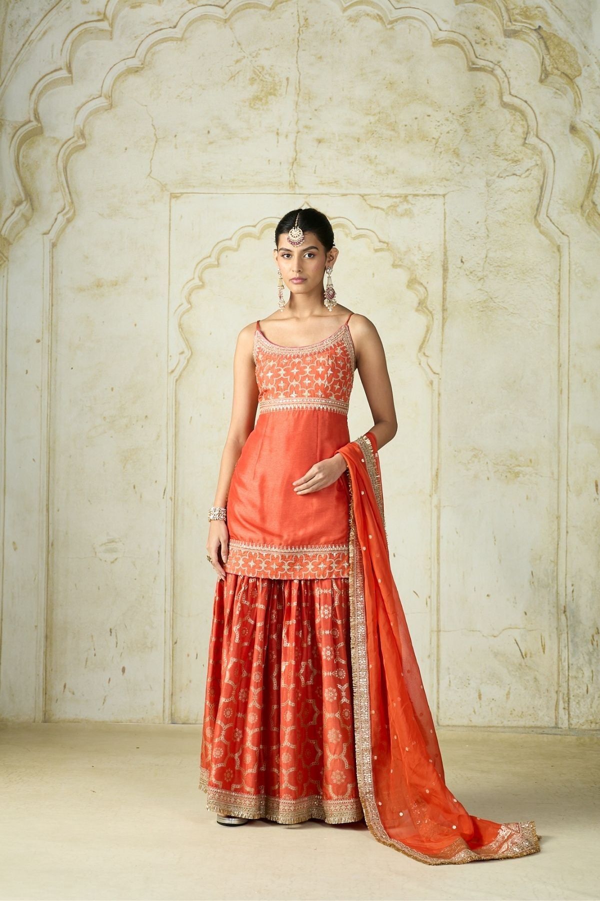 This vibrant traditional ensemble radiates festive elegance with its youthful silhouette. The sleeveless kurta is adorned with delicate embroidery on the neckline and waistline, paired with a sharara featuring intricate woven patterns and a richly embellished hem. The look is completed with a sheer dupatta.