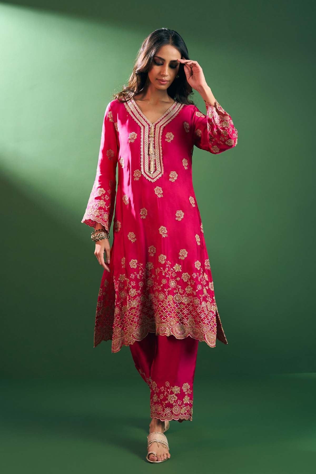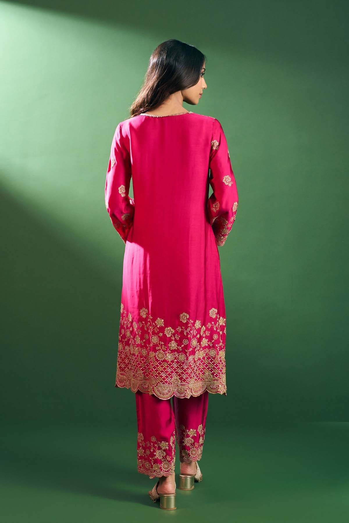 Crafted in lustrous cupro satin, this straight kurta set in fuschia brings a striking festive energy. The kurta is paired with matching satin pants, a look that’s vibrant, refined, and perfect for celebration.. In every size, the top and bottom lengths are an additional half inch.