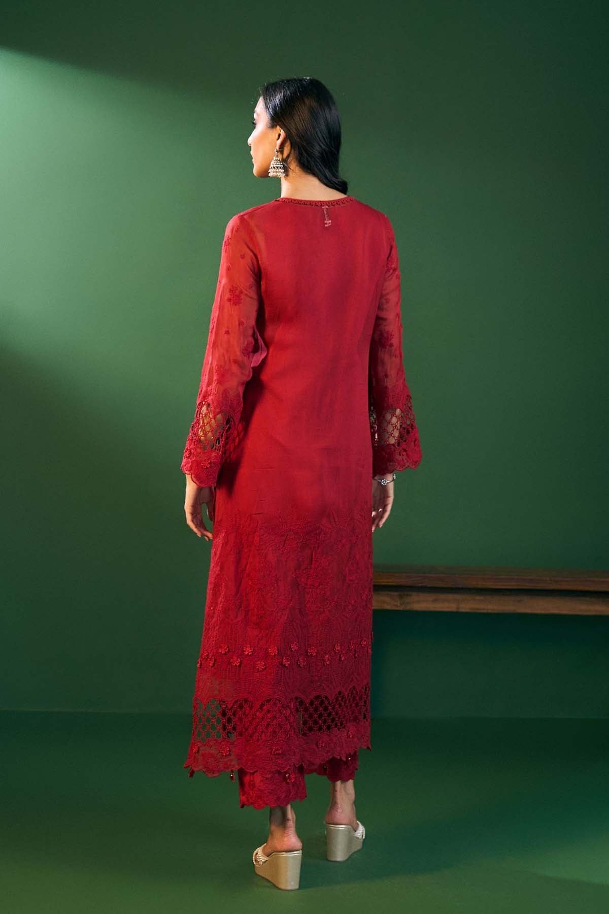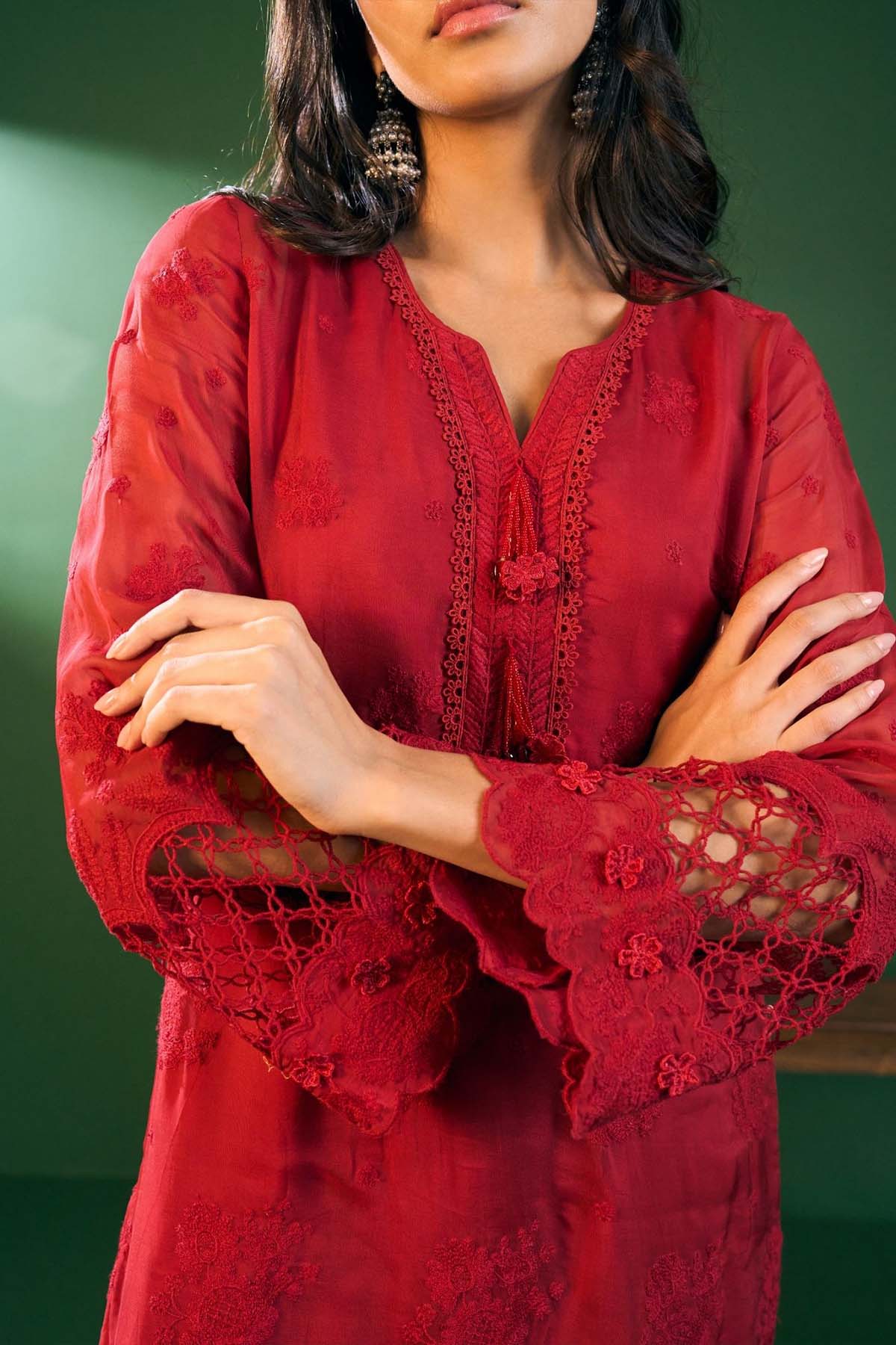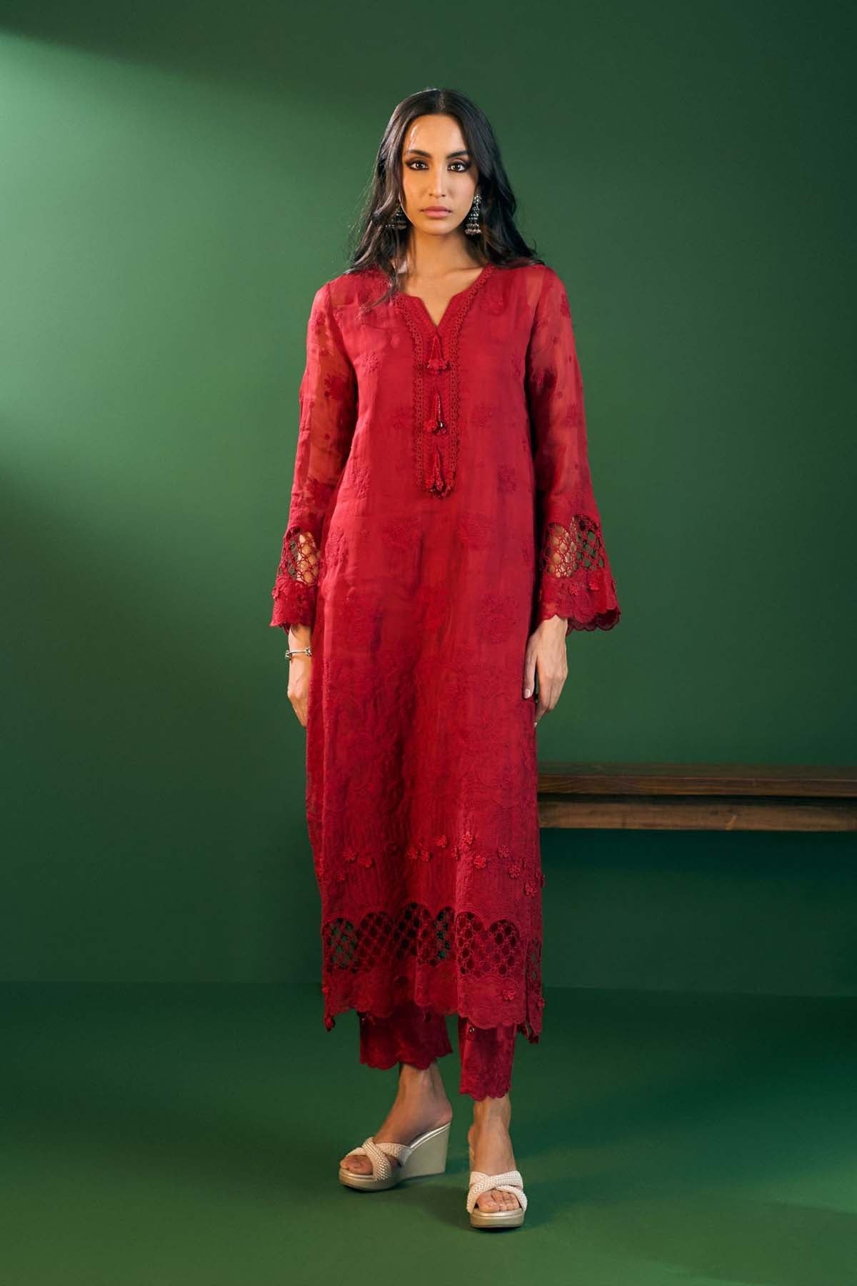 A straight kurta in airy organza paired with pima satin pants. This red kurta set features delicate printed accents, making it a lightweight yet festive choice. In every size, the top and bottom lengths are an additional half inch.