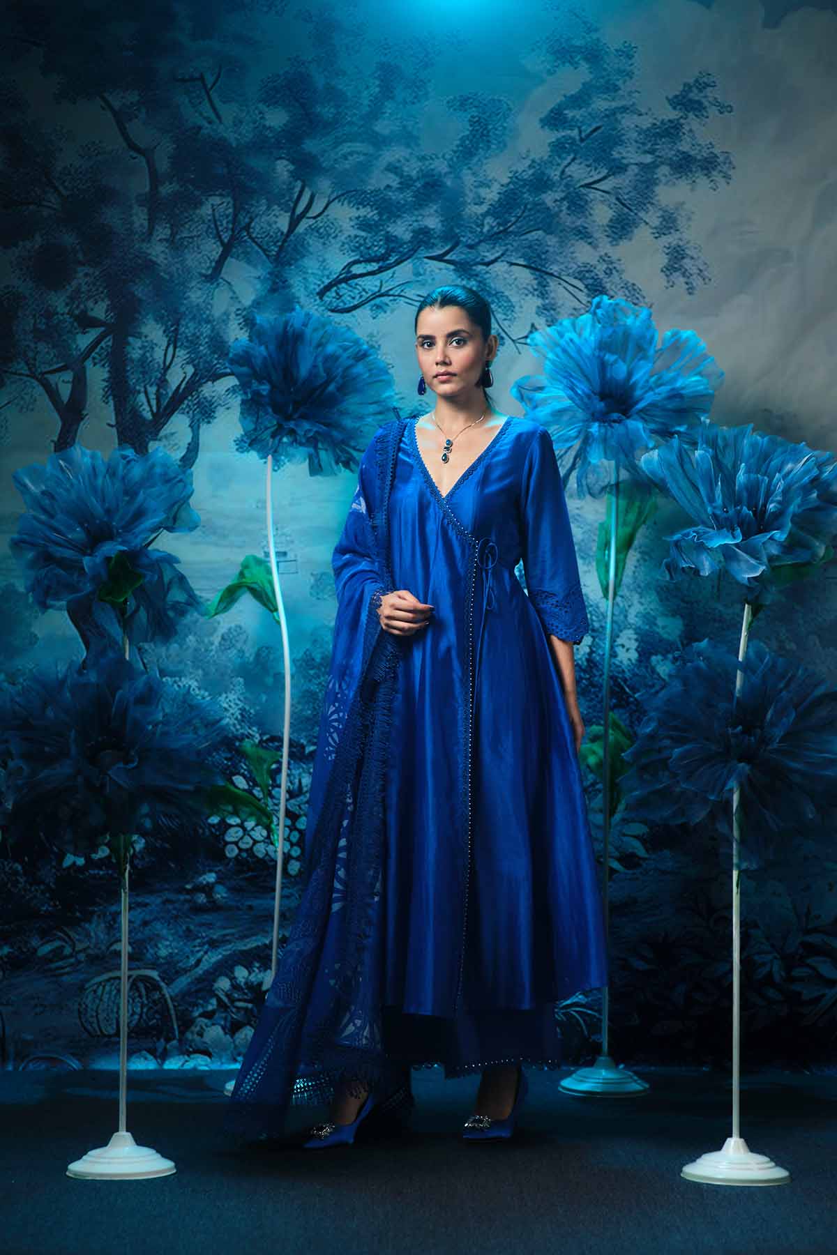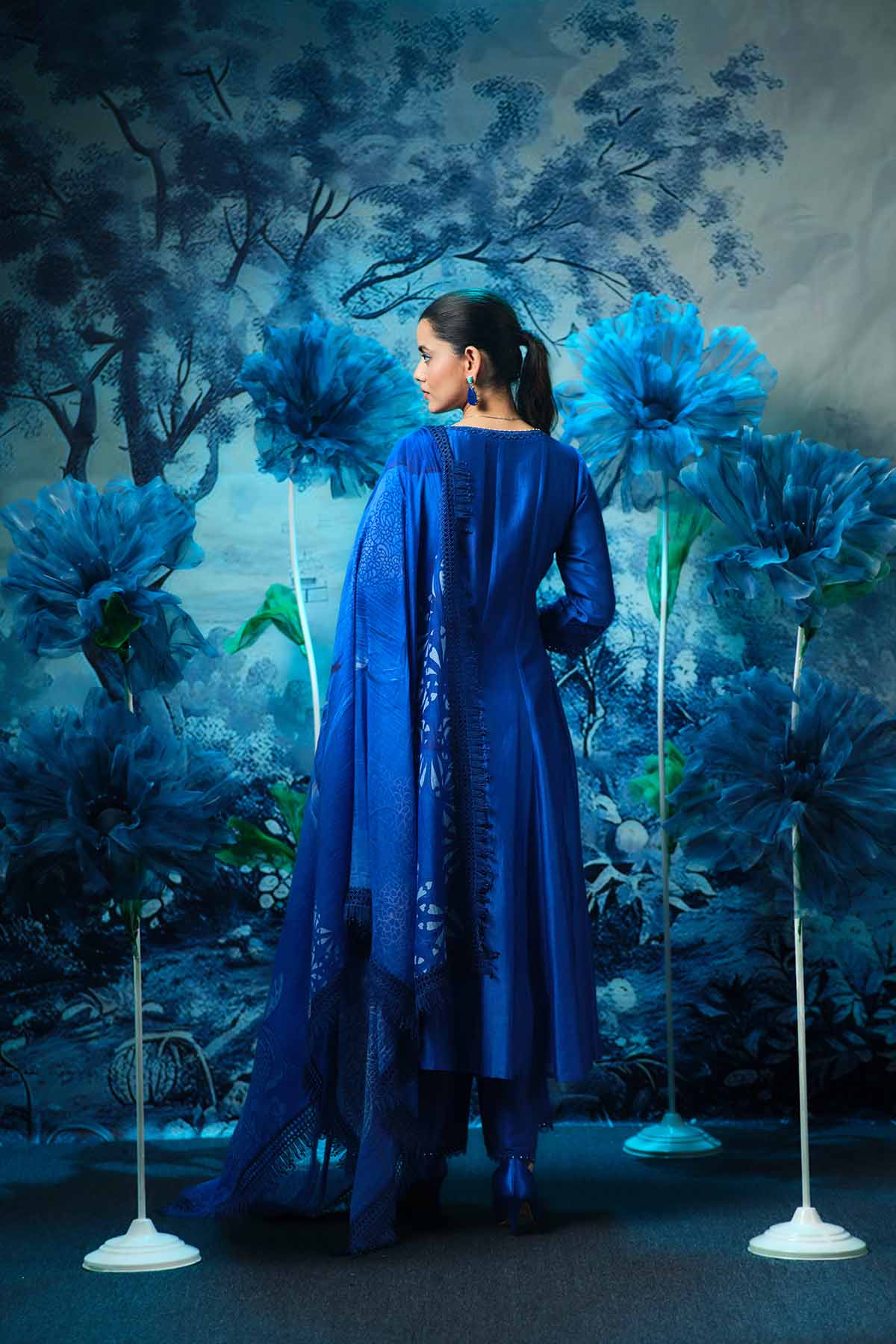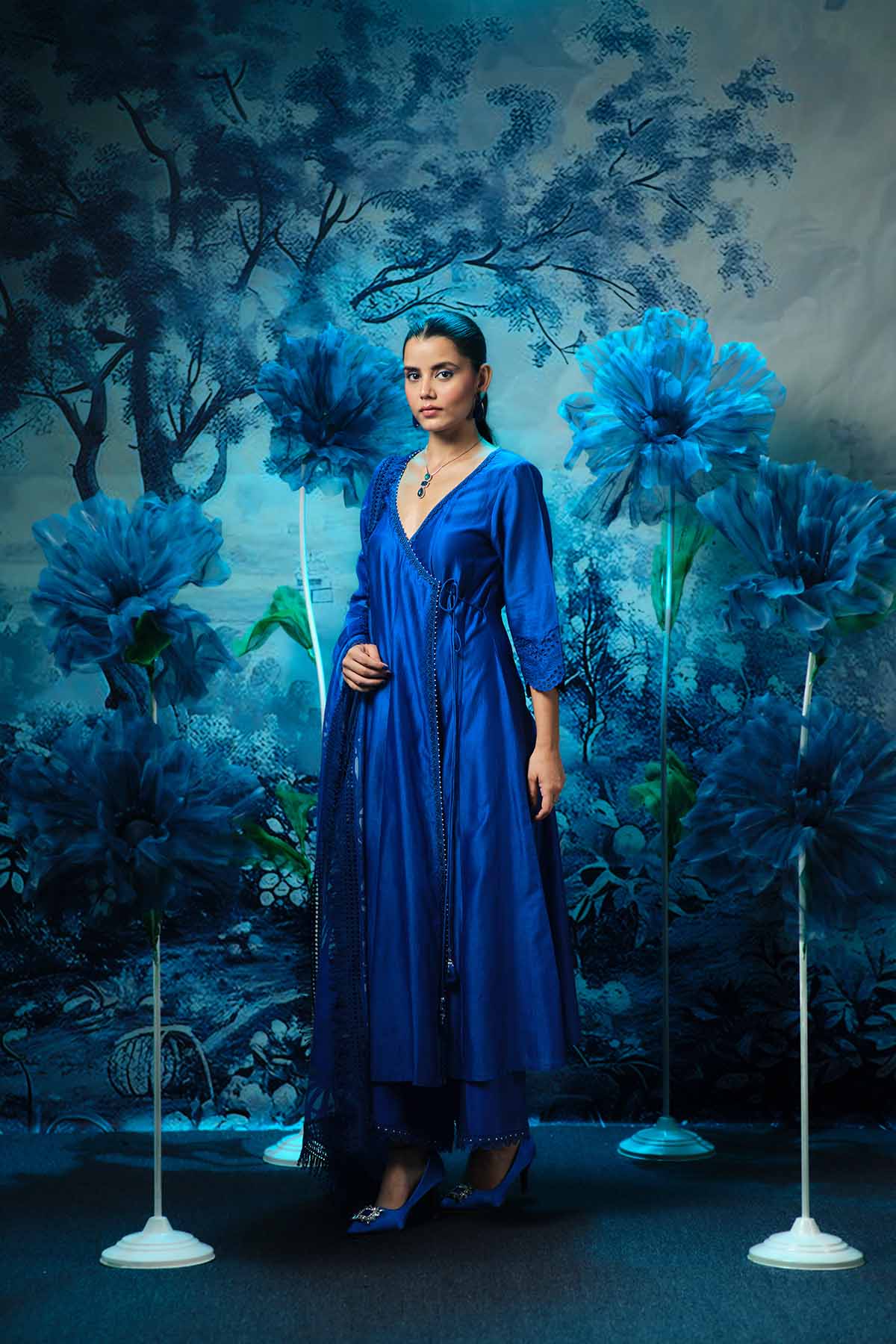 Embrace timeless elegance with this beautifully crafted indigo anarkali set, featuring a flowy chanderi anarkali, paired with a sleek textured palazzo and an exquisitely detailed printed dupatta