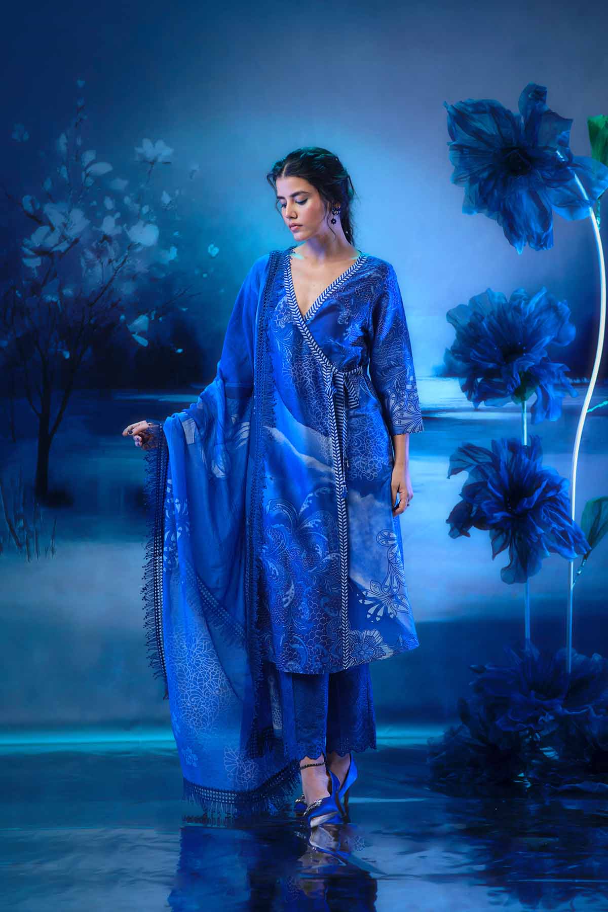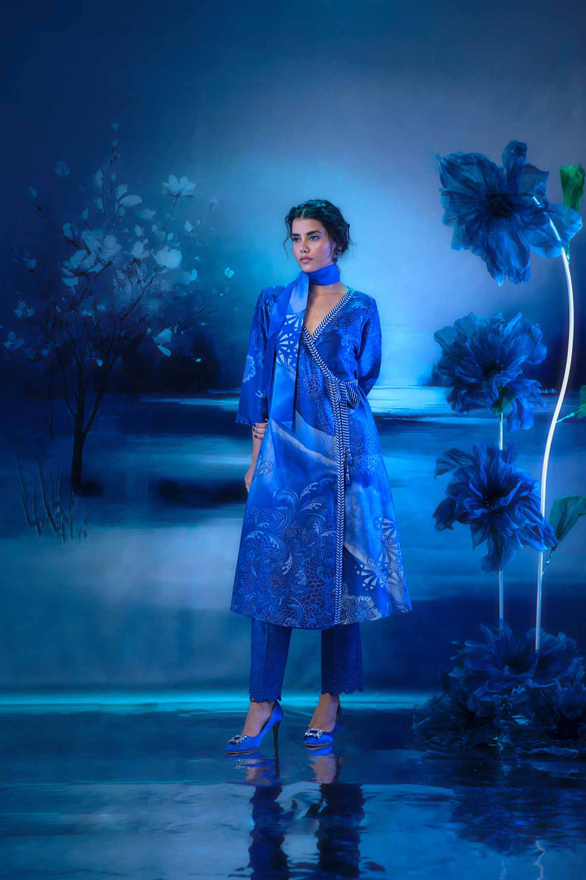 Embrace heritage with a modern twist in the indigo bliss set, featuring a graceful angrakha-style kurta in soft blue printed chanderi . The wrap silhouette flatters effortlessly, while the cutwork detailing on the pants adds artisanal texture and charm. A delicate fringed dupatta completes the look adding movement and a contemporary edge to the classic silhouette.Ā