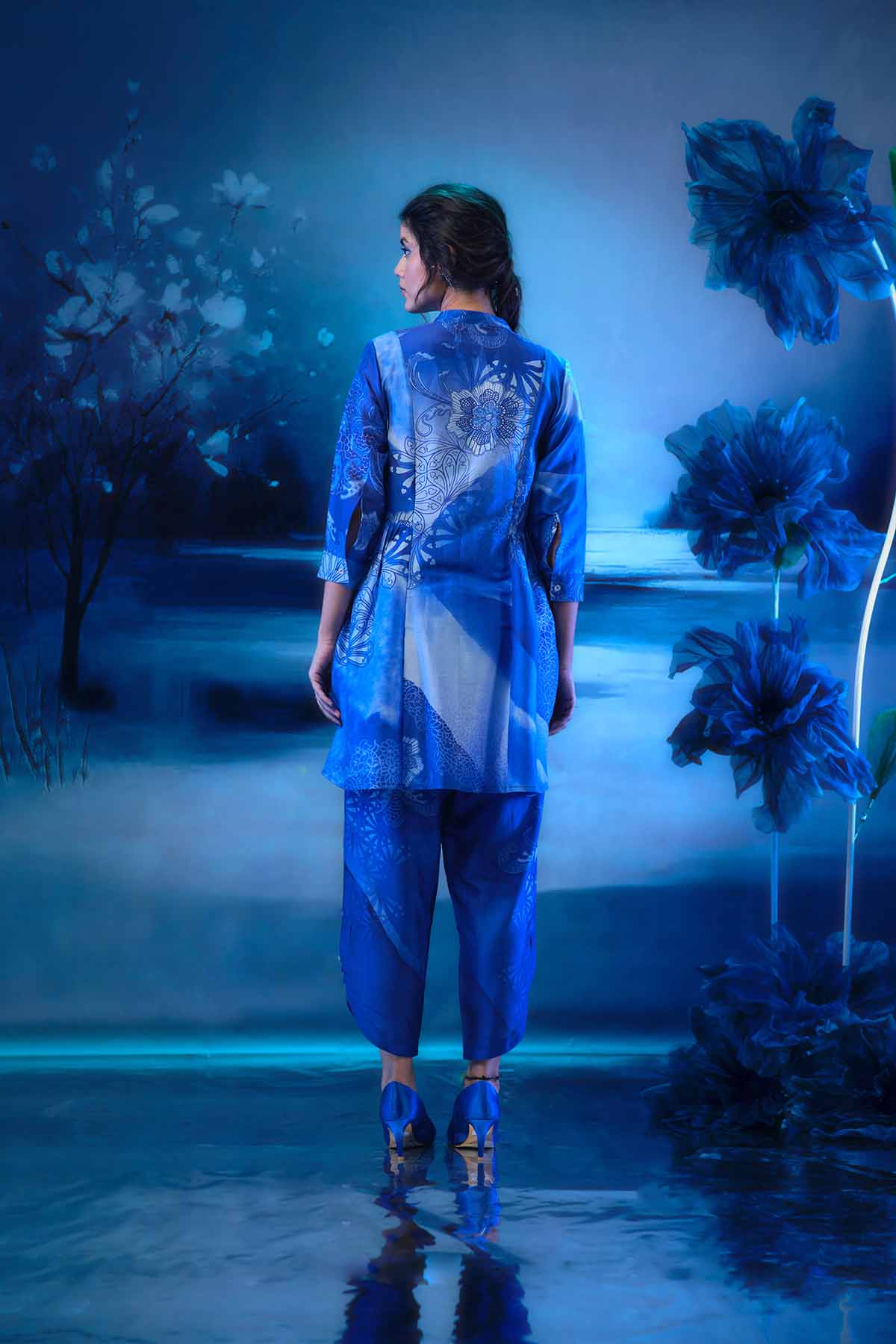 Bold meets beautiful in the indigo affair ensemble, featuring a flowy, blue printed tunic crafted luxurious chanderi, paired effortlessly with a chic dhoti-style pant. The relaxed silhouette of the co-ord ensemble , combined with the drape of dhoti , creates a look that’s both modern and rooted in tradition
