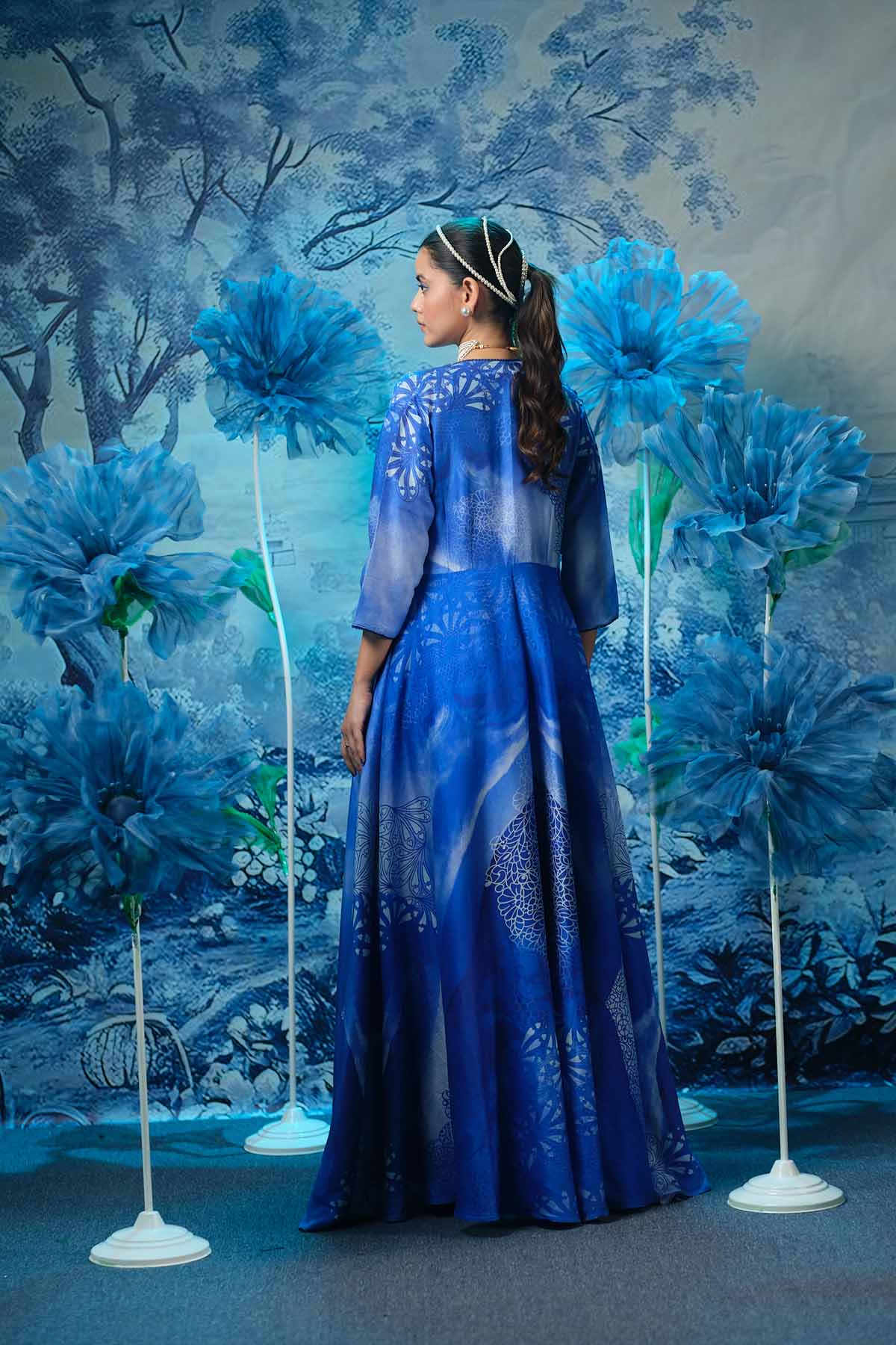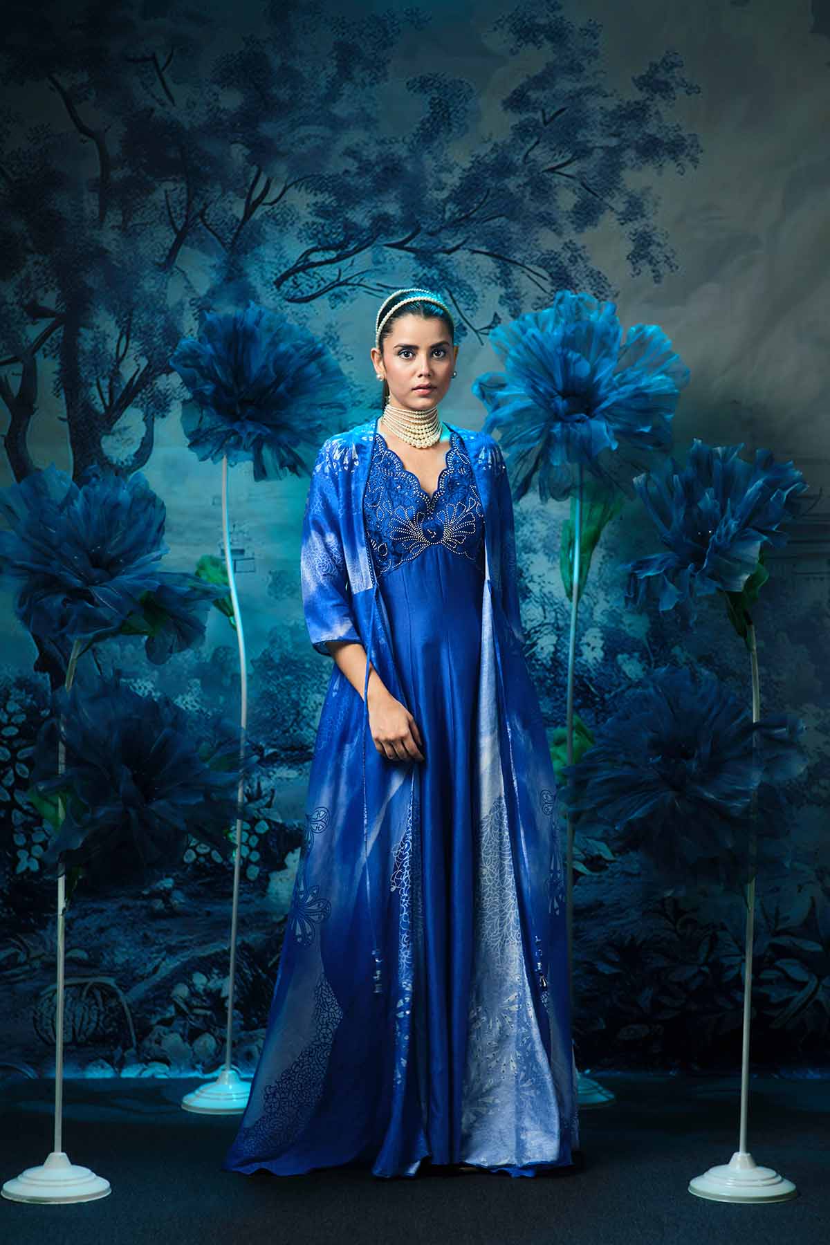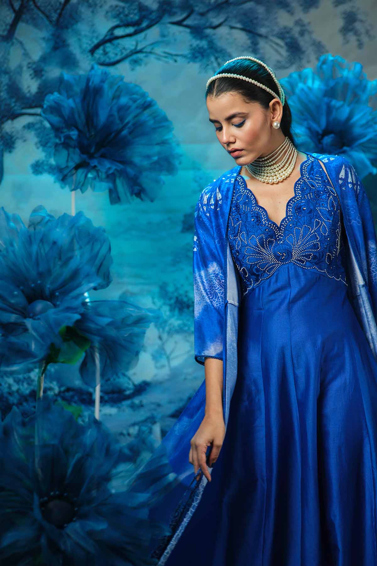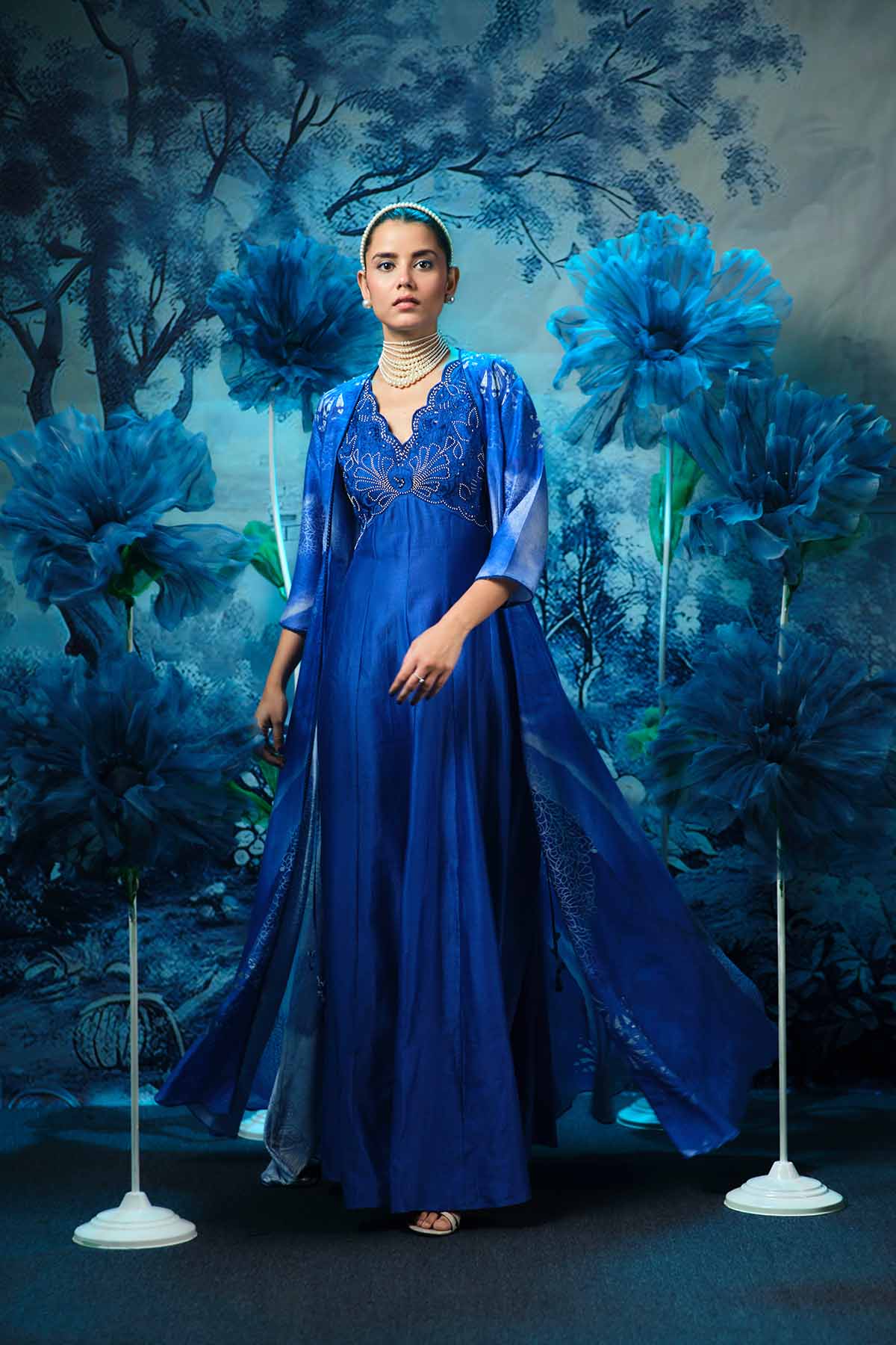 A statement of effortless elegance with the indigo sapphire long dress, paired with a flowing, printed cape that adds drama and dimension to your look. Crafted from luxurious chanderi fabric, this enables features a richly embroidered upper bodice that beautifully contrast the soft blue base.