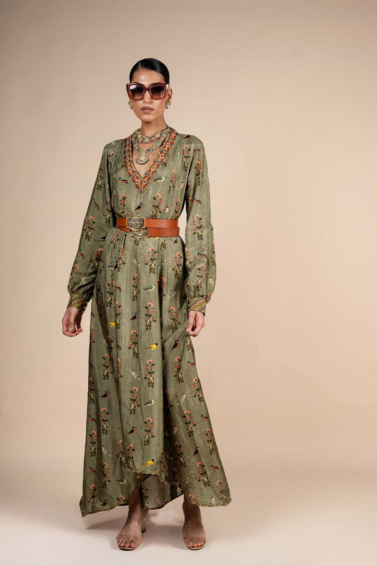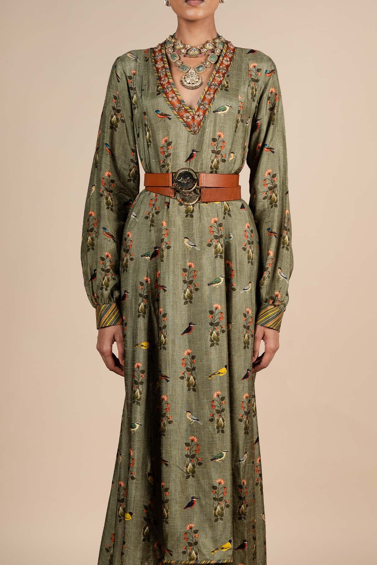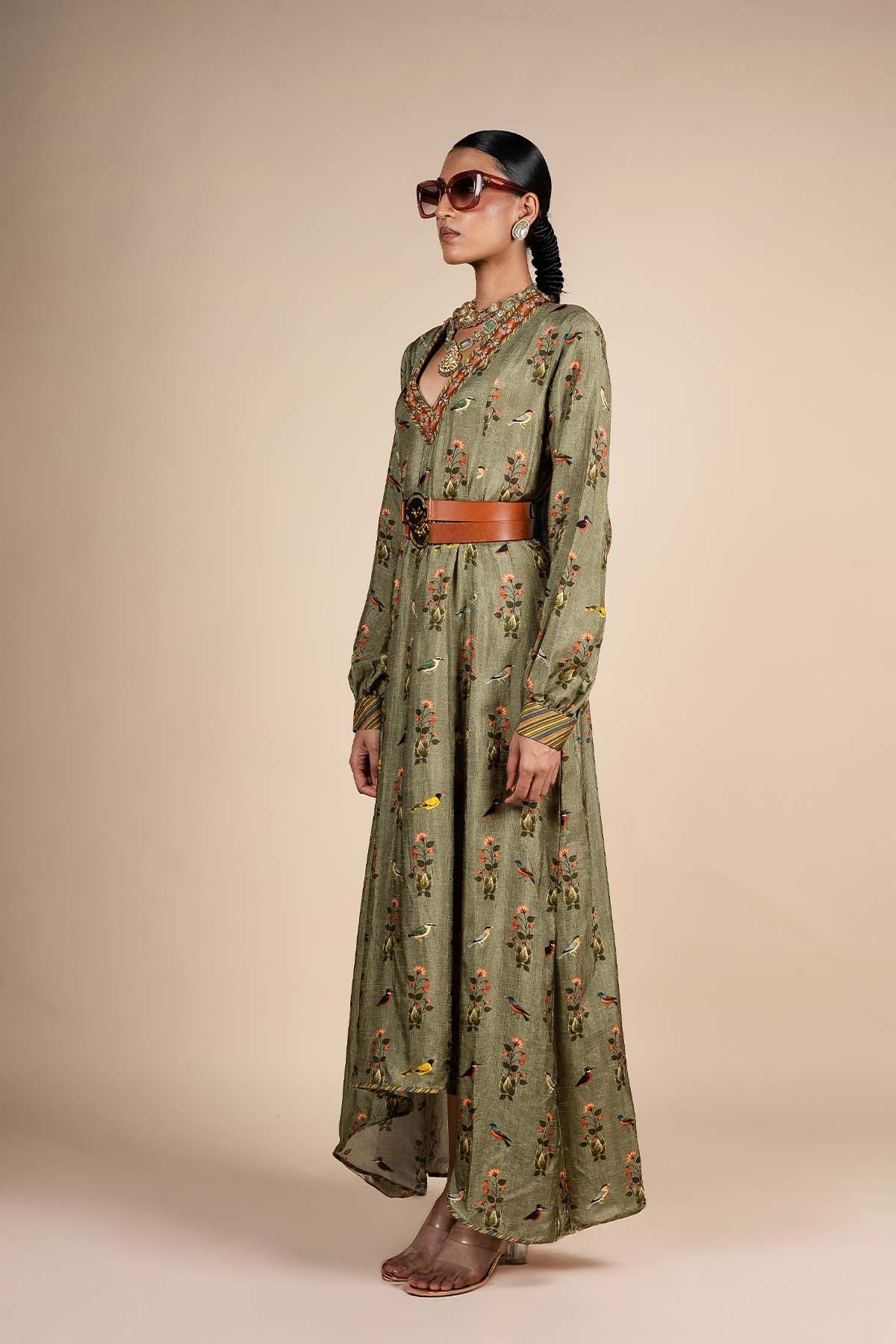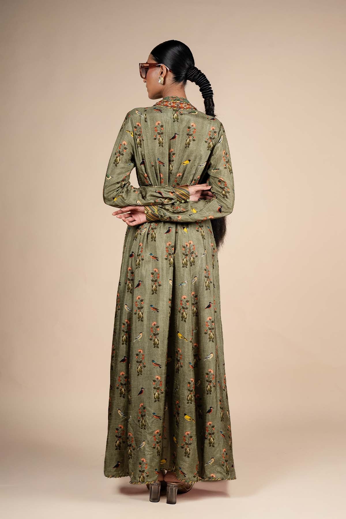 The sage green anarkali features alternating dabka work and anchor embroidery on the neckline, creating a striking detail. The design is elevated by a flora and fauna print throughout, with multicolour stripe print on the cuffs adding a vibrant touch.