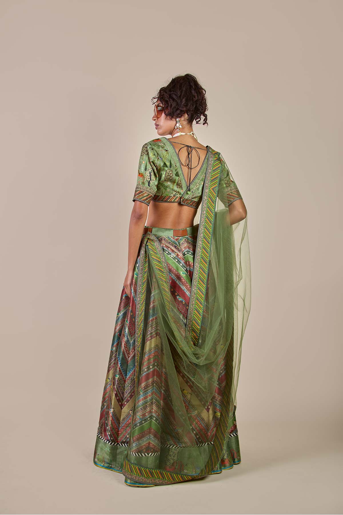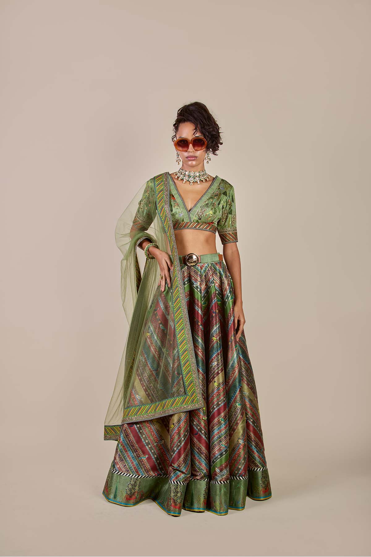 A sap green tulle-dyed stole, enhanced with a metallic jewelled embroidered border, offering a subtle yet striking finish.