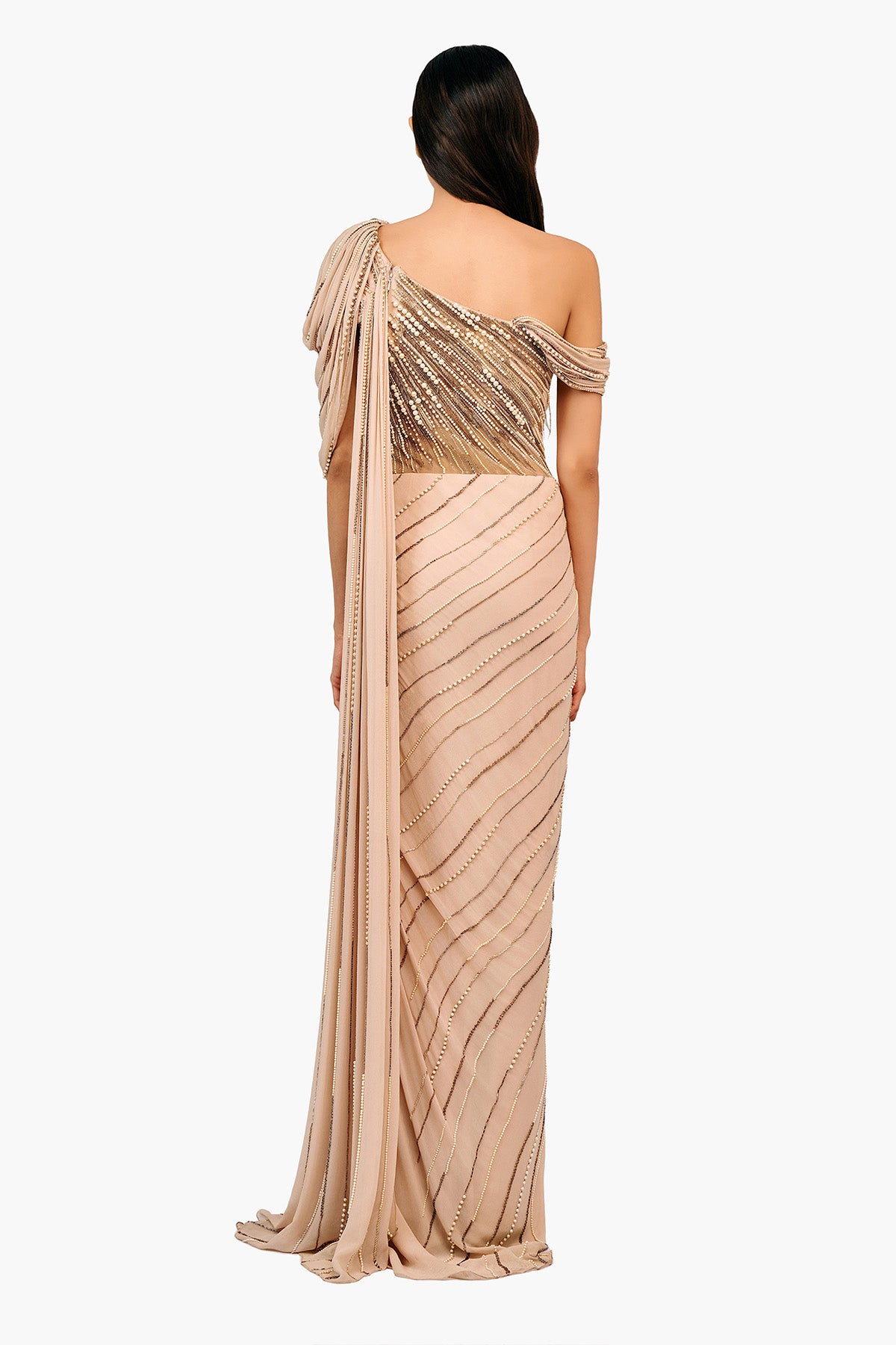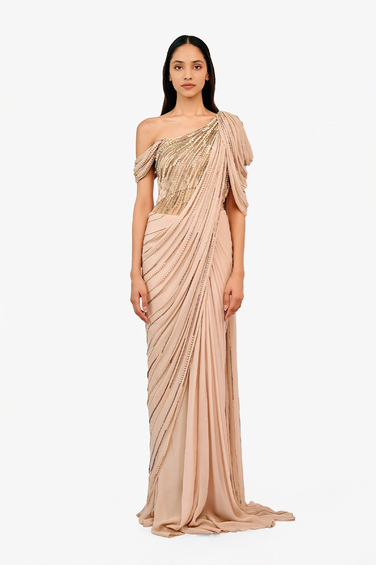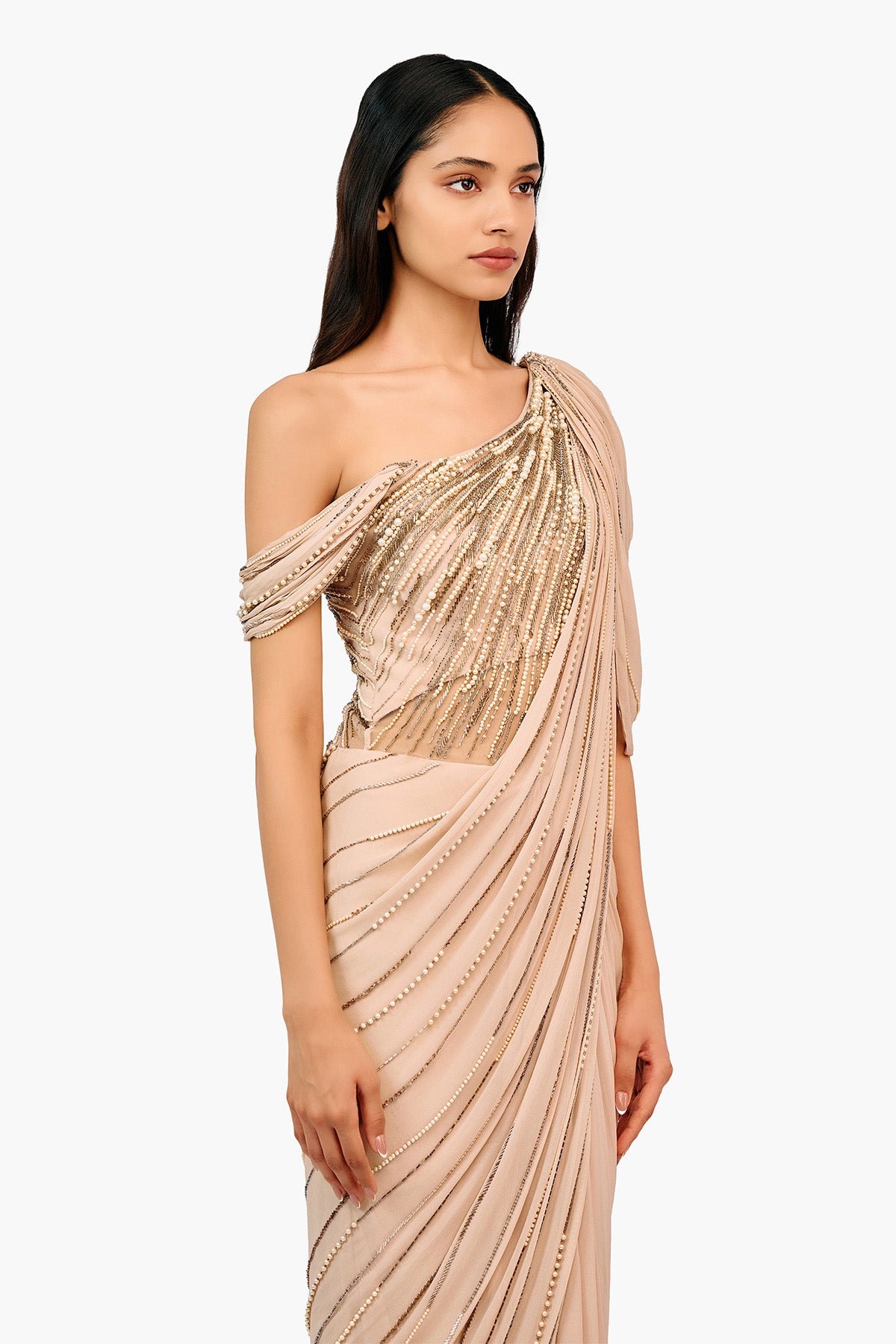 Pearl embellished saree gown with draped cowl sleeves.