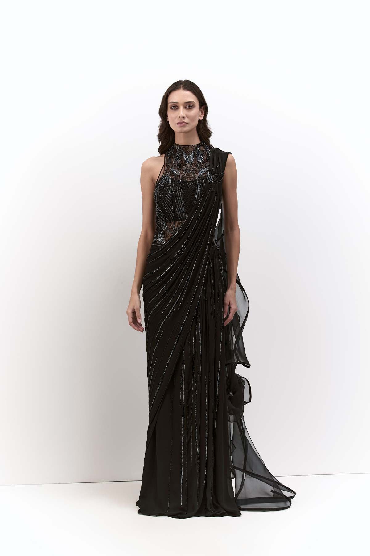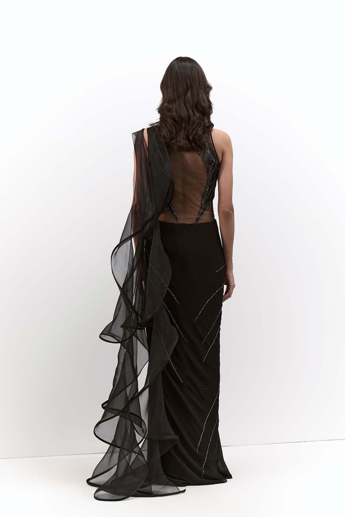 Cosmic black saree gown with a high neckline, prismatic embroidery, and a silk organza ruffle drape.