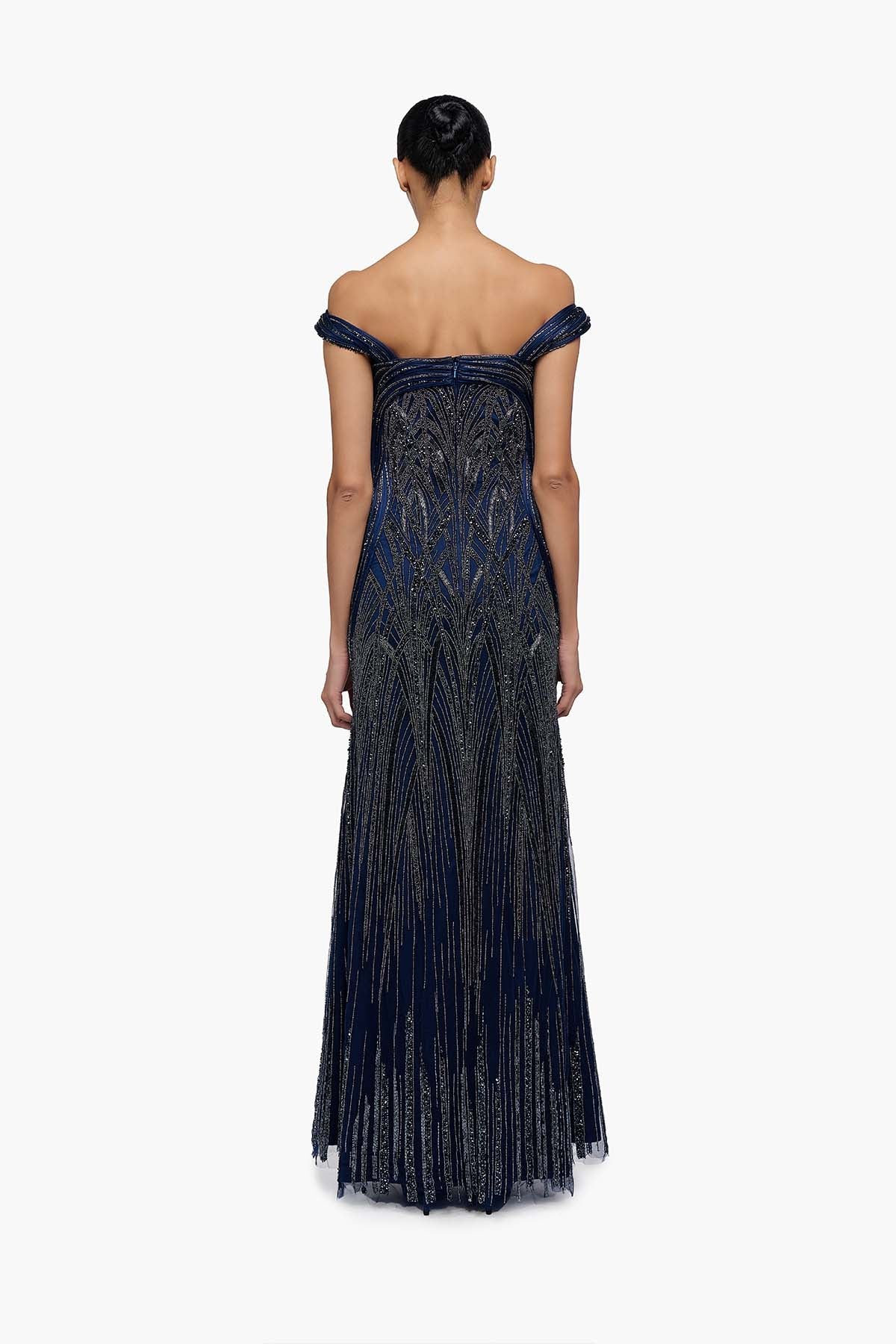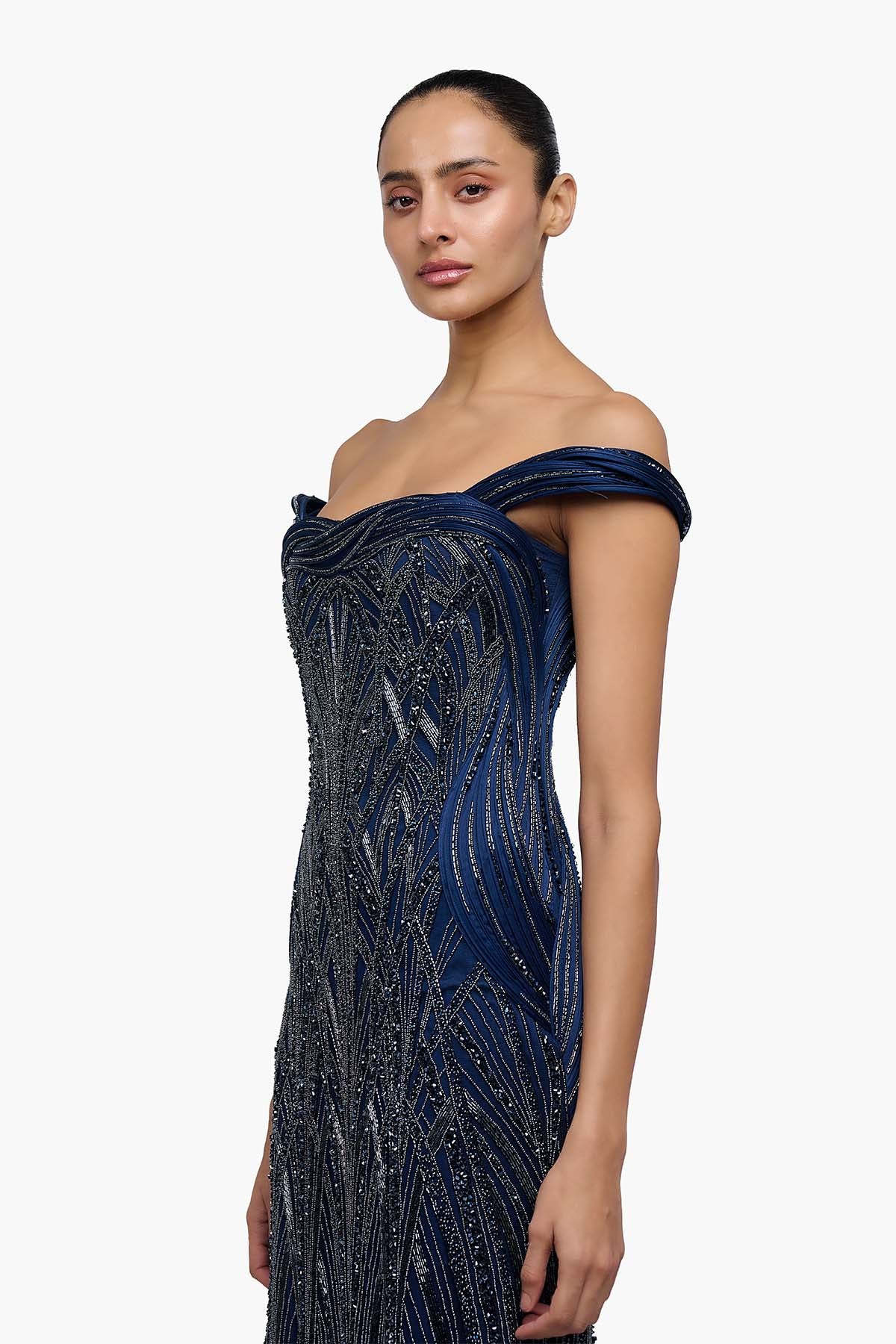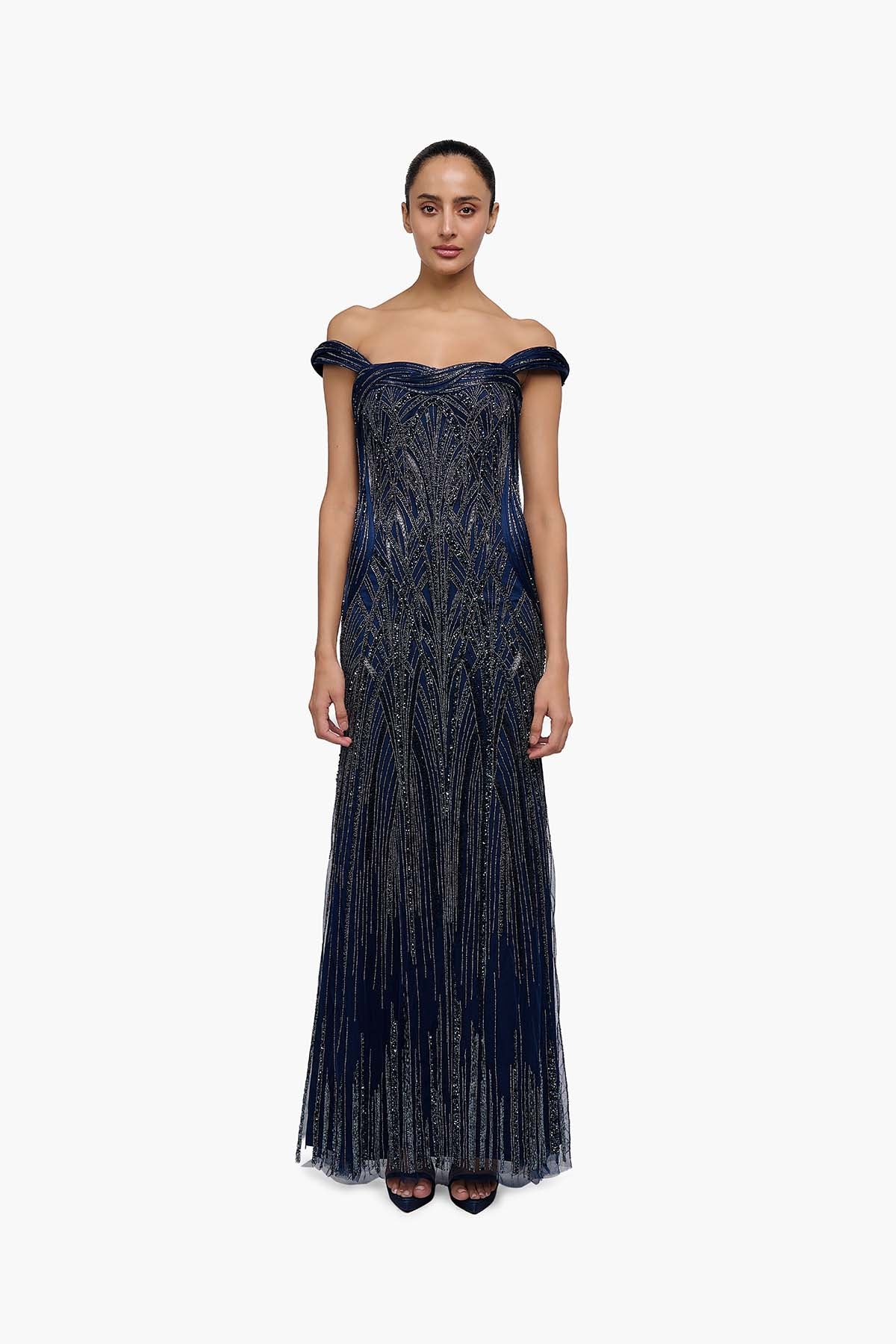Off shoulder night blue gown with architectural embroidery.
