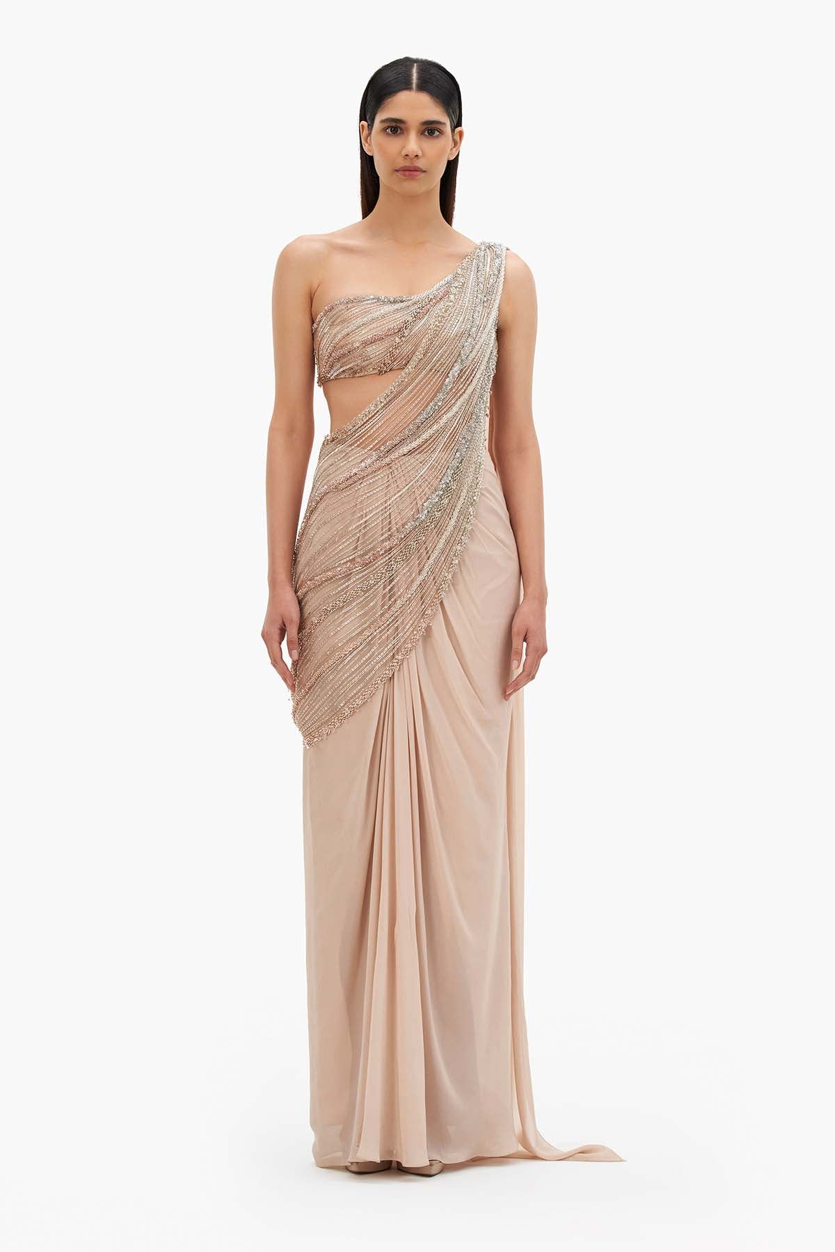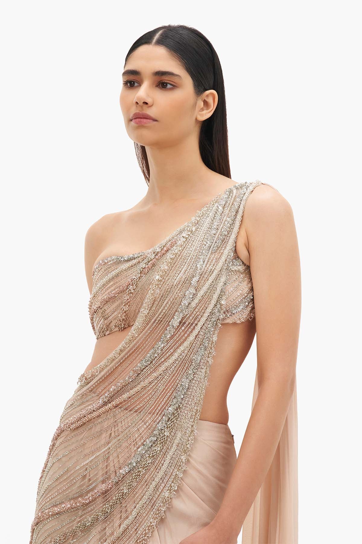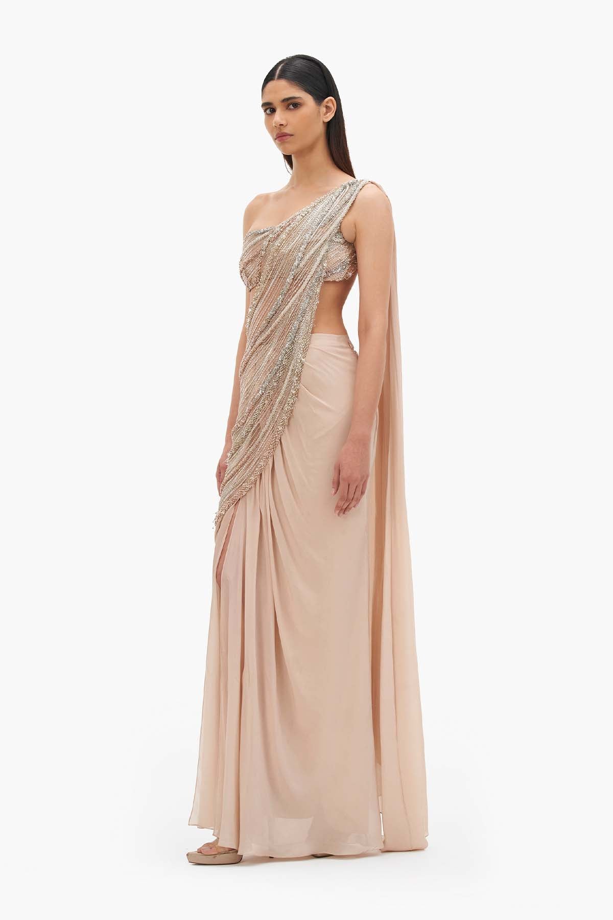 Haze gold one-shoulder saree gown with crystal embroidery.