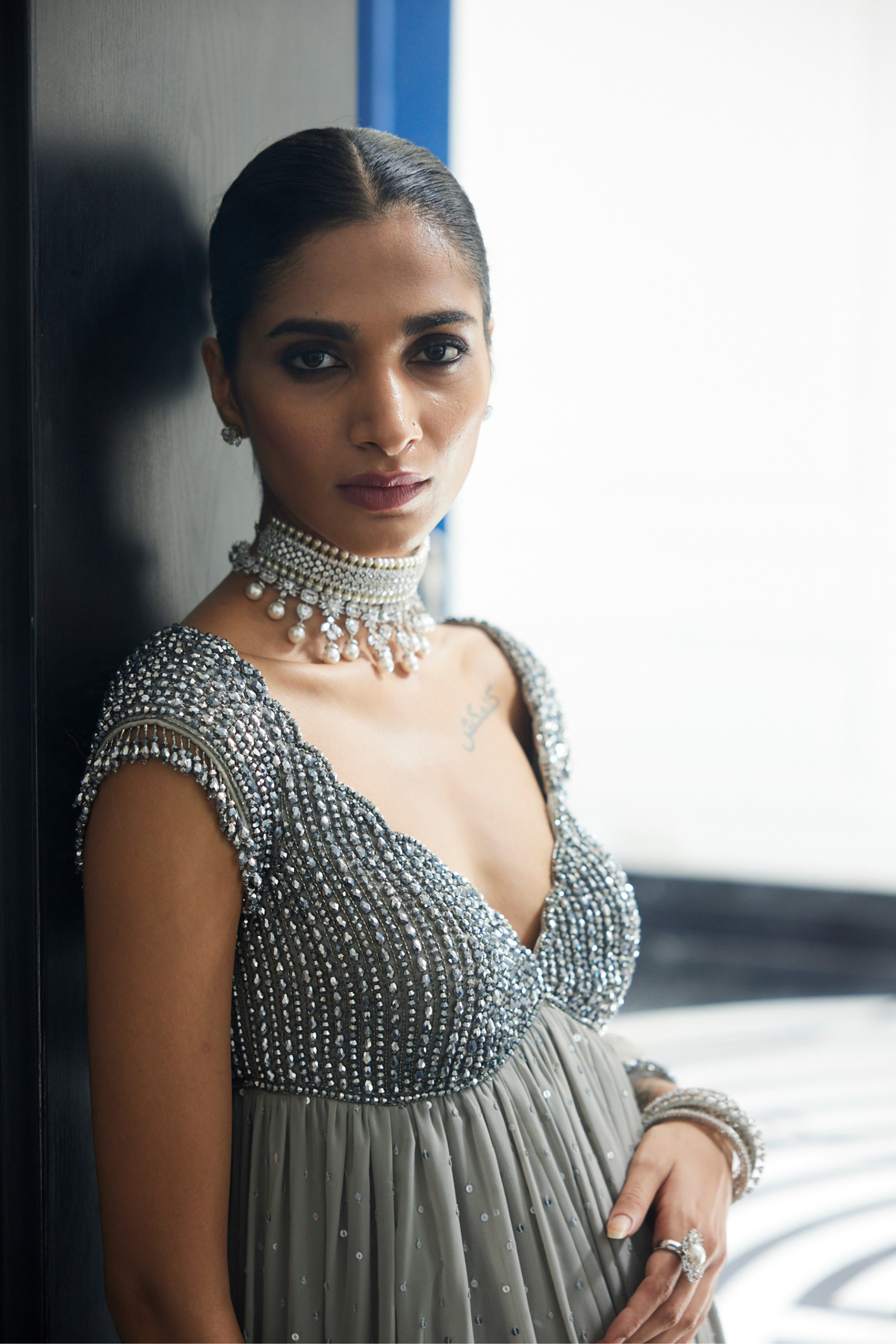 Intricately Hand Embroidered kurta, Dupatta and Pants featuring Cutdana and crystal embroidery.