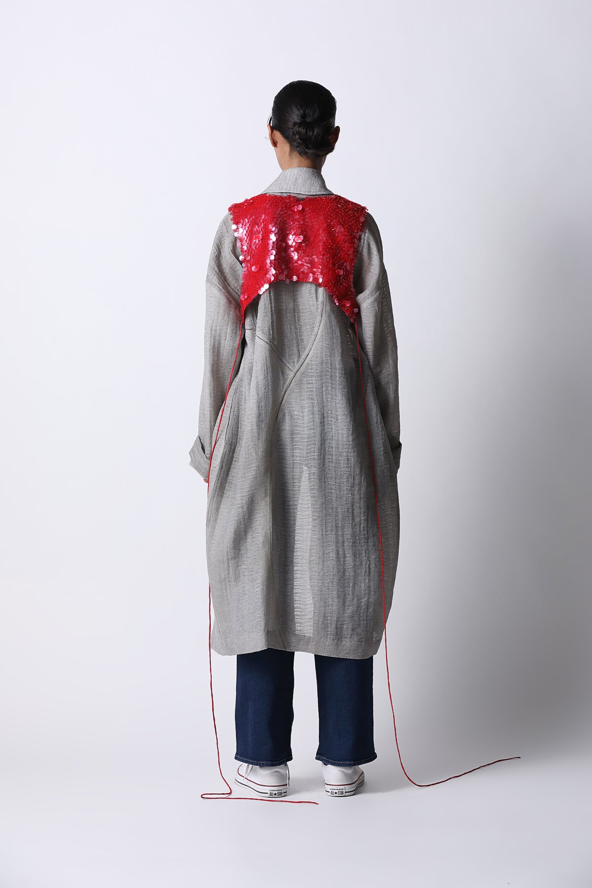 A lightweight oversized coat cut in a textured woven fabric that works as a beautiful layer. The wave coat features notched collar, full sleeves and a single breasted button closure. Enhanced with hand stitched details along the seams. Comes with a detachable embroidered overlay that you can also style as a separate. Pair it over your jeans or a trouser look for that smart casual vibe.