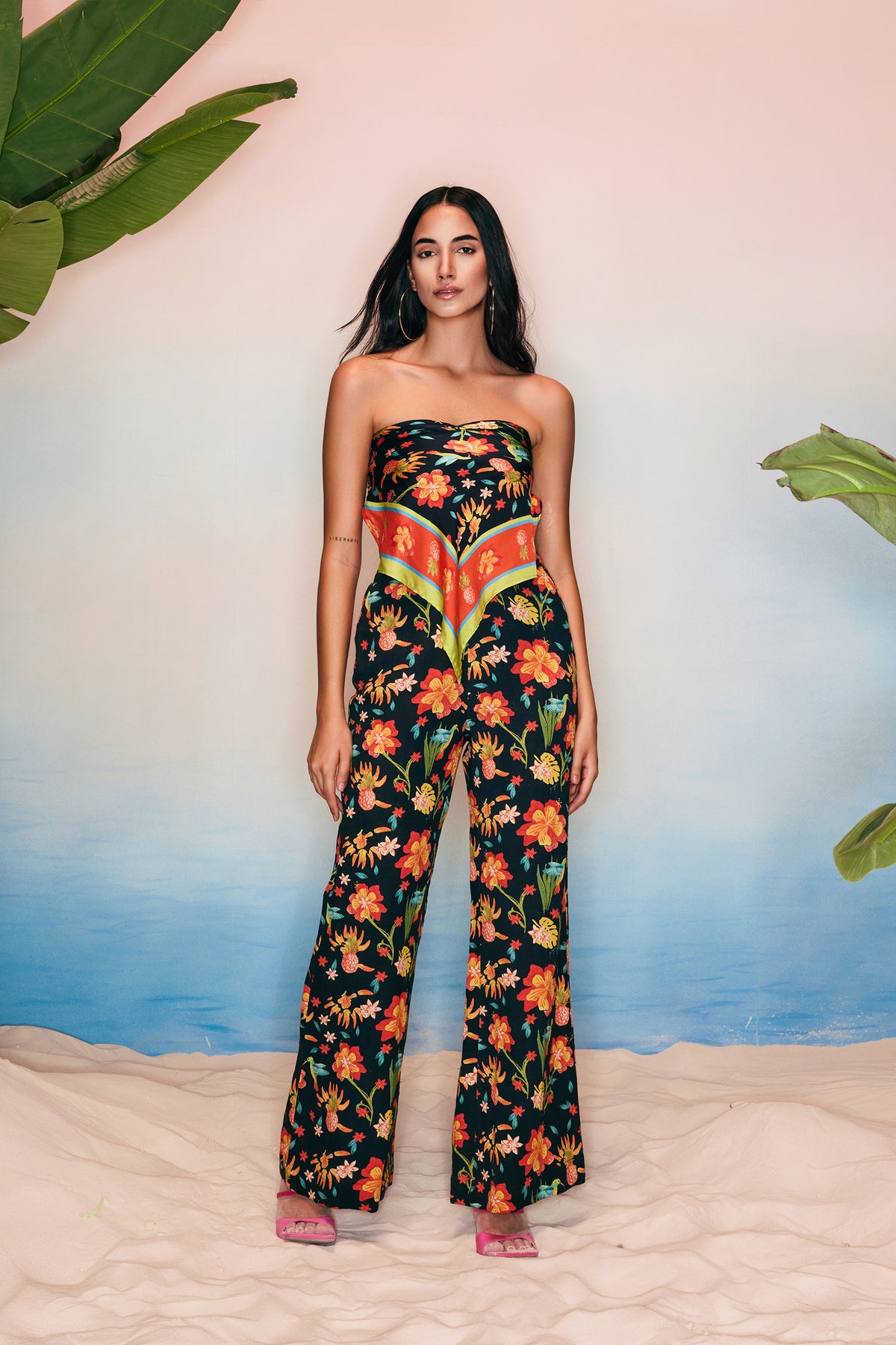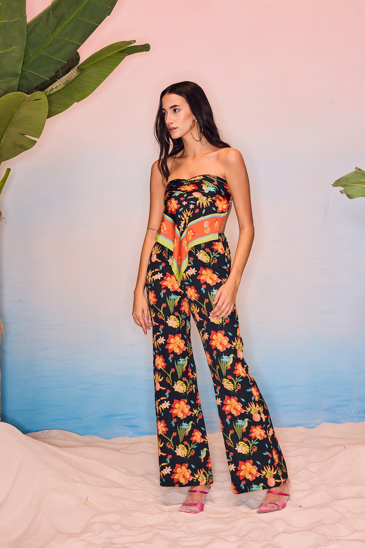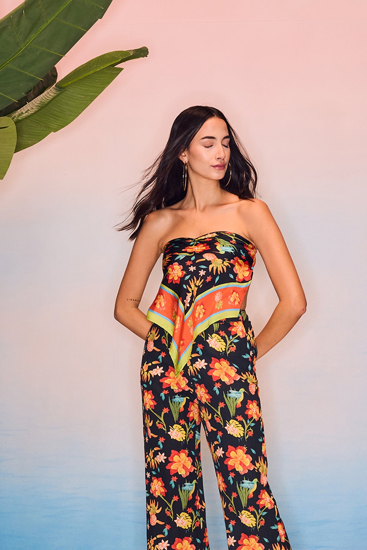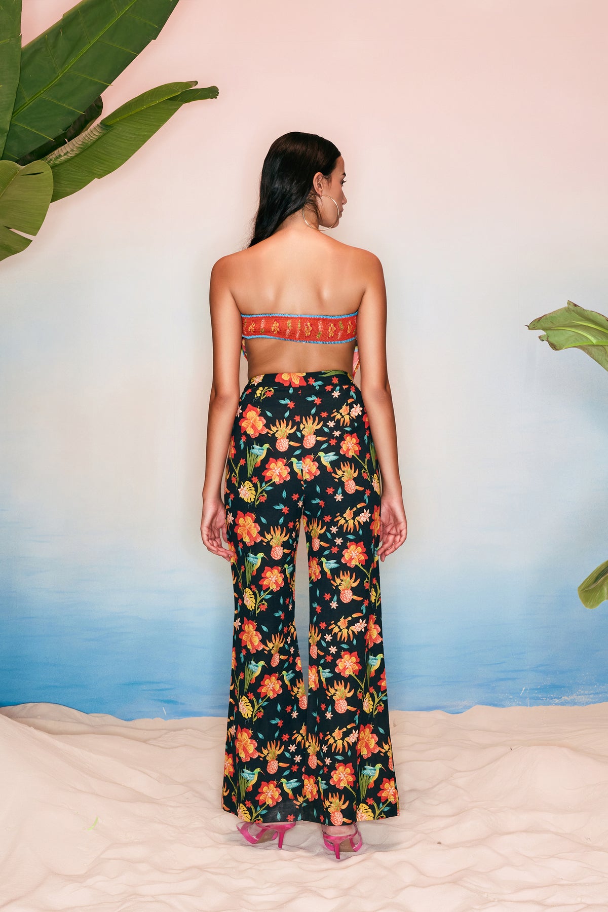 This cute bandeau top in sitara art print with contrast border details is a beach resort favourite. Pairs well with sitara pants. Backless with stretch elastic ruched detailing in the front