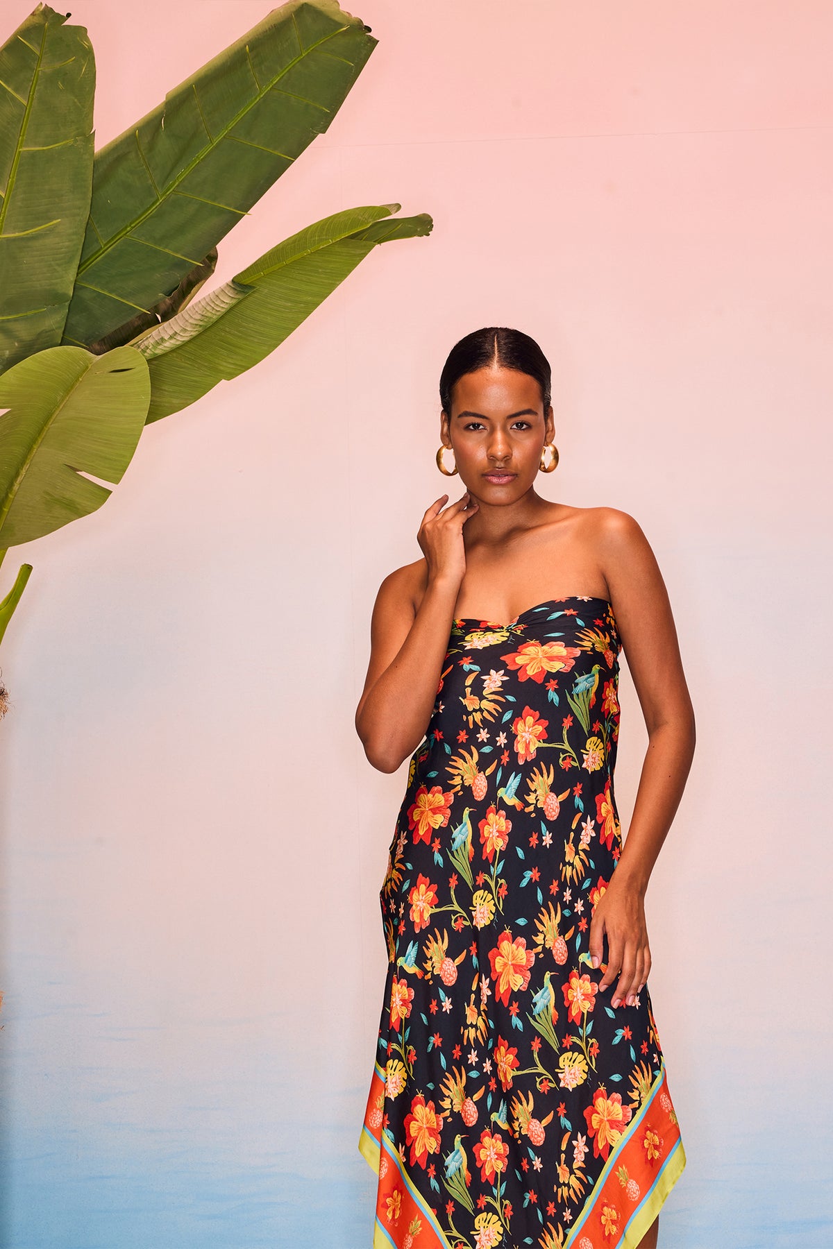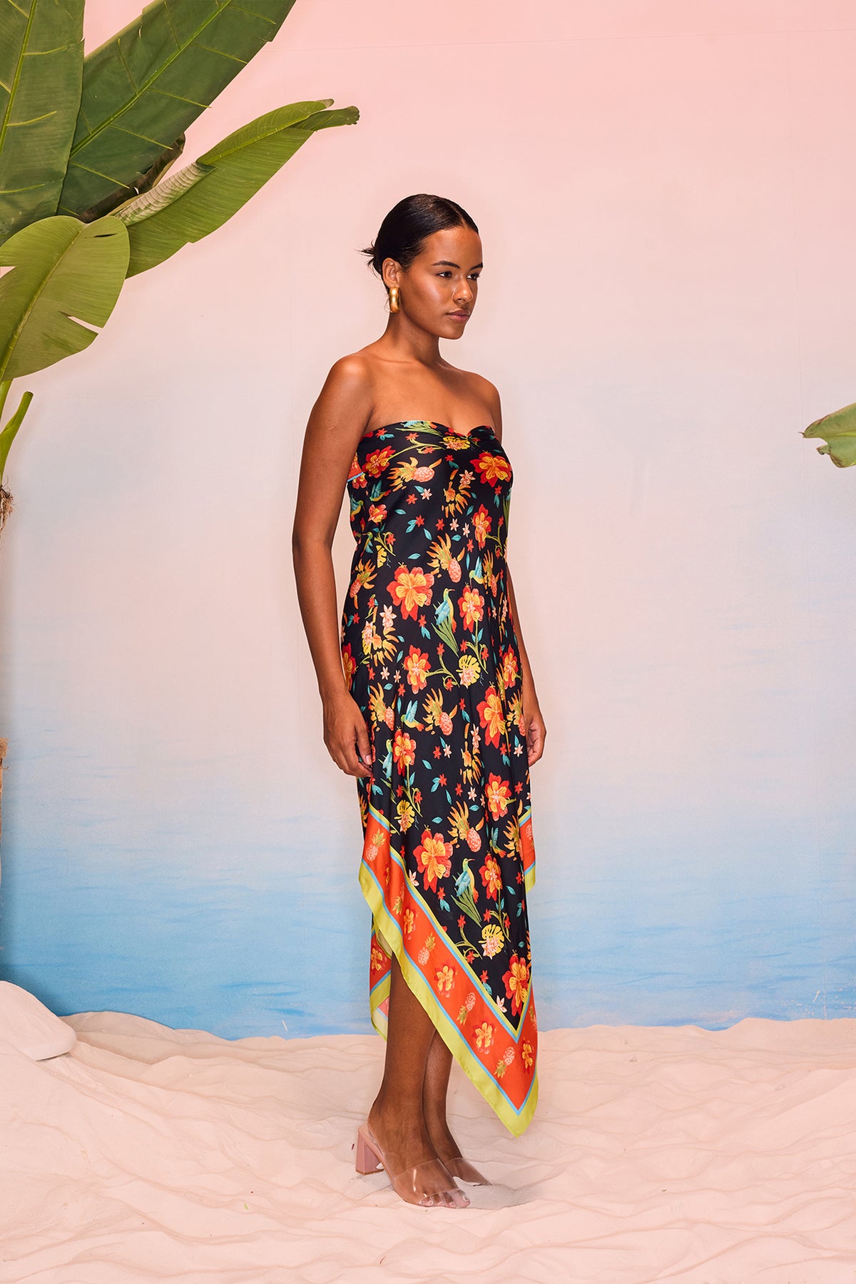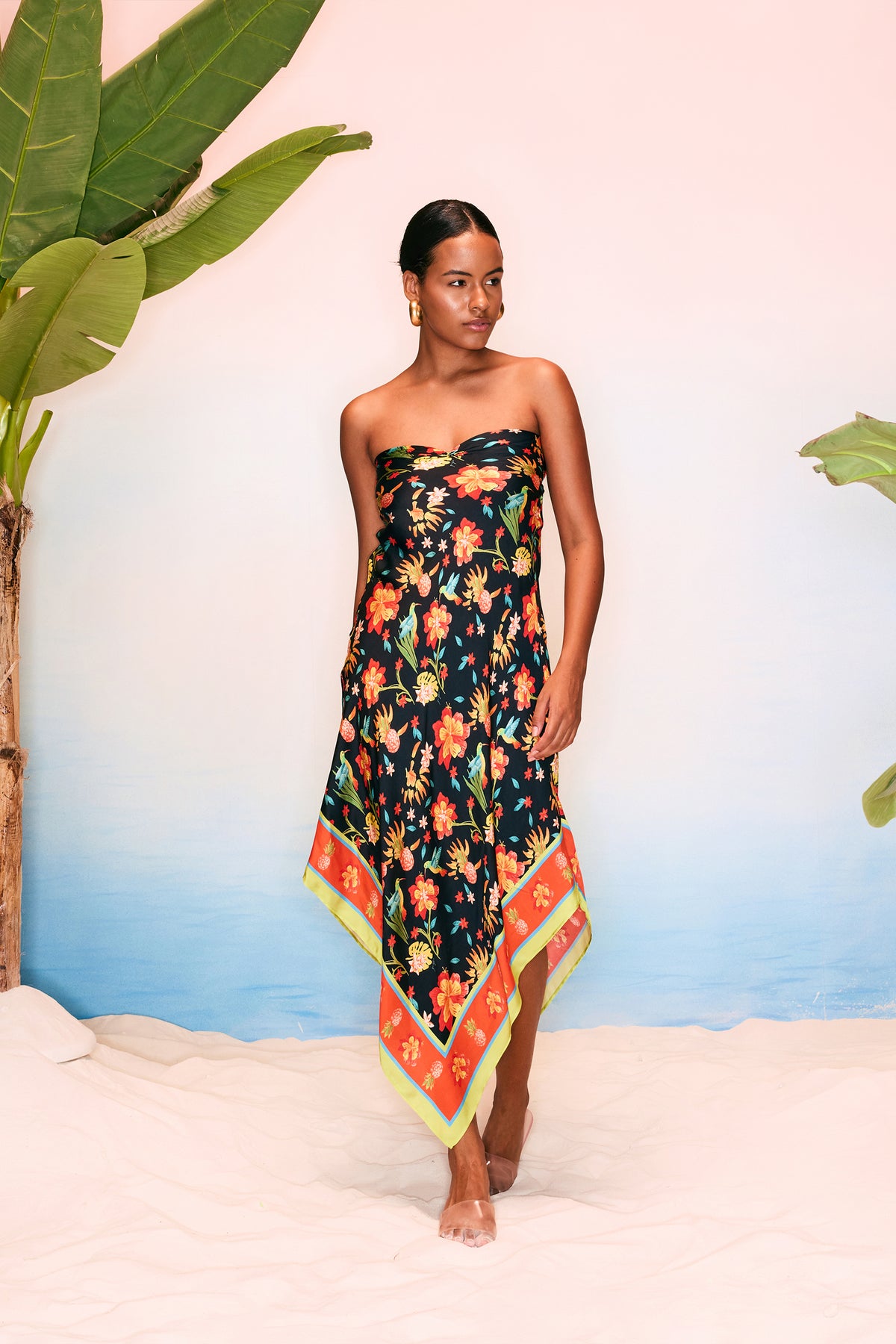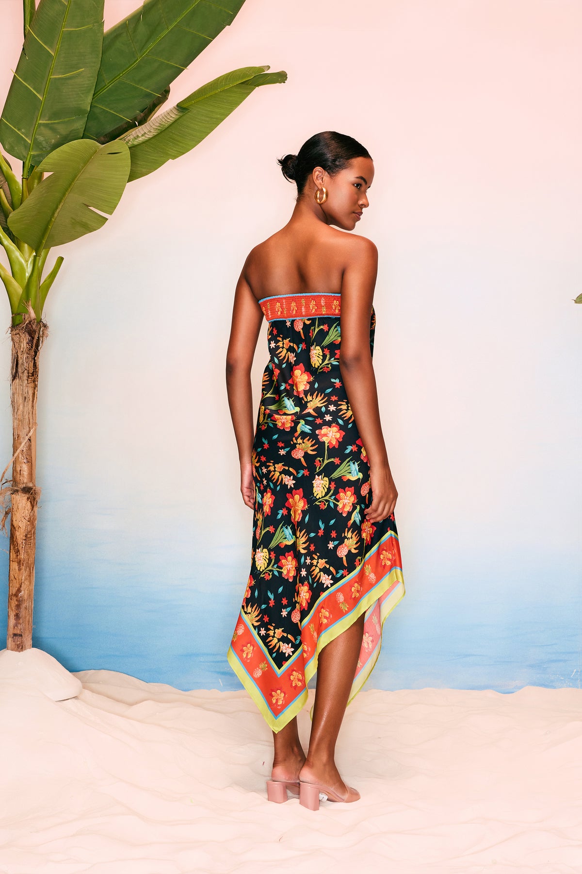 This chic tube dress with intriguing scarf print details will elevate your beachside resort wardrobe. Effortlessly transition from day to night with our stunning tube dress. Scarf border on the hem gathers on the bust back elastic