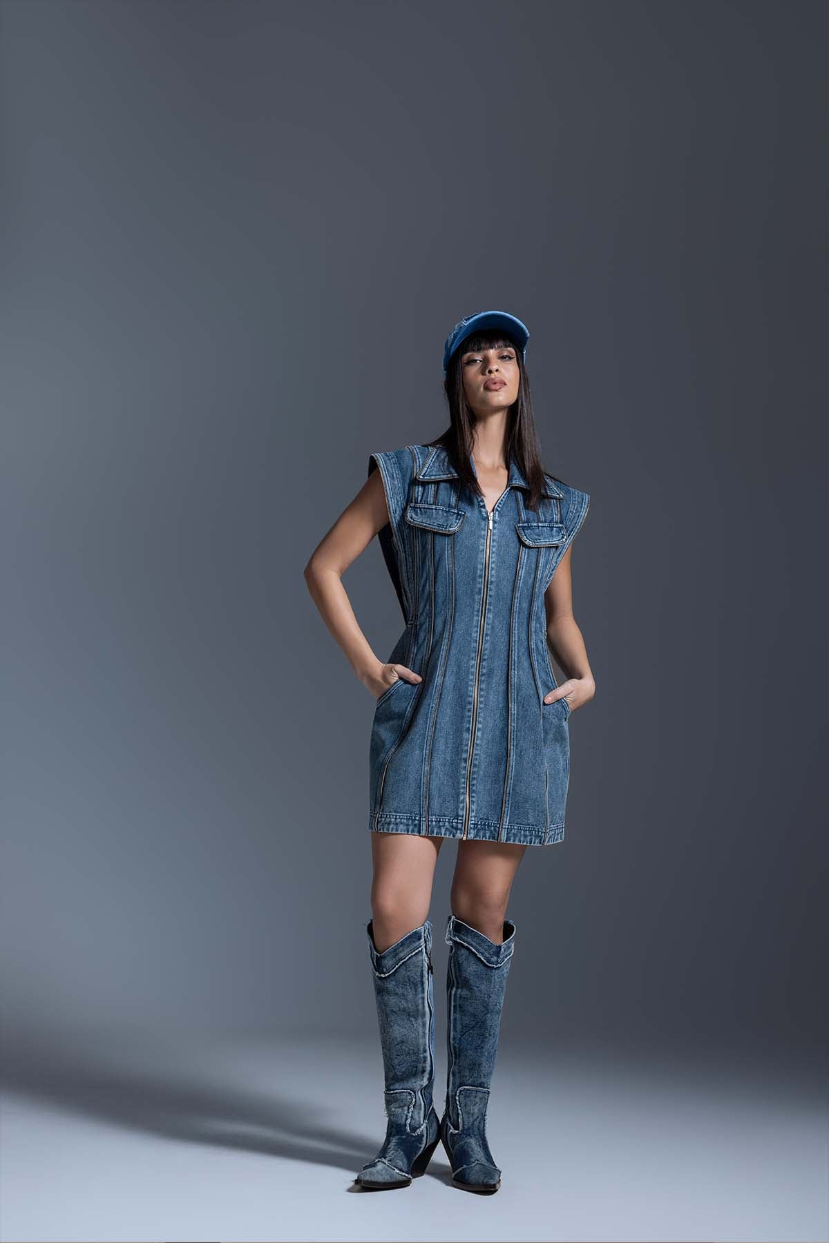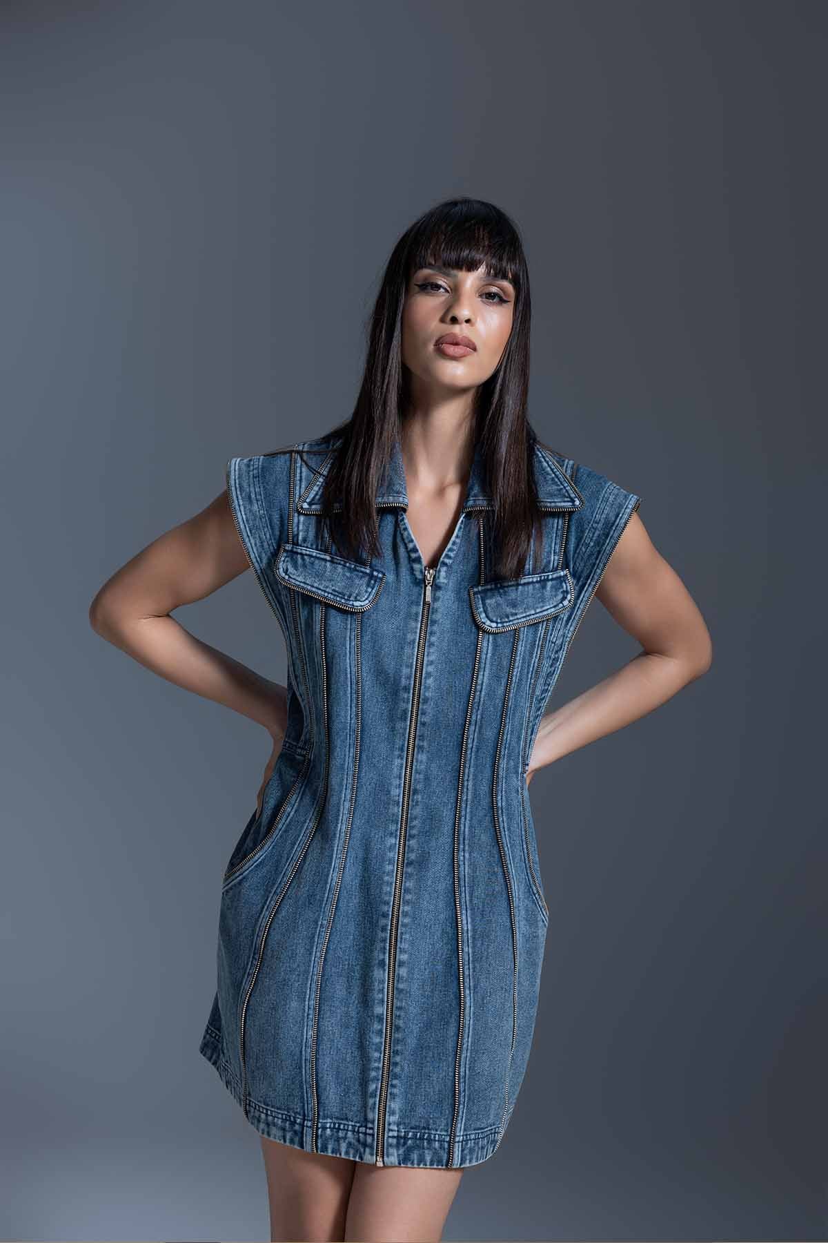 A sleeveless denim dress with vertical panels and zip detailing, featuring utility-style pockets and an easy, comfortable silhouette