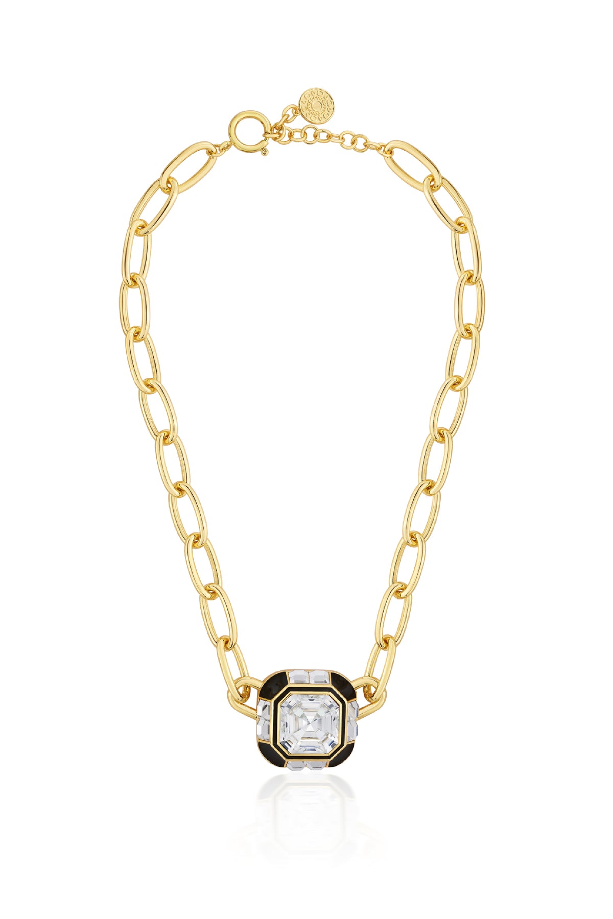 Indulge in luxurious sophistication with our optic chain link necklace. Made with 18-karat gold and signature colored plating in black, this necklace features delicate crystals for added elegance. Add a touch of exclusivity to any outfit with this exquisite piece.
