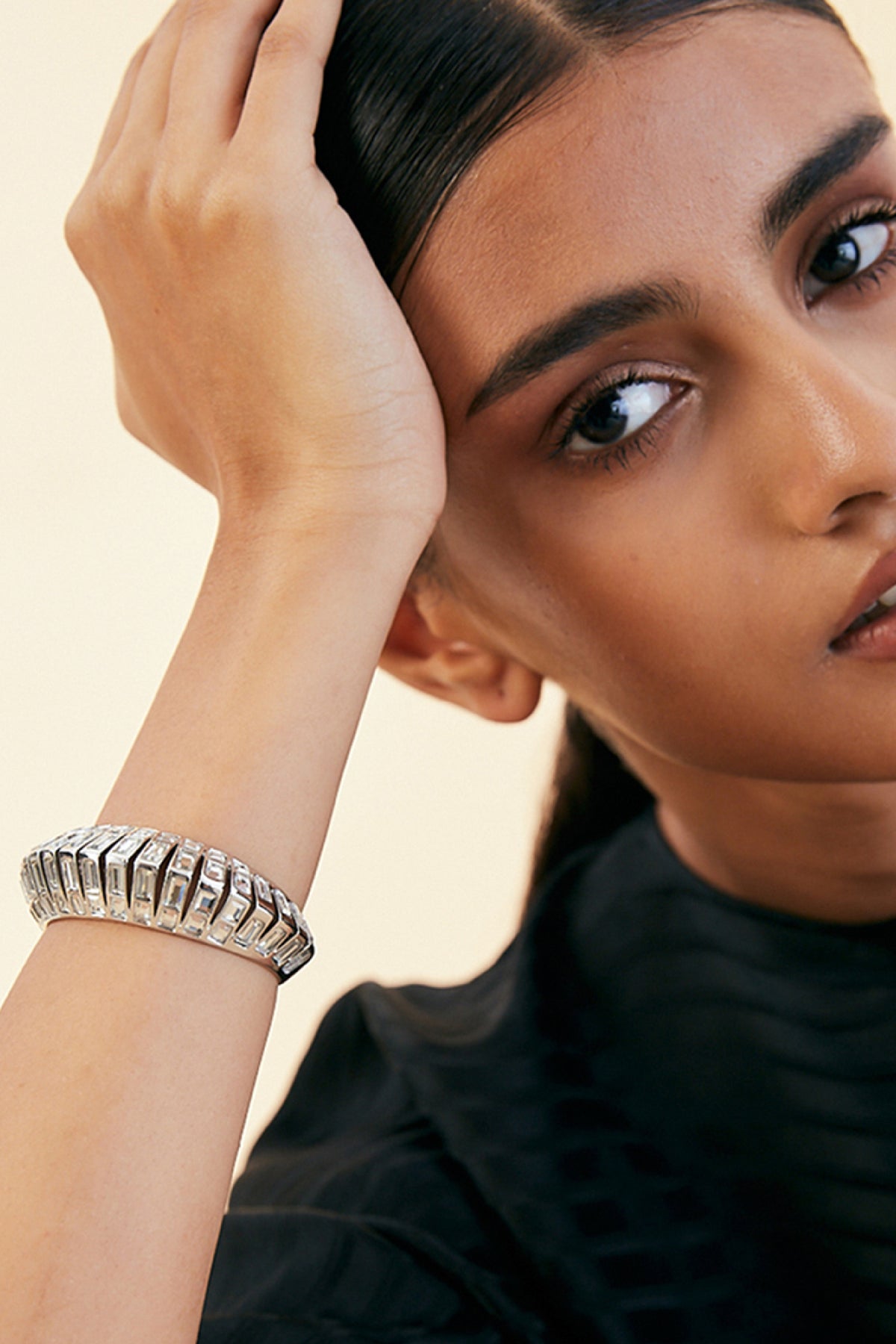 Handcrafted with mirror and rhodium plated brass. Wrists were made for more than just watches. Style this eye-catching wristwear over a sleeve for a high-fashion look and mix metals with its gold twin.