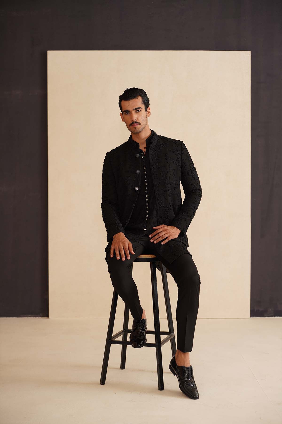 The beads bandhgala set in black features a hand-embroidered bead jacket crafted from sheer pure organza, layered over rich moga silk for depth and dimension.Paired with a matching loopy-button embroidered kurta and classic churi pants.