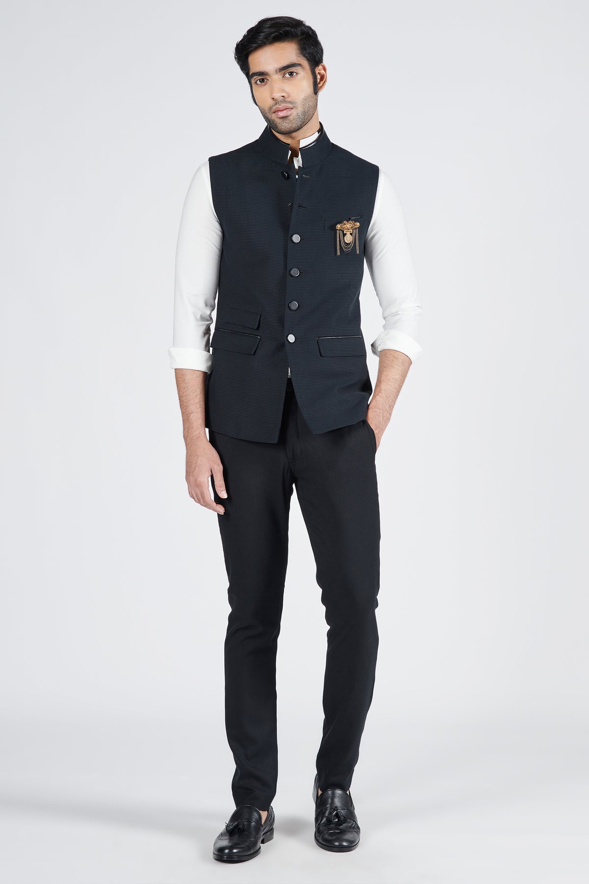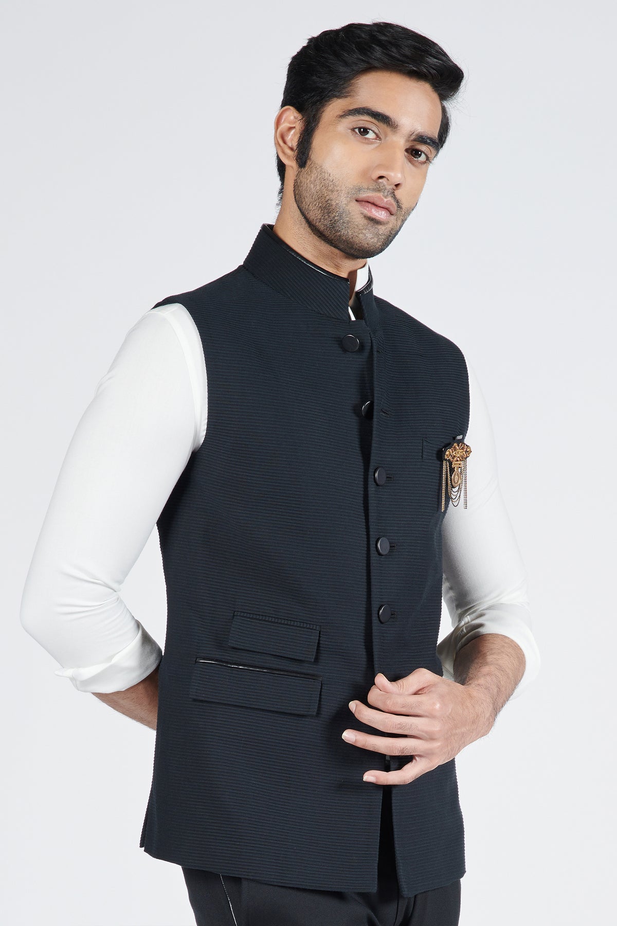 This textured waistcoat exuding sophistication and simplicity. The ensemble features faux leather finish on the nehruvian collar and flaps. Accessories like brooch is used for styling purpose only.