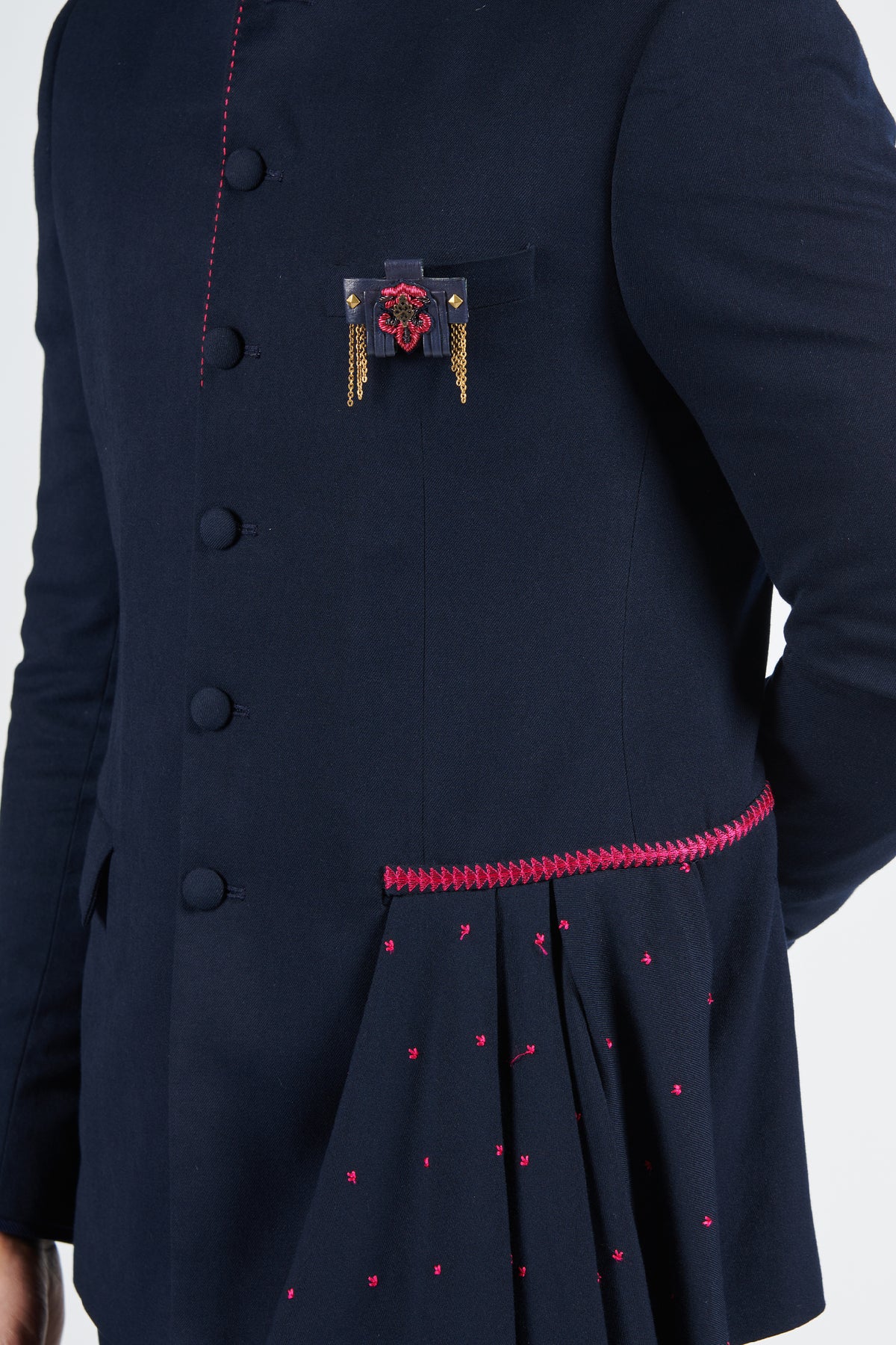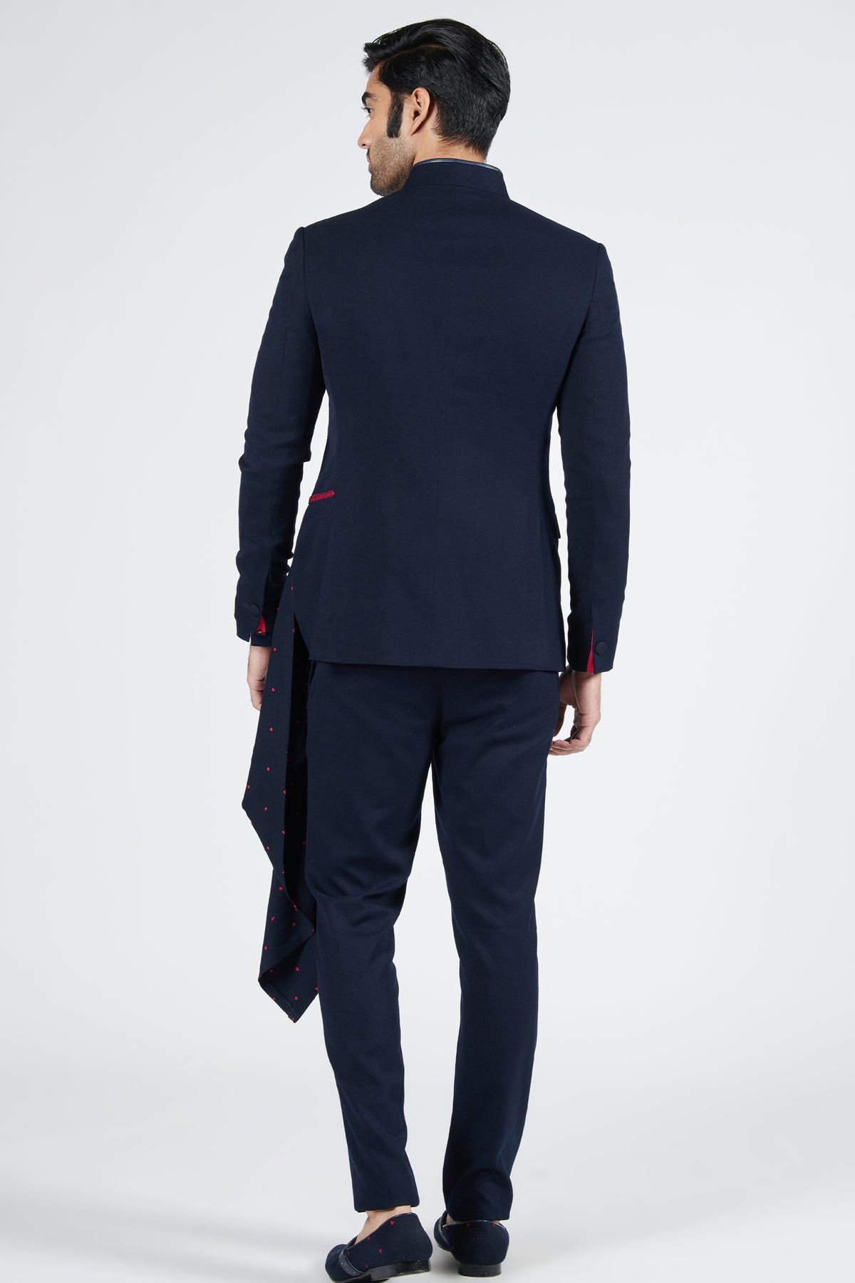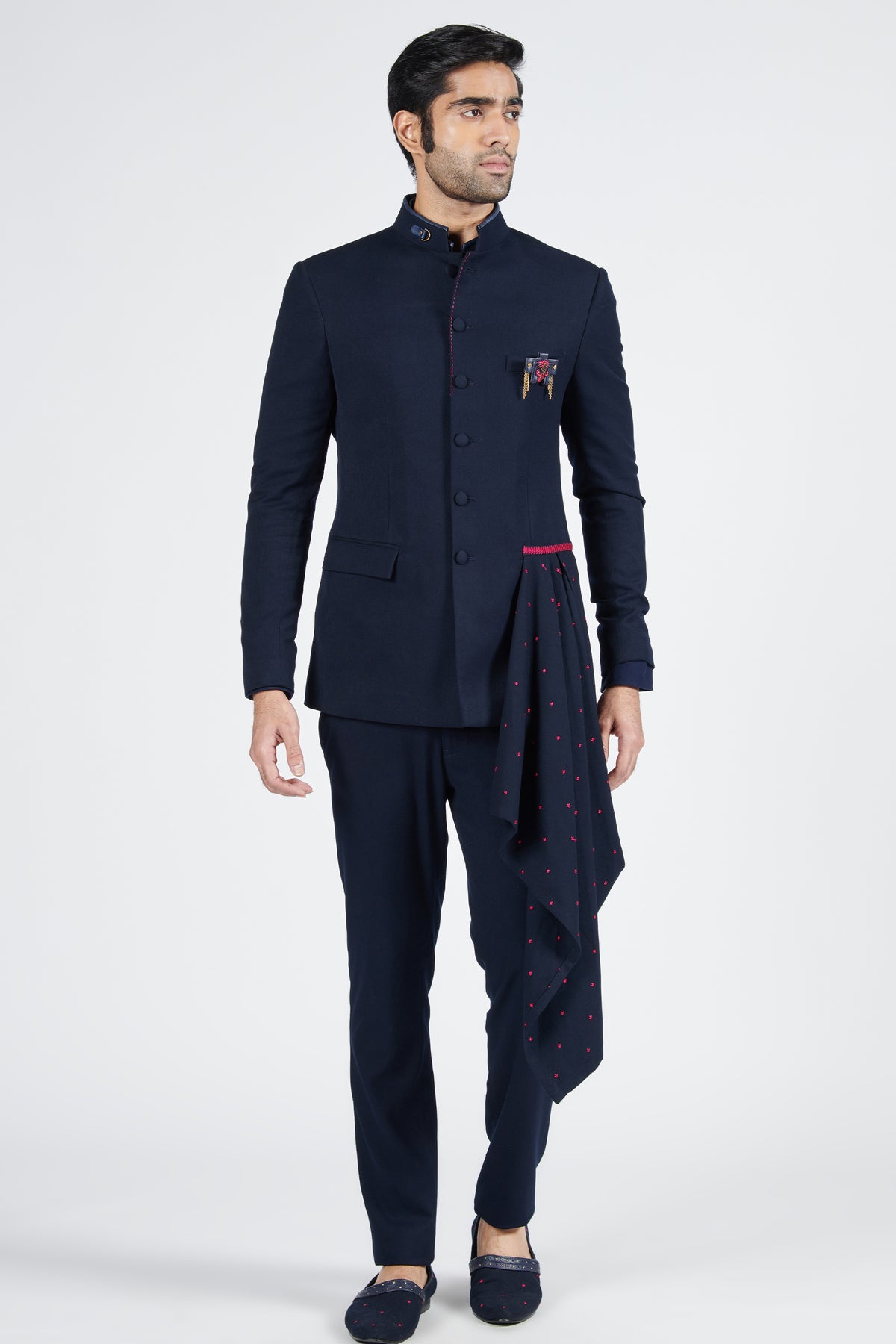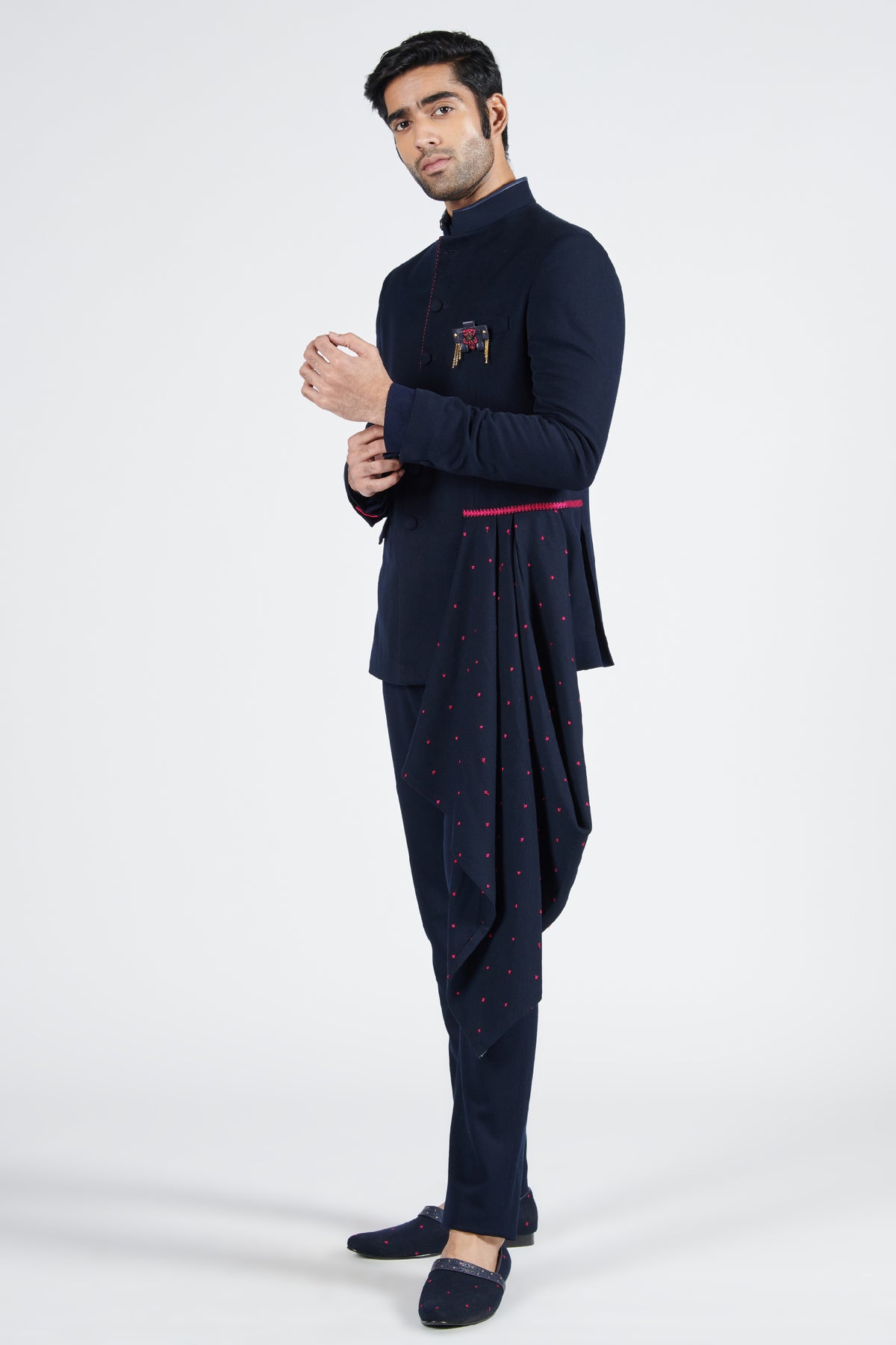 This anti-trend bandhgala features an amalgamation of structure and fluidity. The embroidered neo-drape exudes a modern vibe. Accessories such brooch is used for styling purpose only.