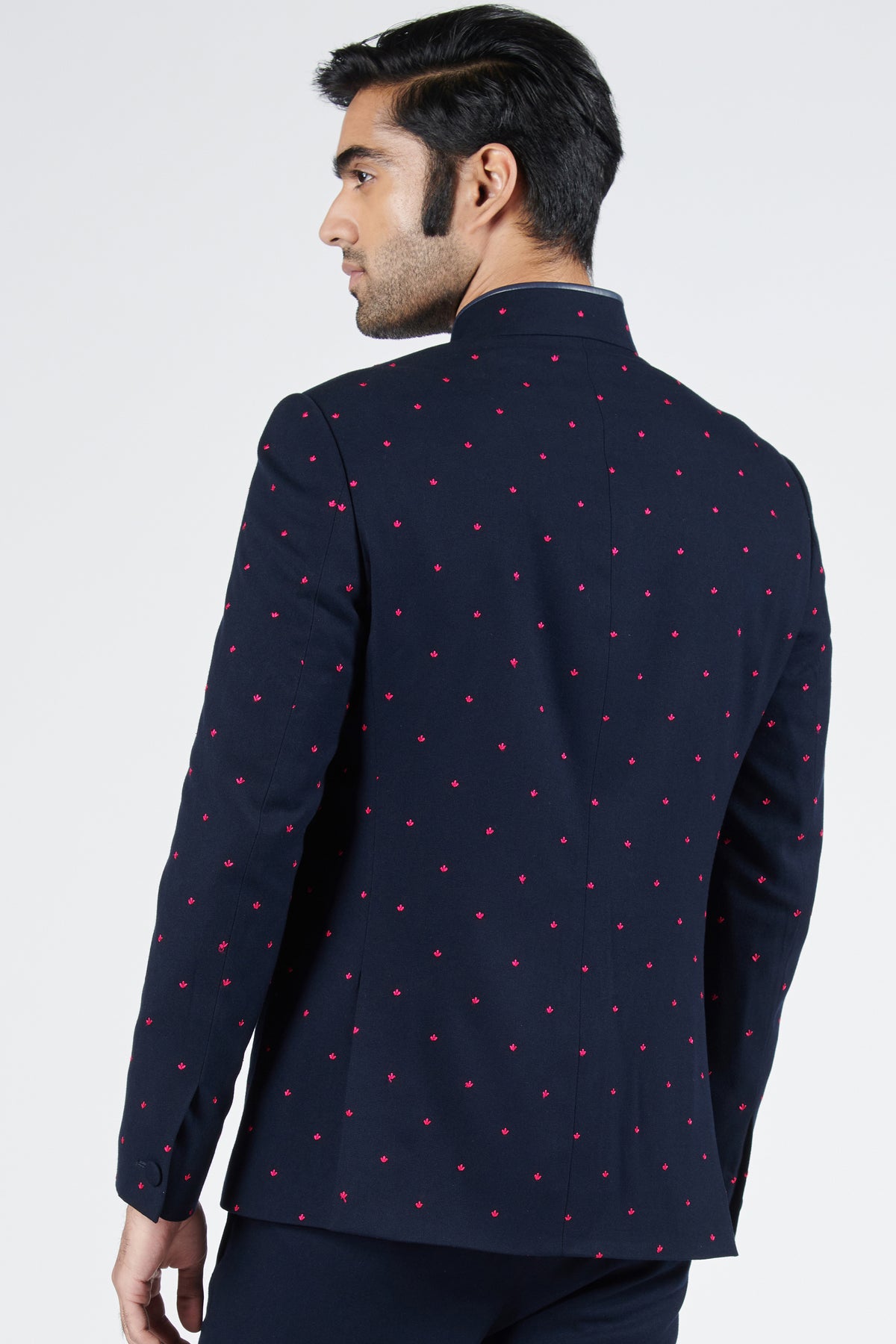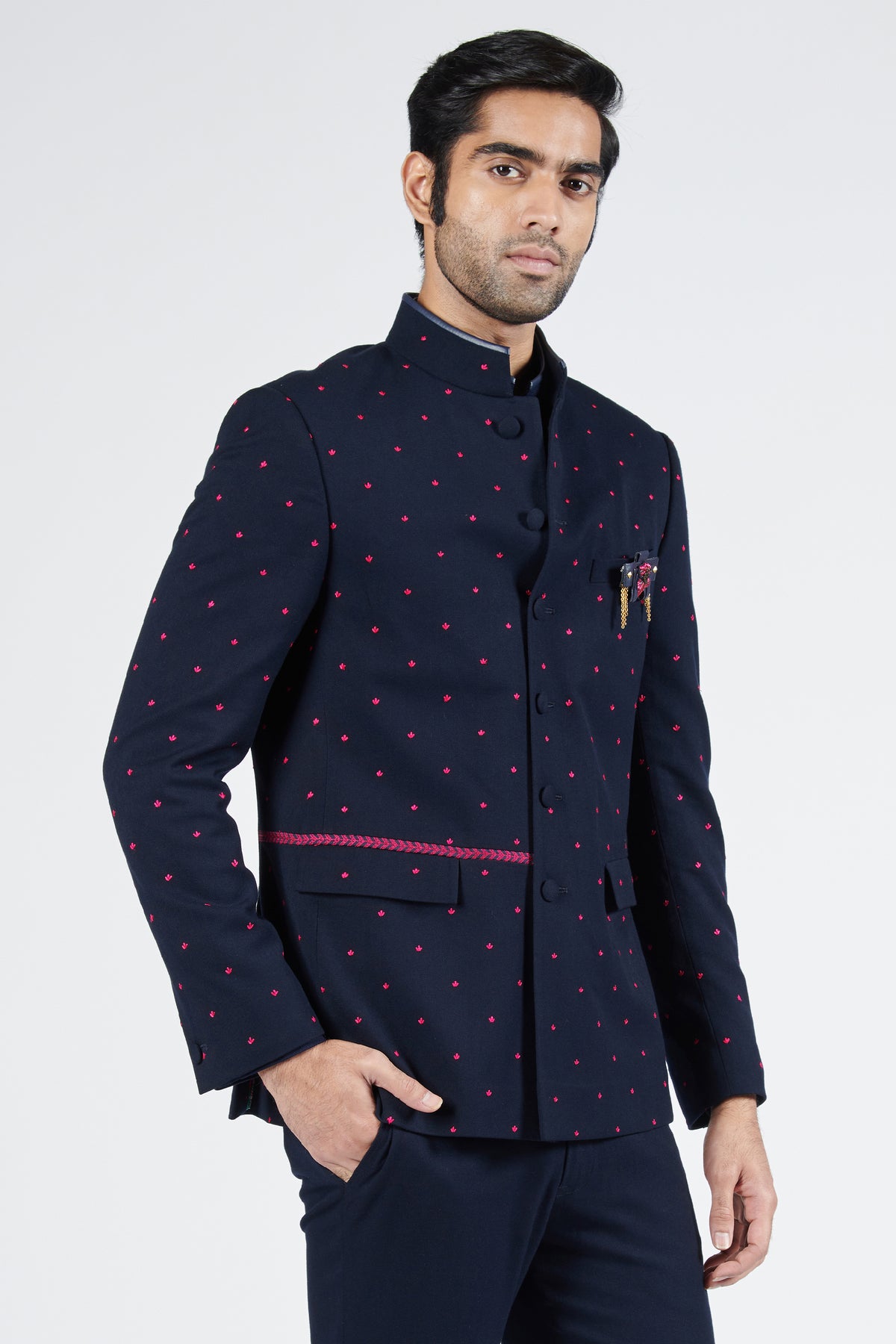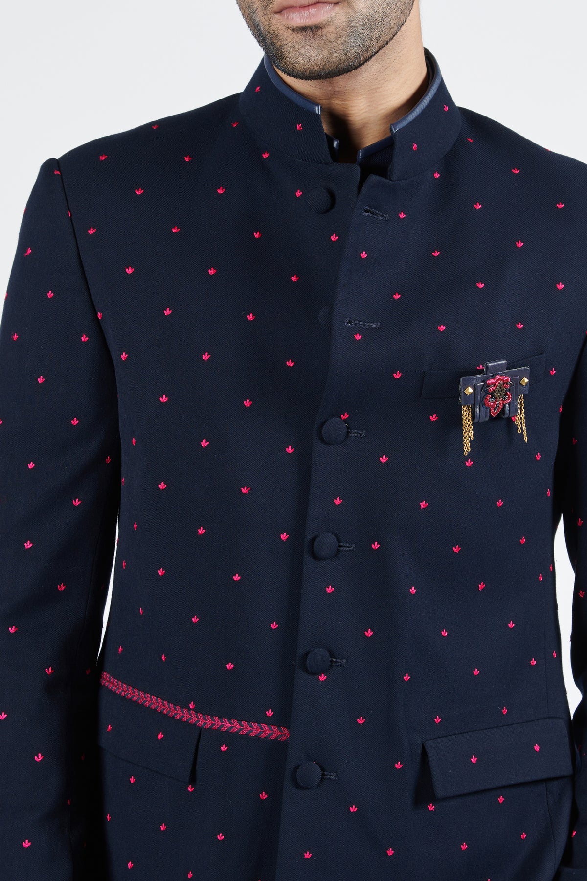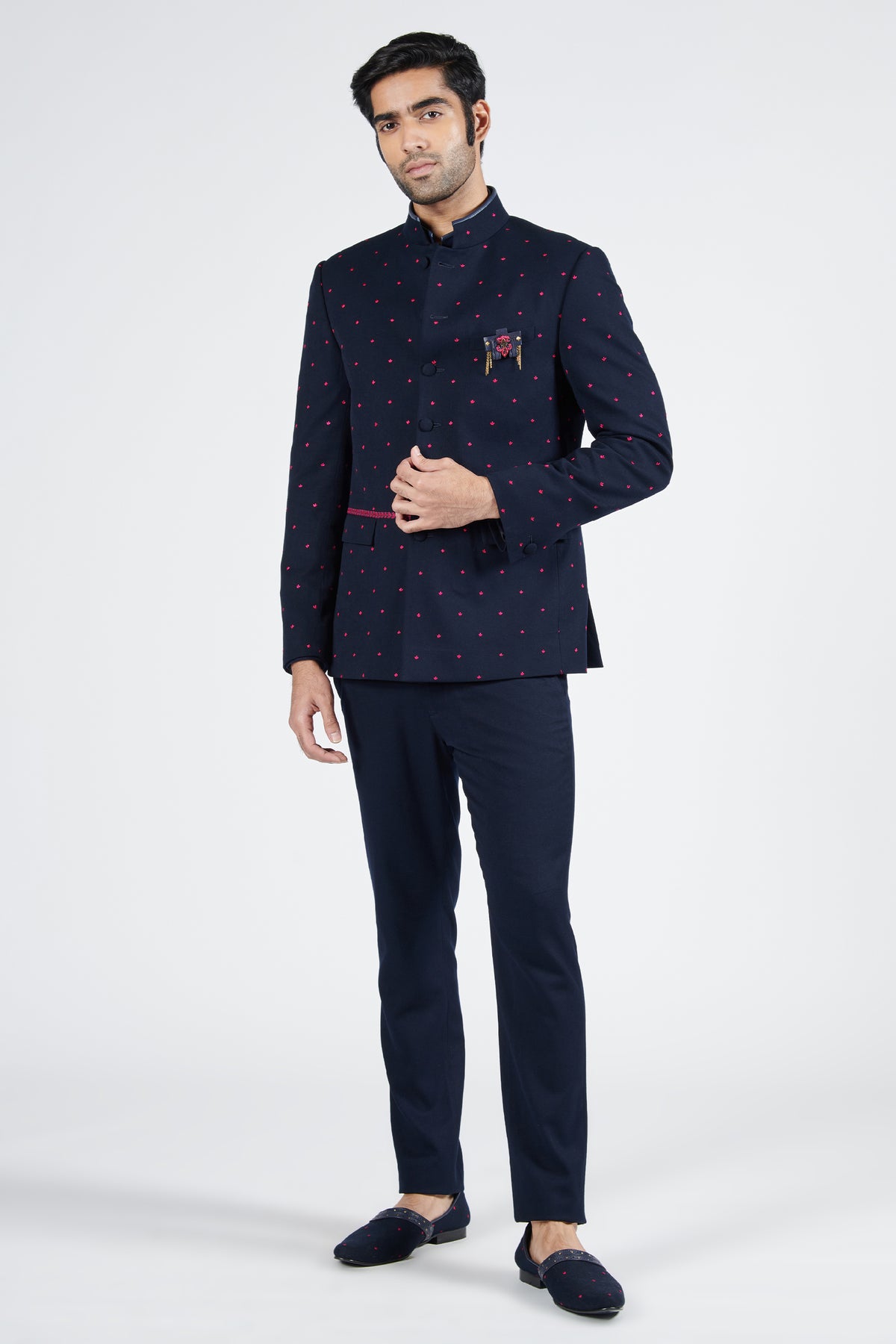 This navy celebration wear bandhgala features intricate contrasting thread polka work. Pair it with navy trousers for a perfect occasional wear ensemble. Accessories such as brooch is used for styling purpose only.