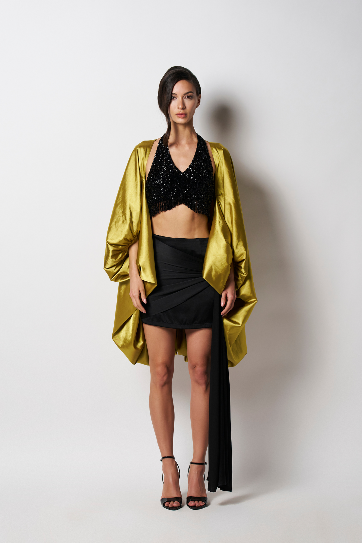 The kelly cape is a timeless piece that can be worn over a crop top or a shirt. It features balloon sleeves with a gathered hem for a dramatic touch. Designed to frame the body, it pairs perfectly with a top or ganji and jeans..