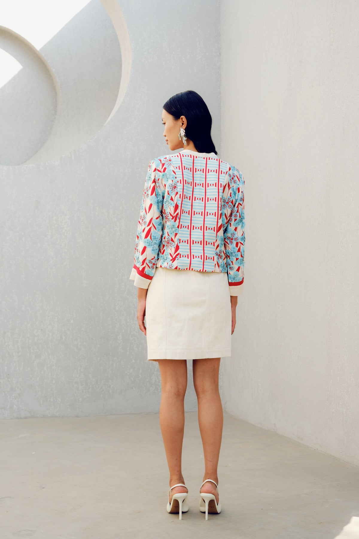 The white print play jacket is made of double georgette. It features both floral and geometric prints in classic prg style.