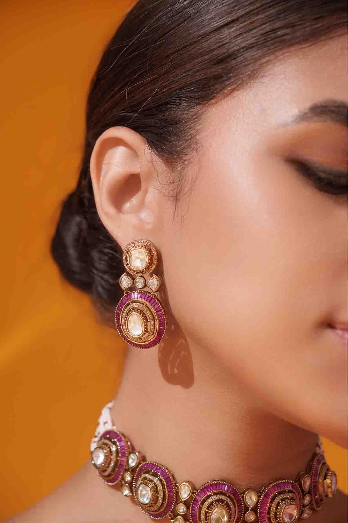 A regal choker adorned with shining moissanites in two tone finish. The touch of red stones adds a refreshing contrast, making it a perfect blend of heritage charm and timeless grace.