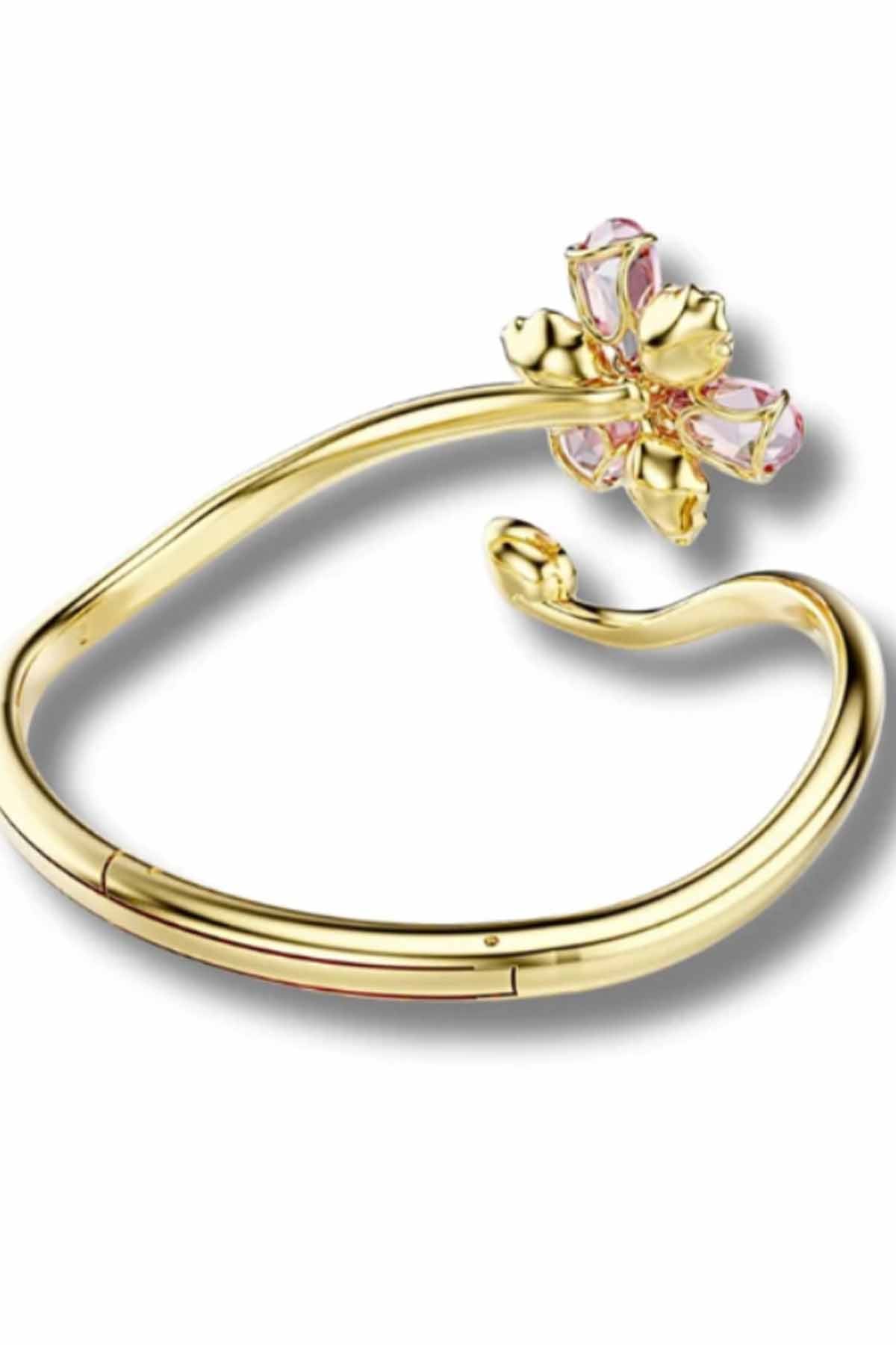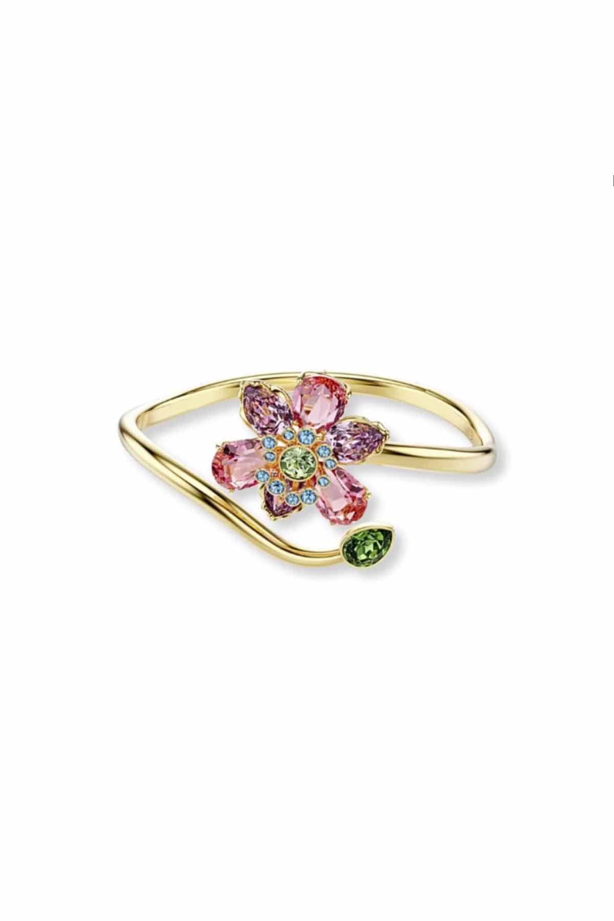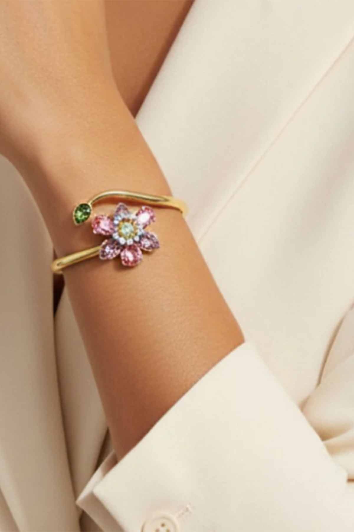 A graceful curve of light and color, the bloom arc cuff brings esme’s signature playfulness to life. A radiant floral cluster of pink and green swarovski crystals blooms at one end, while a single vivid green stone crowns the fluid gold arc at the other. The open design wraps the wrist with effortless elegance, blending softness with structure. Luminous, sculptural, and joyfully bold, this cuff is a wearable celebration of color in full bloom.
