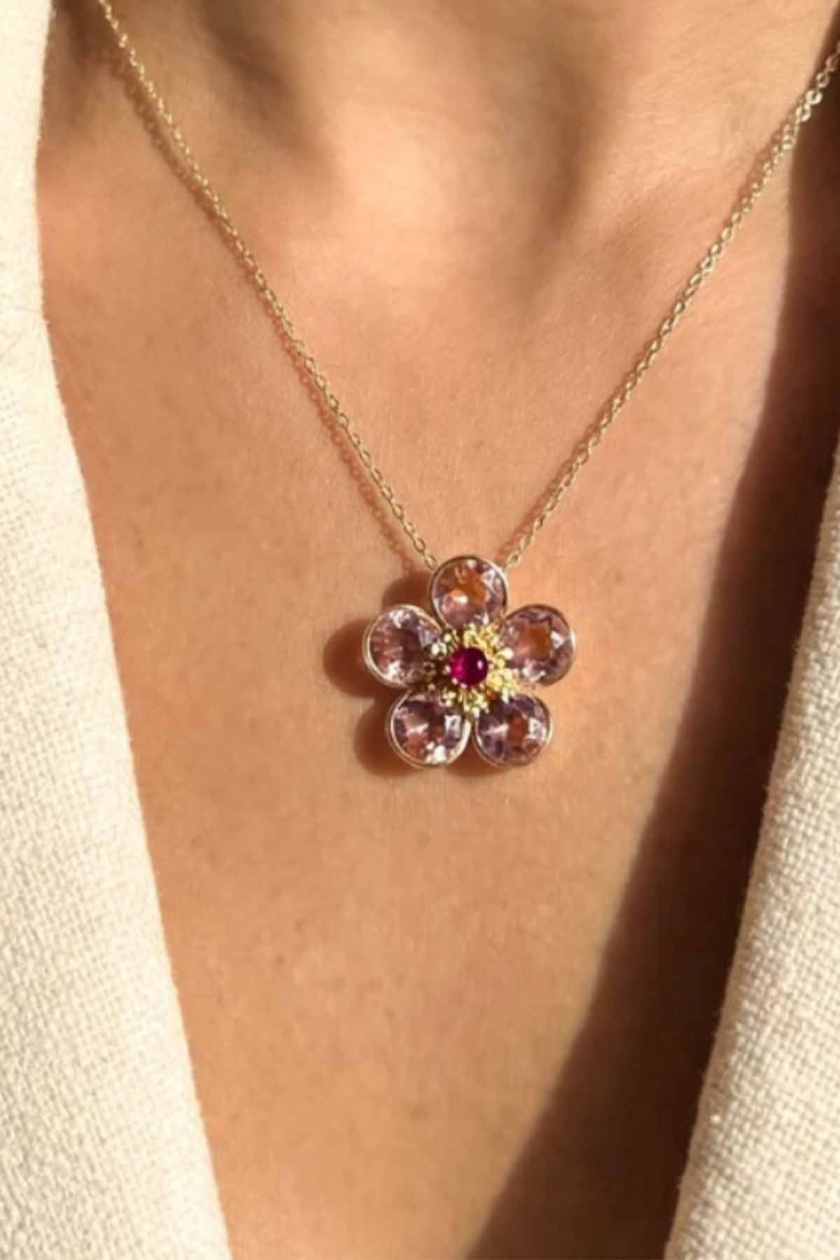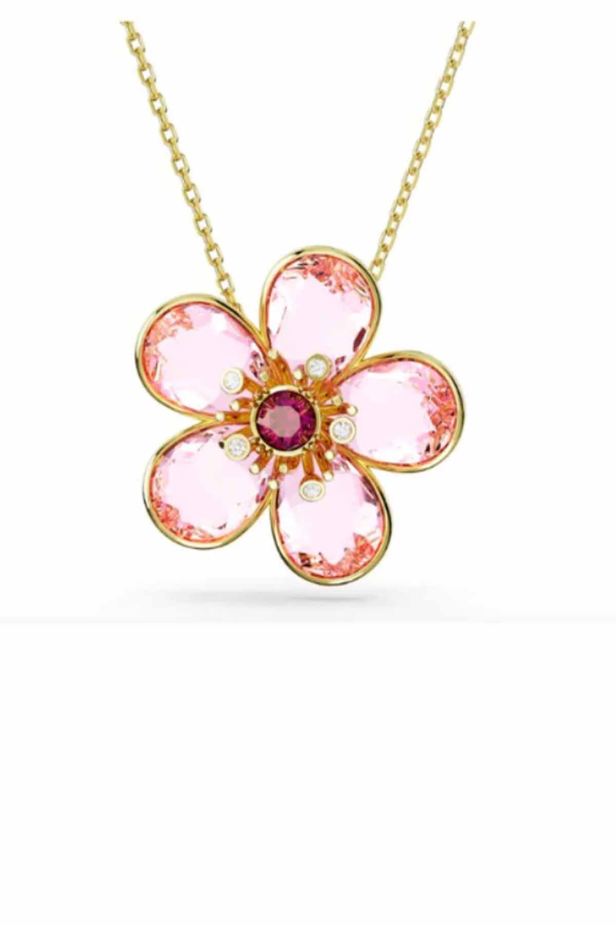 A soft bloom captured in crystal.The blush bloom pendant features petal-shaped swarovski crystals arranged in a delicate floral silhouette, centred with a radiant pop of ruby-toned sparkle. Feminine yet confident, this piece celebrates gentle strength, self-love, and the beauty of blooming in your own time.
