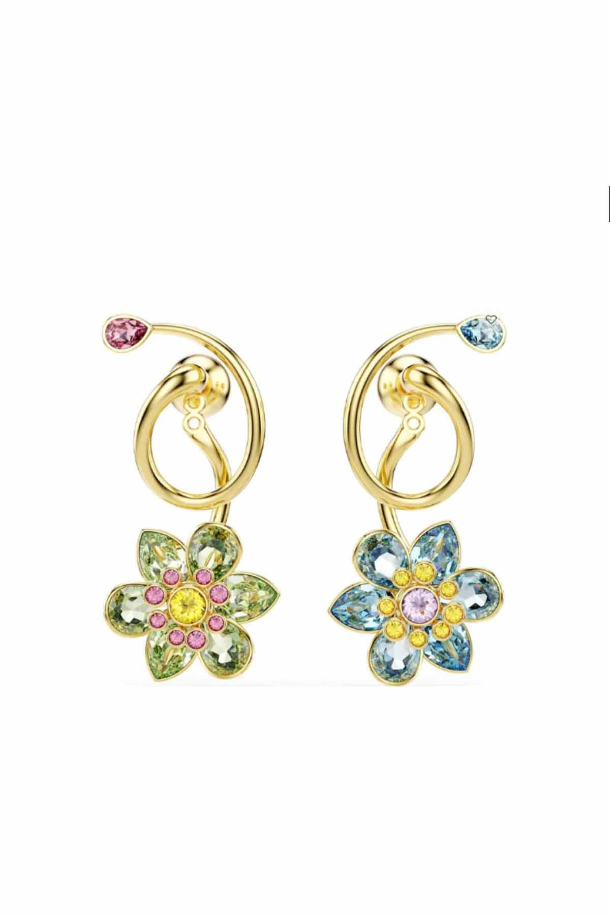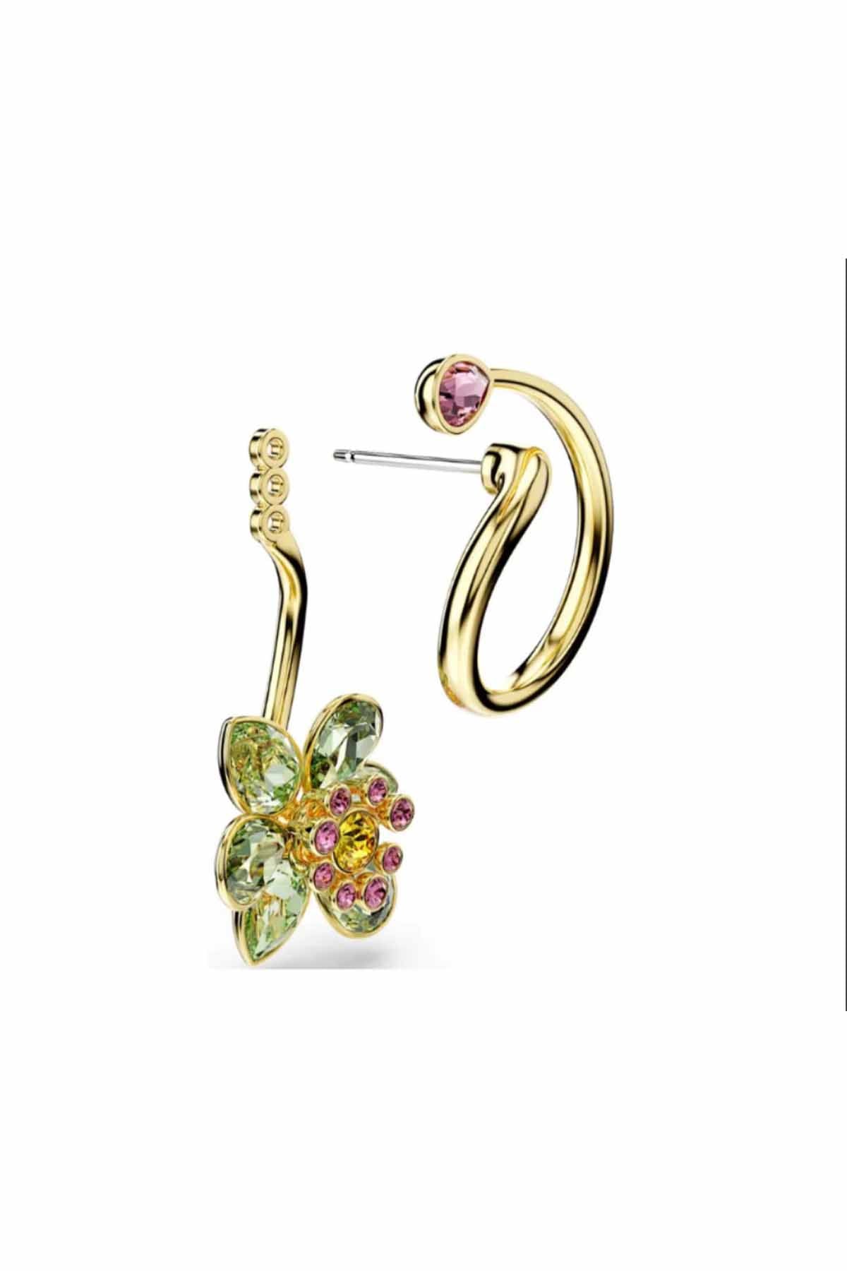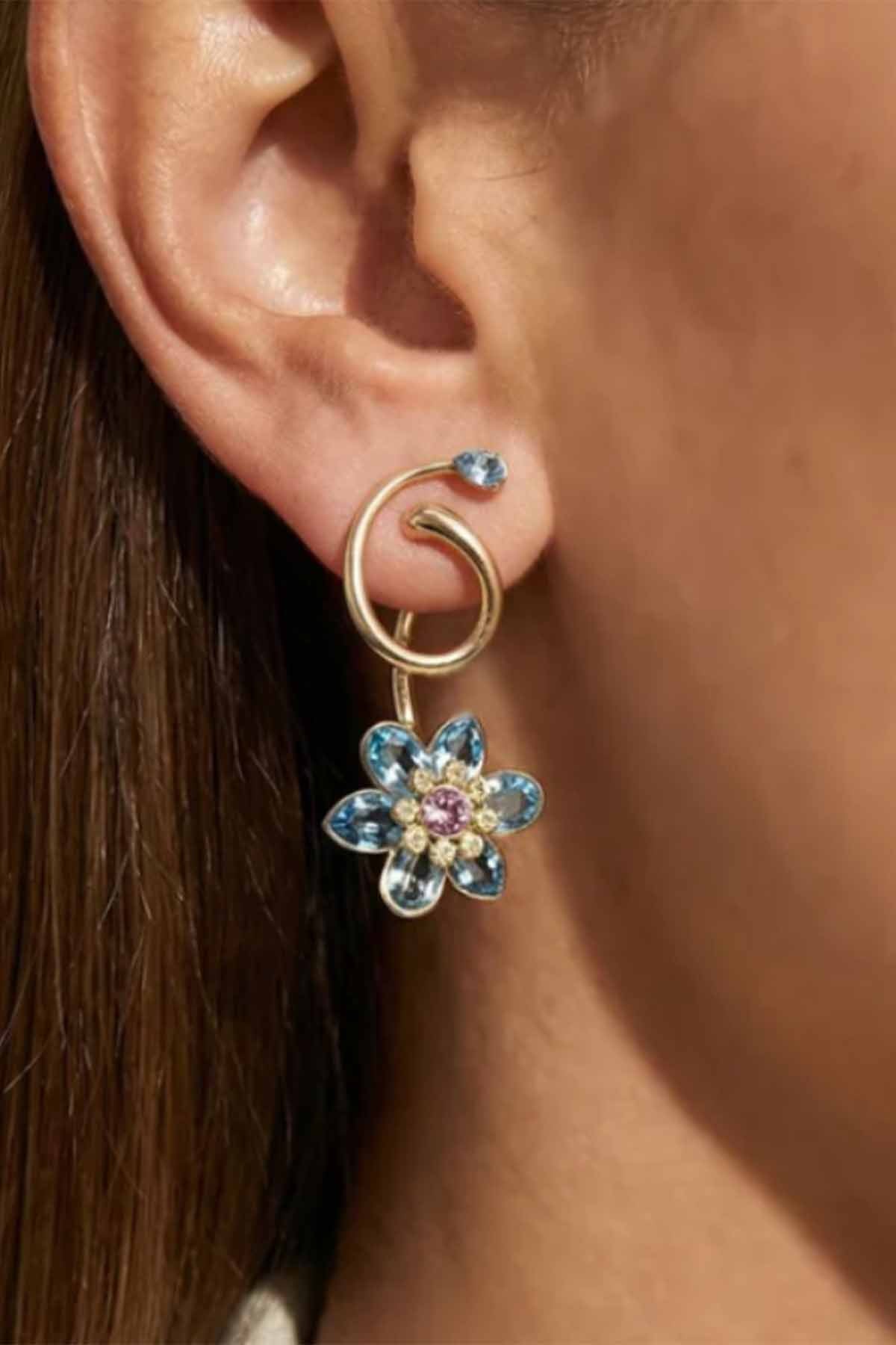 Designed to reveal a different expression with every turn, the irides drop earrings play with colour, form, and movement. Featuring a sculptural gold-toned loop and a statement drop, one side shimmers in cool blue hues while the reverse glows in soft green crystals. The dual-tone design creates a subtle shift as you move. Fluid, expressive, and quietly bold. A modern statement for those who embrace contrast and individuality as part of their everyday style.