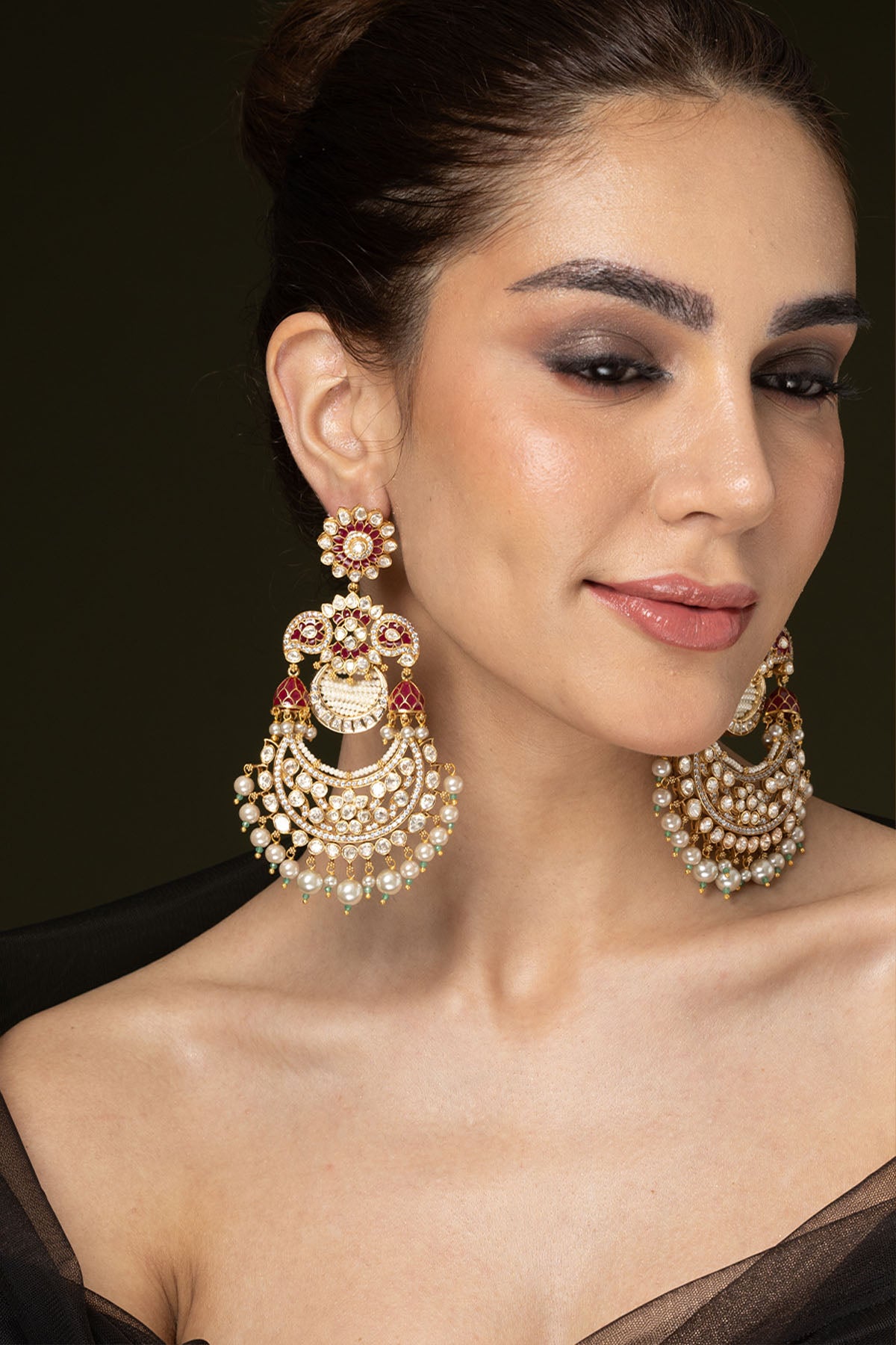 Stunning oversized chaandbaali earrings accented with rich ruby-toned stones and brilliant clear accents. The crescent base is beautifully finished with multiple hanging pearl clusters, perfect for a grand gift.