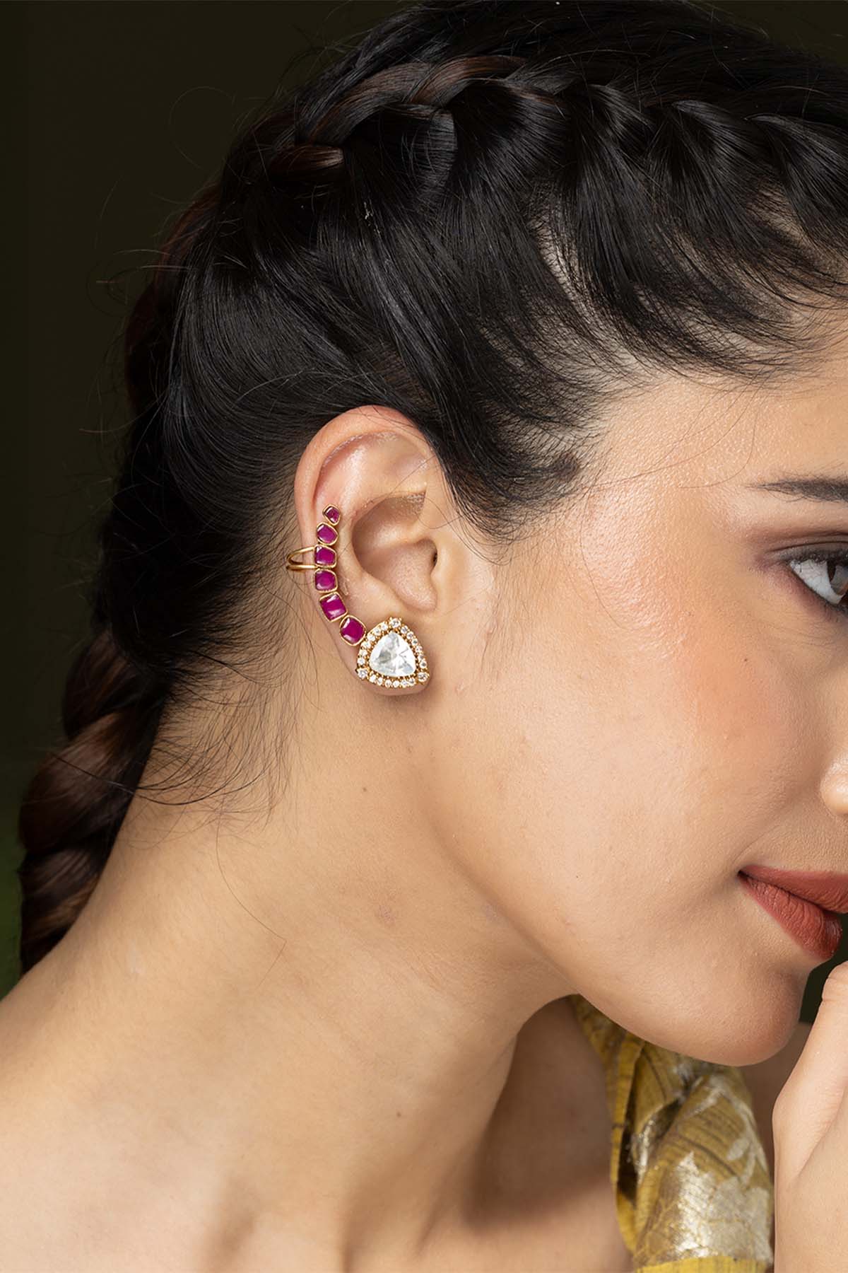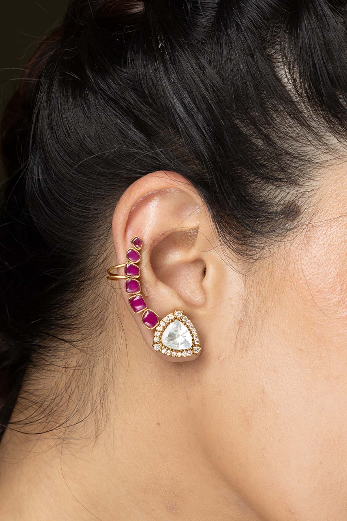 Make a bold statement with these ruby serpent cuff earrings. Designed with intricate curves, gleaming gold finish, and striking ruby accents, they bring a royal flair to your look. Perfect for festive occasions or glamorous evenings.