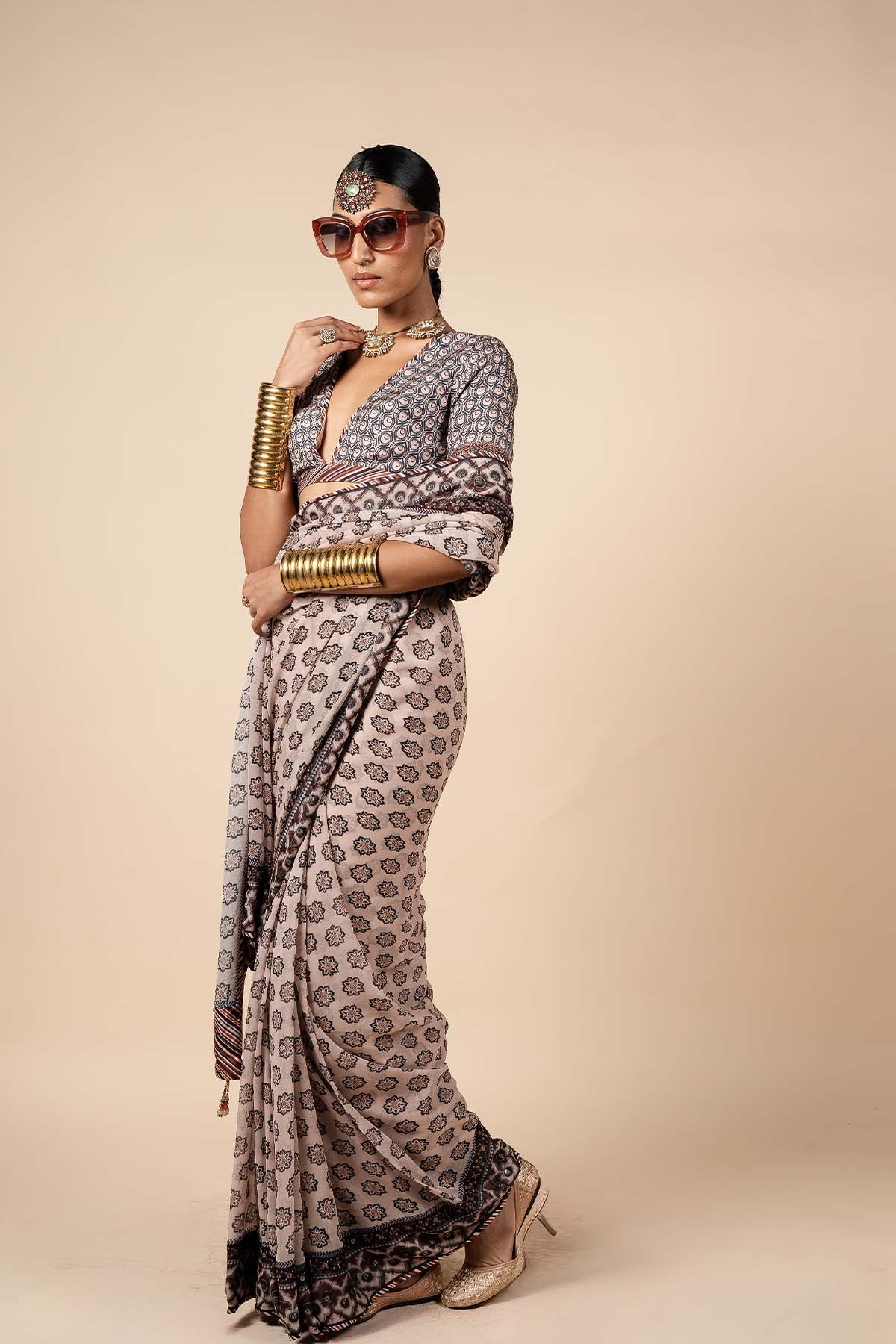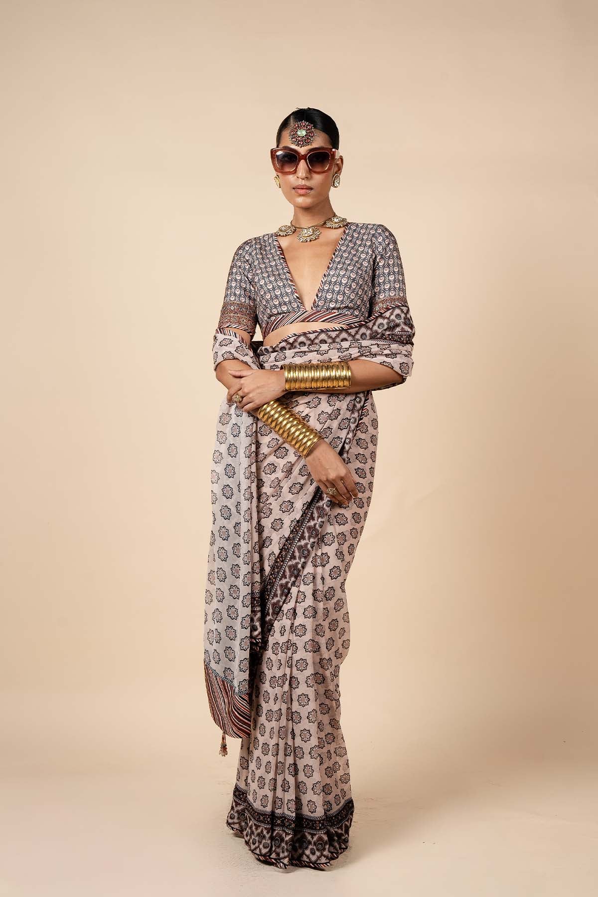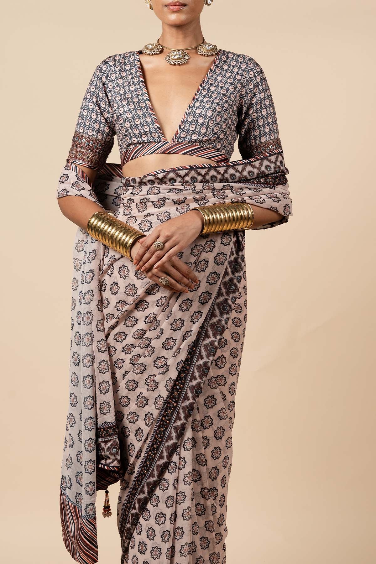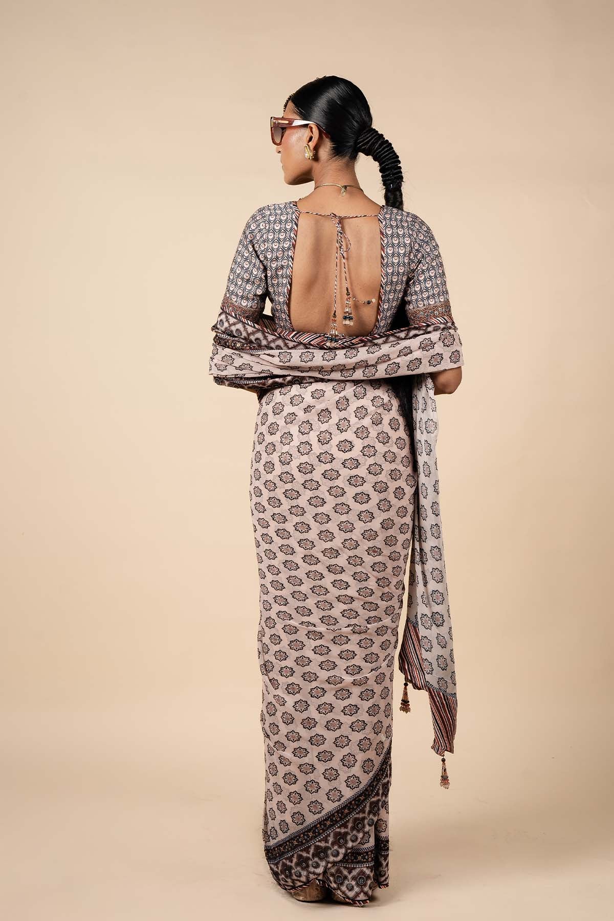 The blouse, crafted from Viscose in a stunning mix of midnight blue and blush nugrey, is adorned with intricate dori and zari work along the sleeve hem, accented by antique sequins. A stylized art deco pattern graces both the blouse and the Viscose Georgette saree, creating a harmonious blend of traditional and modern elements. The saree is further enhanced by antique sequin work along its border, adding a touch of timeless elegance to this beautifully coordinated ensemble.
