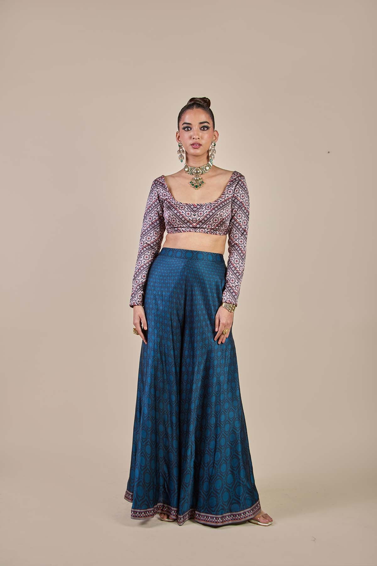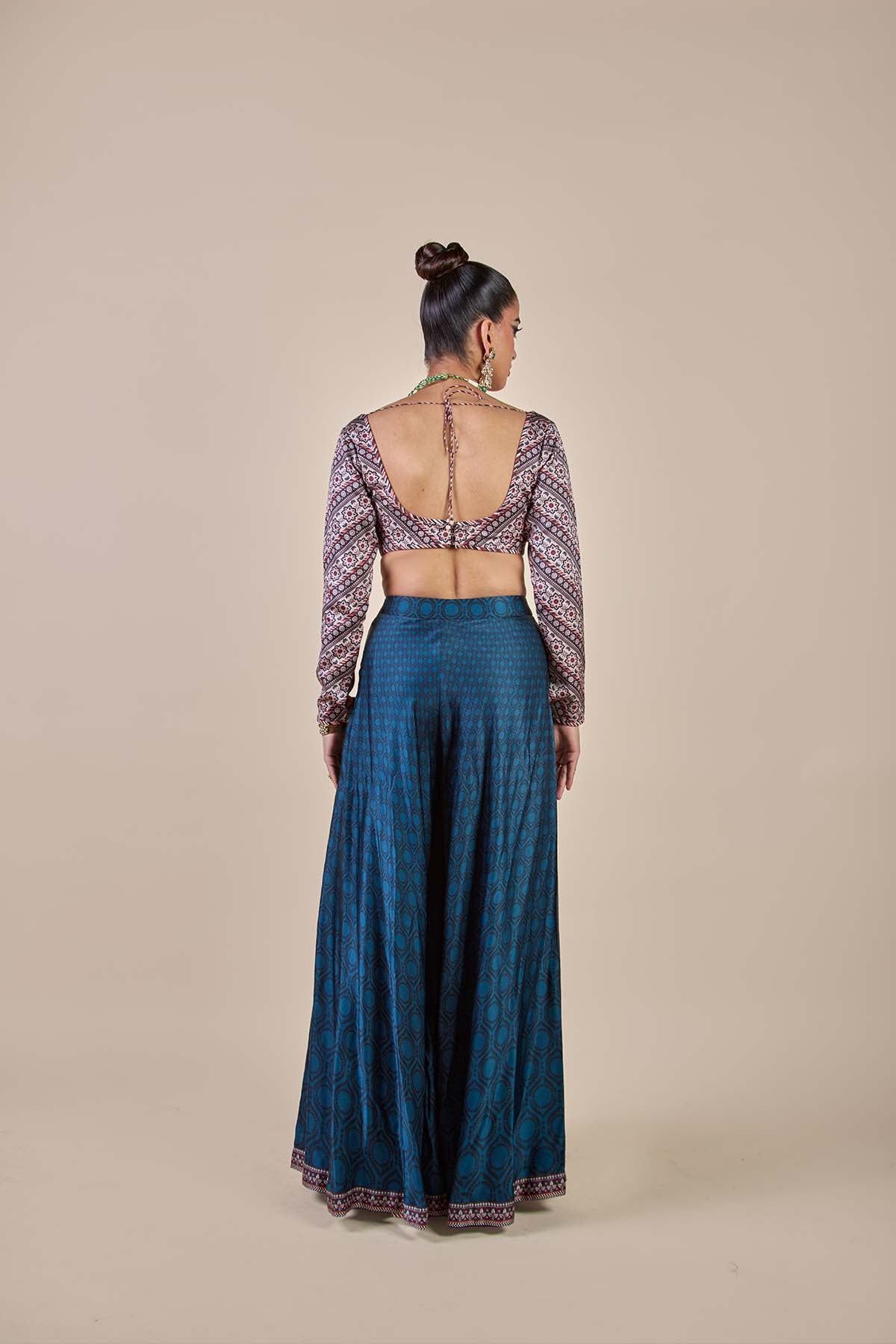 The capri blue - multi hued sharara set features a plunge-neckline blouse adorned with a nomadic print and straight-fit sleeves. It is paired with tonal allover printed bias-cut sharara pants for a fluid silhouette..