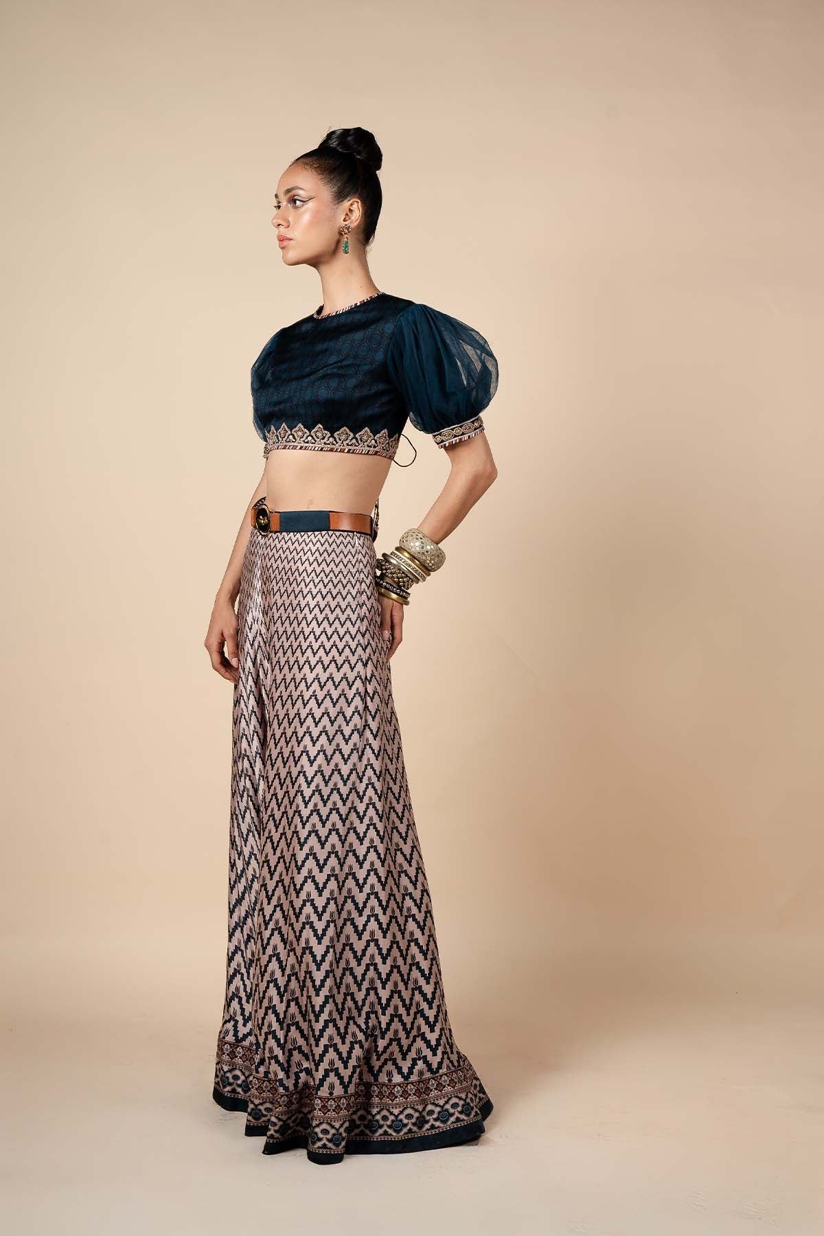 The midnight blue blouse, crafted from satin linen, features tulle sleeves with intricate dori and zari work, accented by antique sequins on the hem and sleeves. A stylized geometric print adds a modern touch. Paired with a nugrey sharara, its smooth texture and subtle print create a look that is both refined and striking.