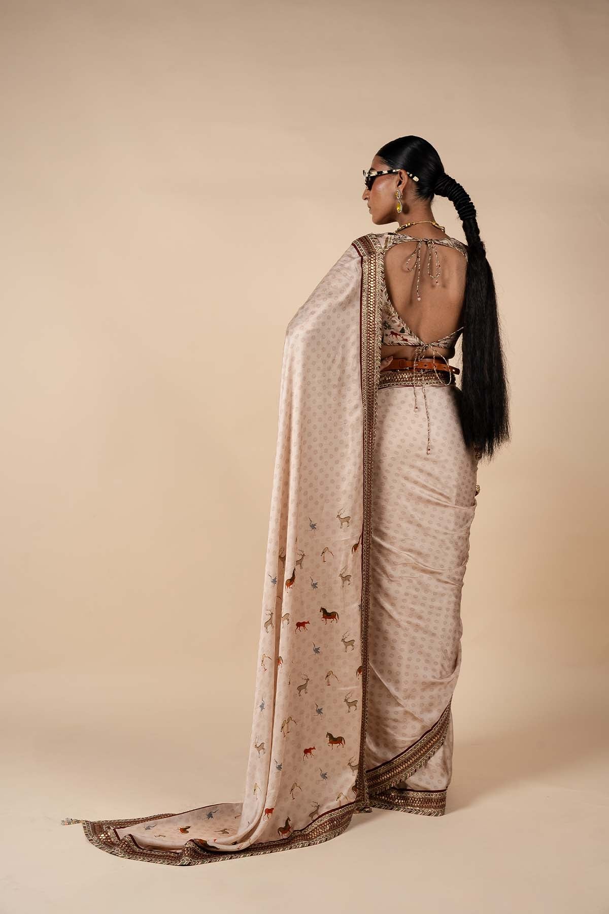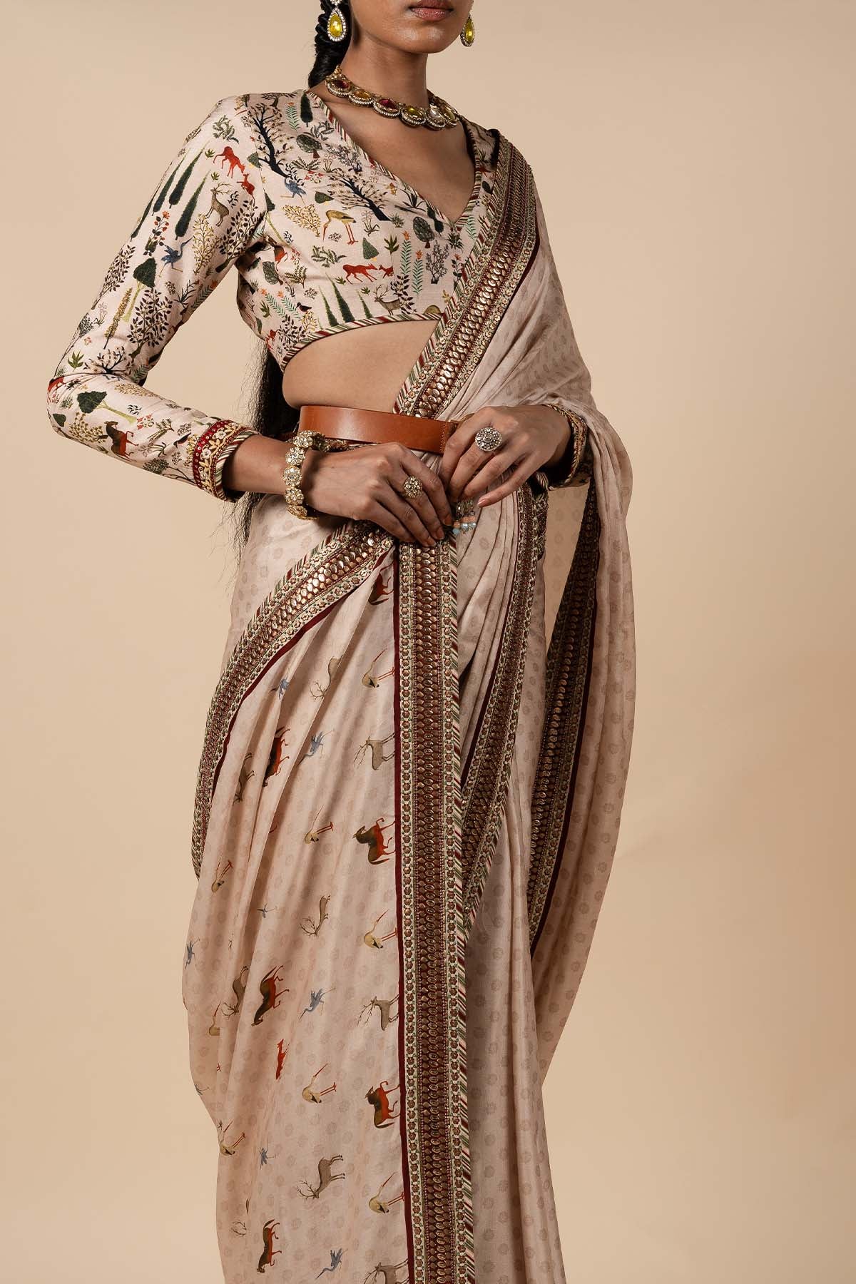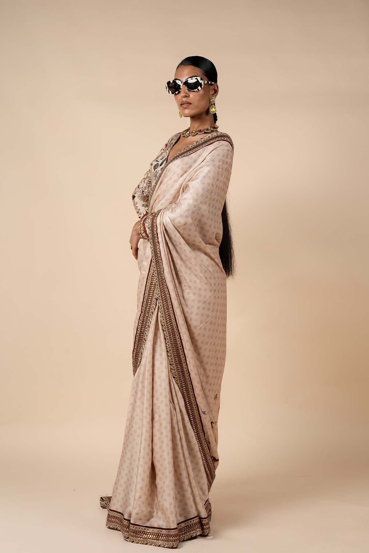 The saree set, in a soft powder pink hue, exudes elegance with its delicate details. The blouse, crafted from viscose, features a beautiful flora and fauna print, while intricate threadwork with sequins adorns the sleeve hem. The saree is enhanced by a tonal floral buti print throughout, with a captivating fauna print on the pallu, adding a unique and graceful touch to the ensemble.