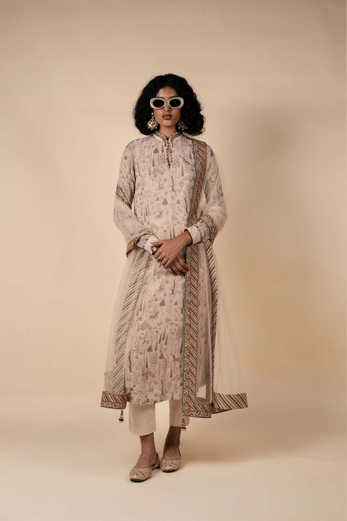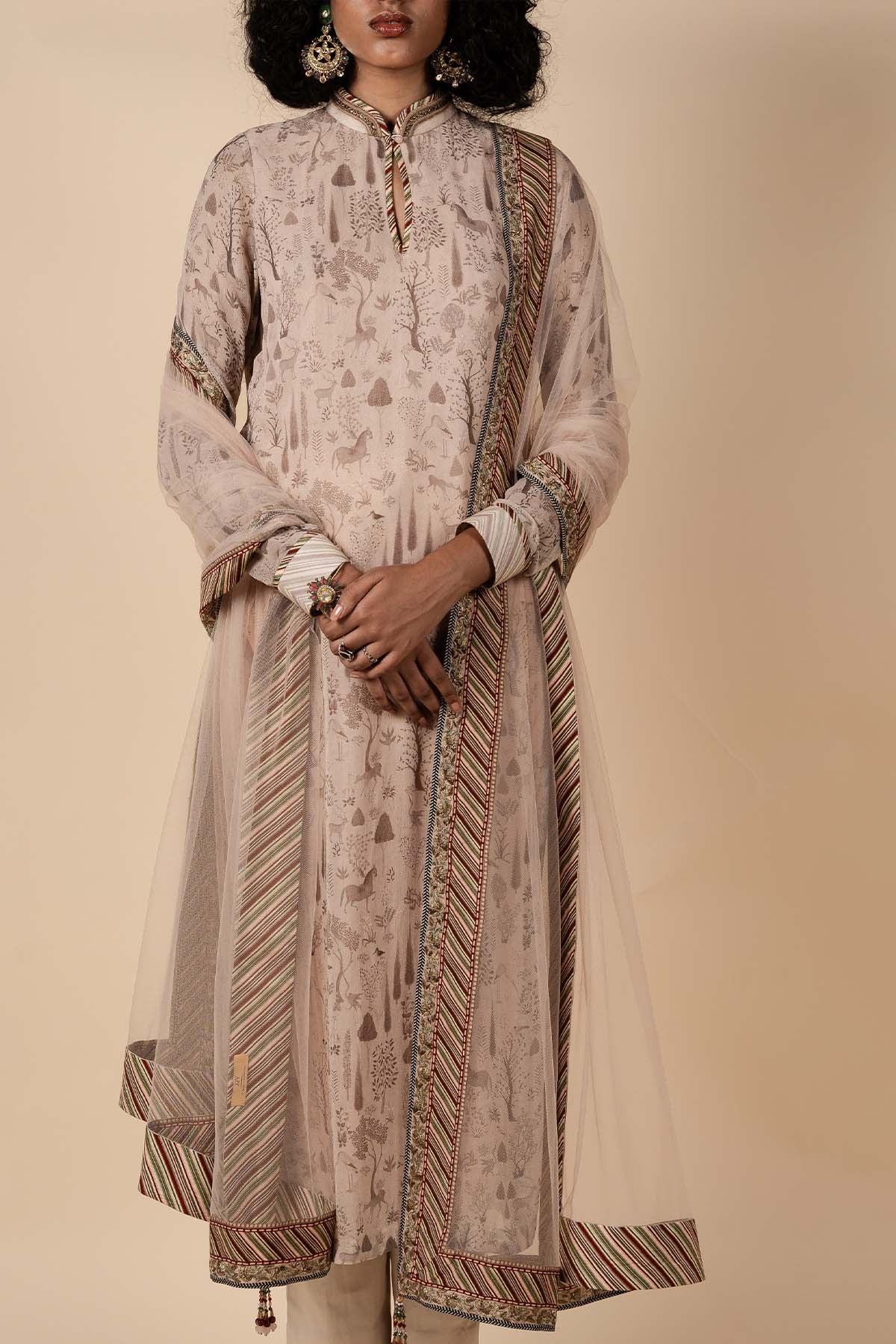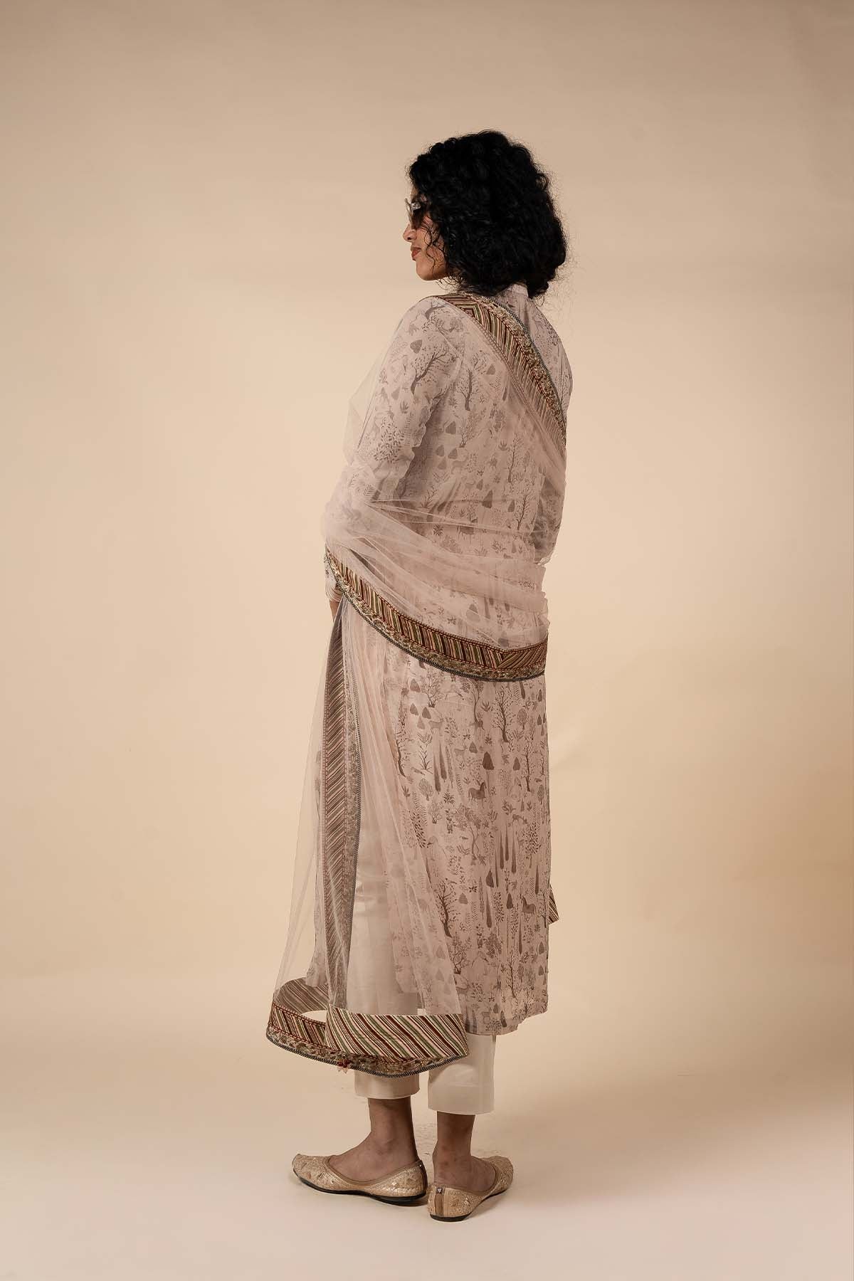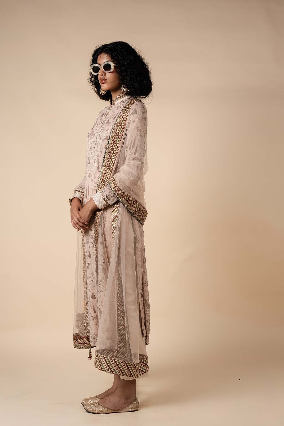 The powder pink tunic is stunningly adorned with a delicate flora and fauna tonal print, giving it an ethereal and graceful charm. Around the neckline, intricate dabka, zari, and crystal work come together with exquisite anchor threadwork embroidery. The tunic, made from Viscose Georgette, flows elegantly, adding to its soft and feminine allure. This design beautifully blends artisanal craftsmanship with timeless elegance.
