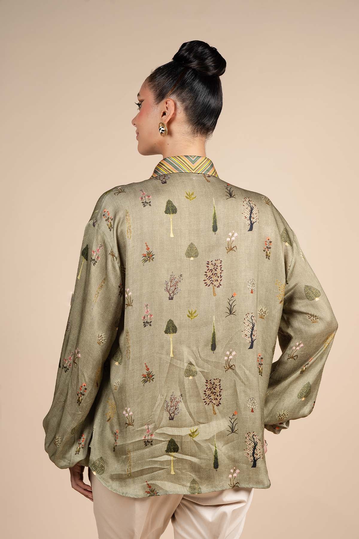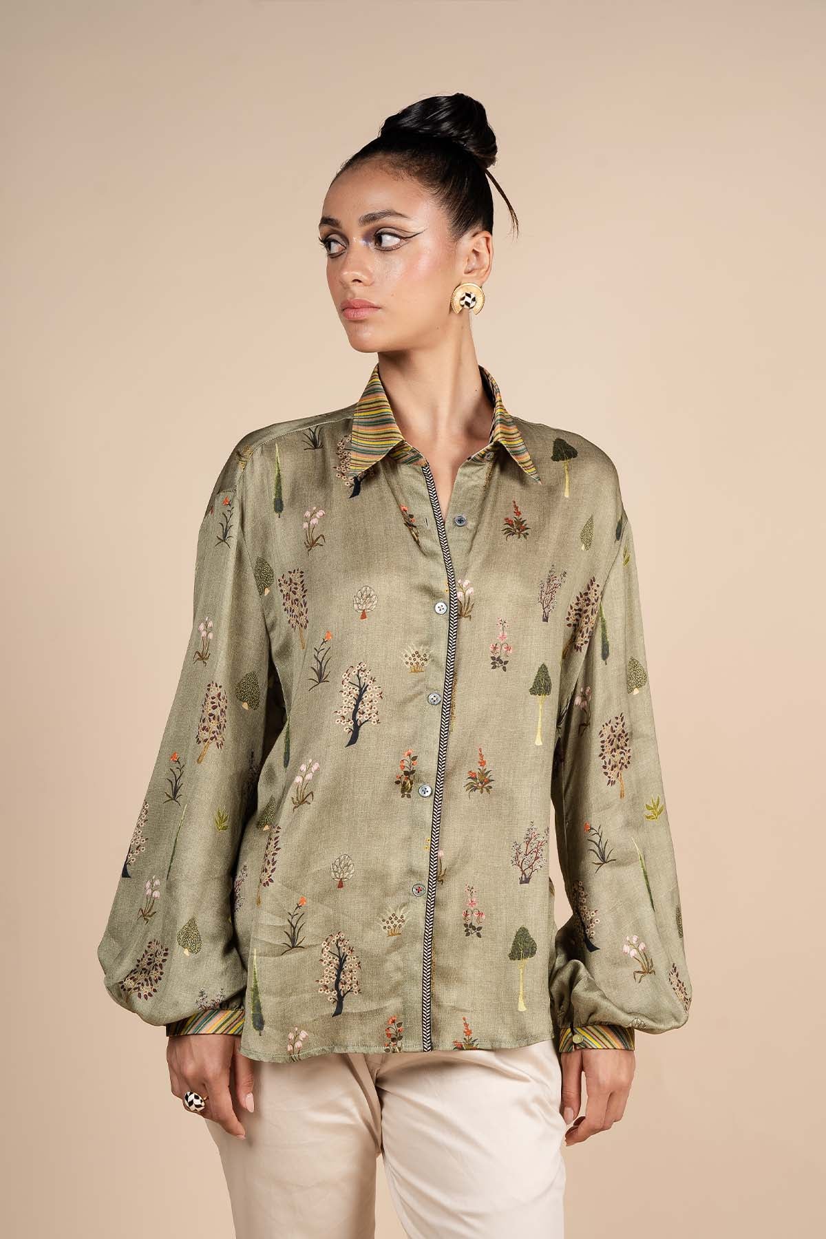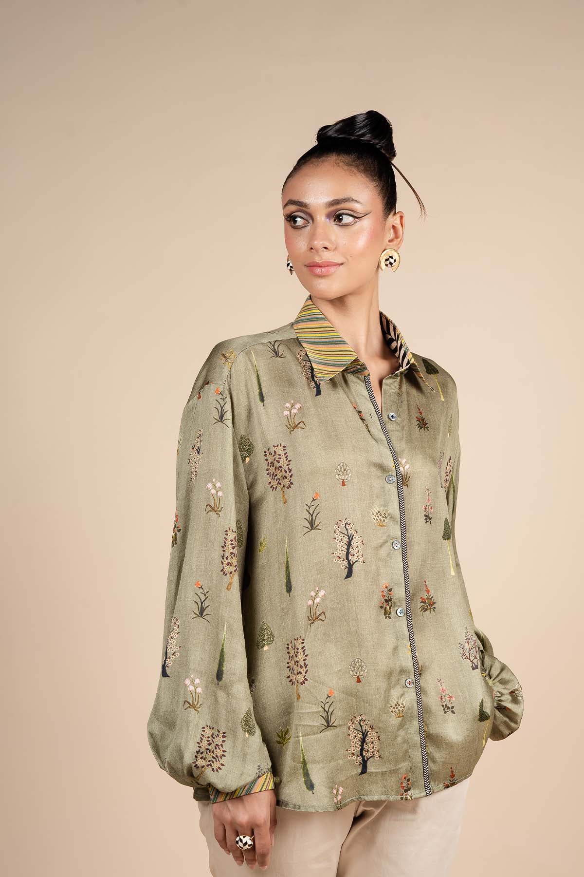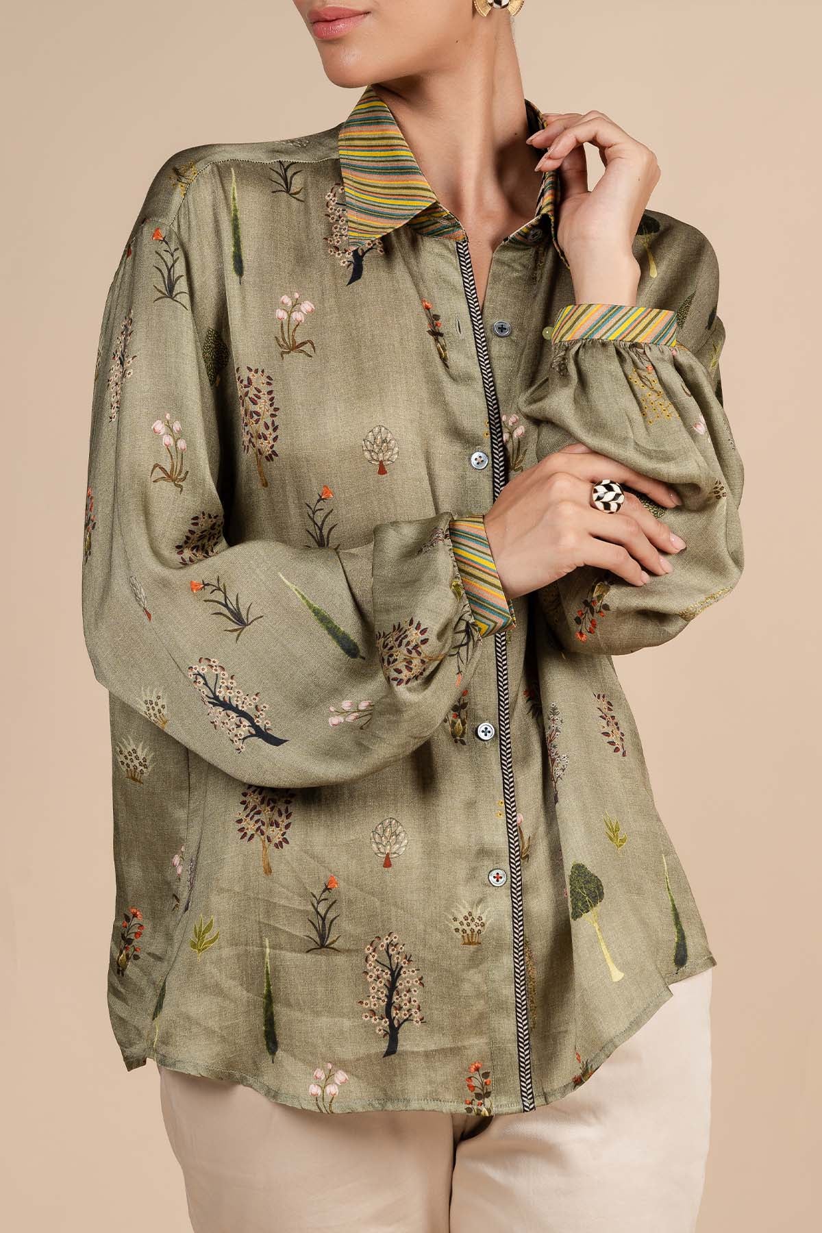The sage green shirt, crafted from bamberg viscose satin, features elegant bishop sleeves for a refined silhouette. Stunningly adorned with a delicate floral print, the shirt is elevated by multicoloured stripe details on the collar and cuffs, adding a bold, modern contrast.