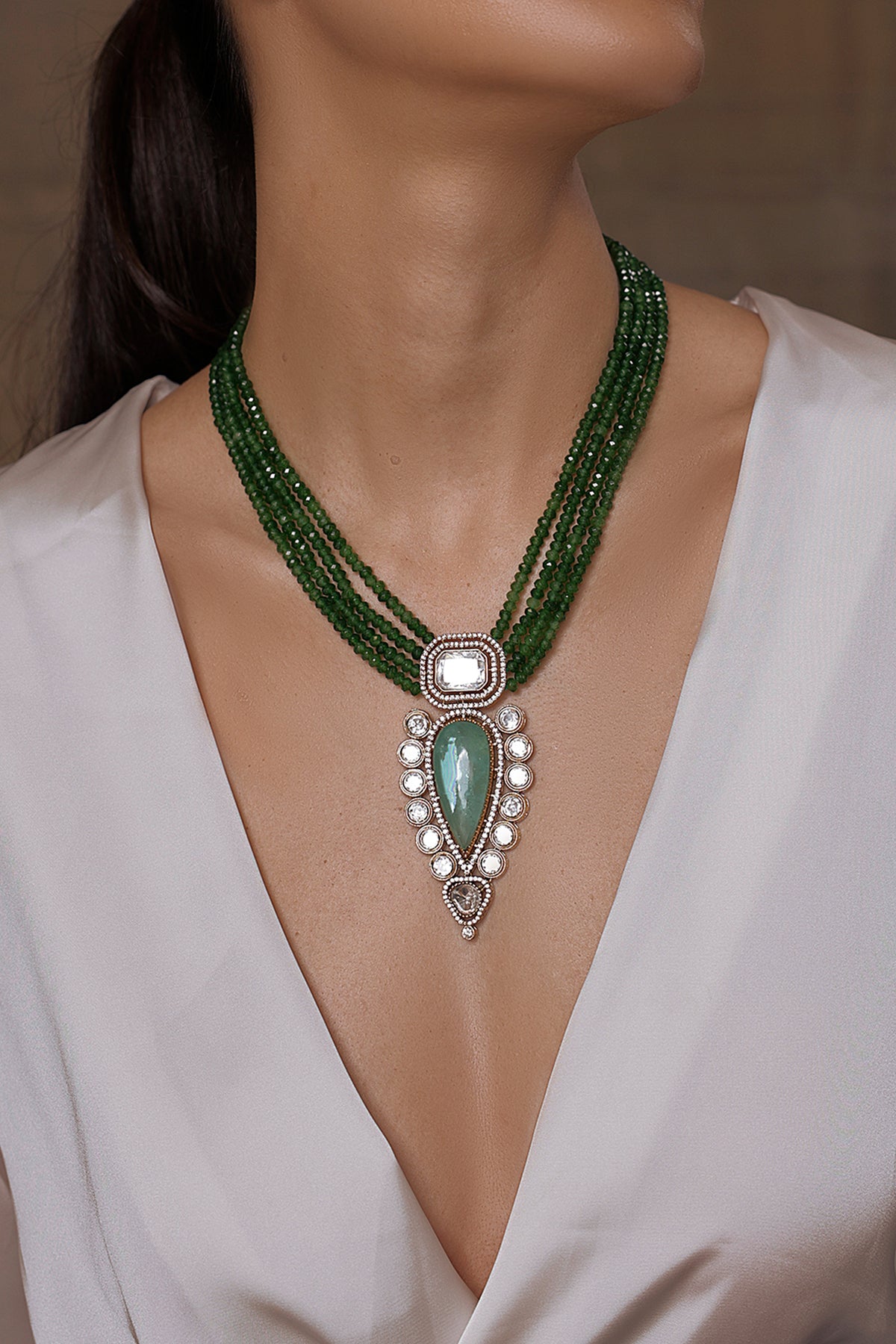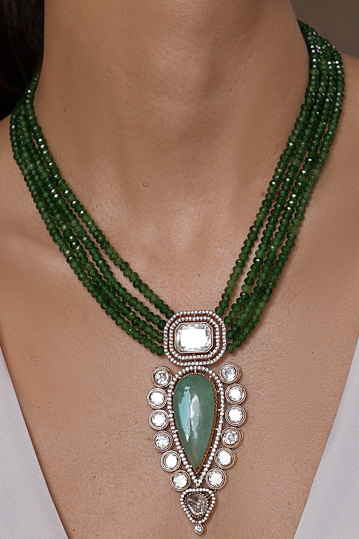 Adorn yourself with this exquisite necklace featuring deep green stones and polki accents. Its design fuses traditional elegance with a touch of contemporary grace, ideal for festive events